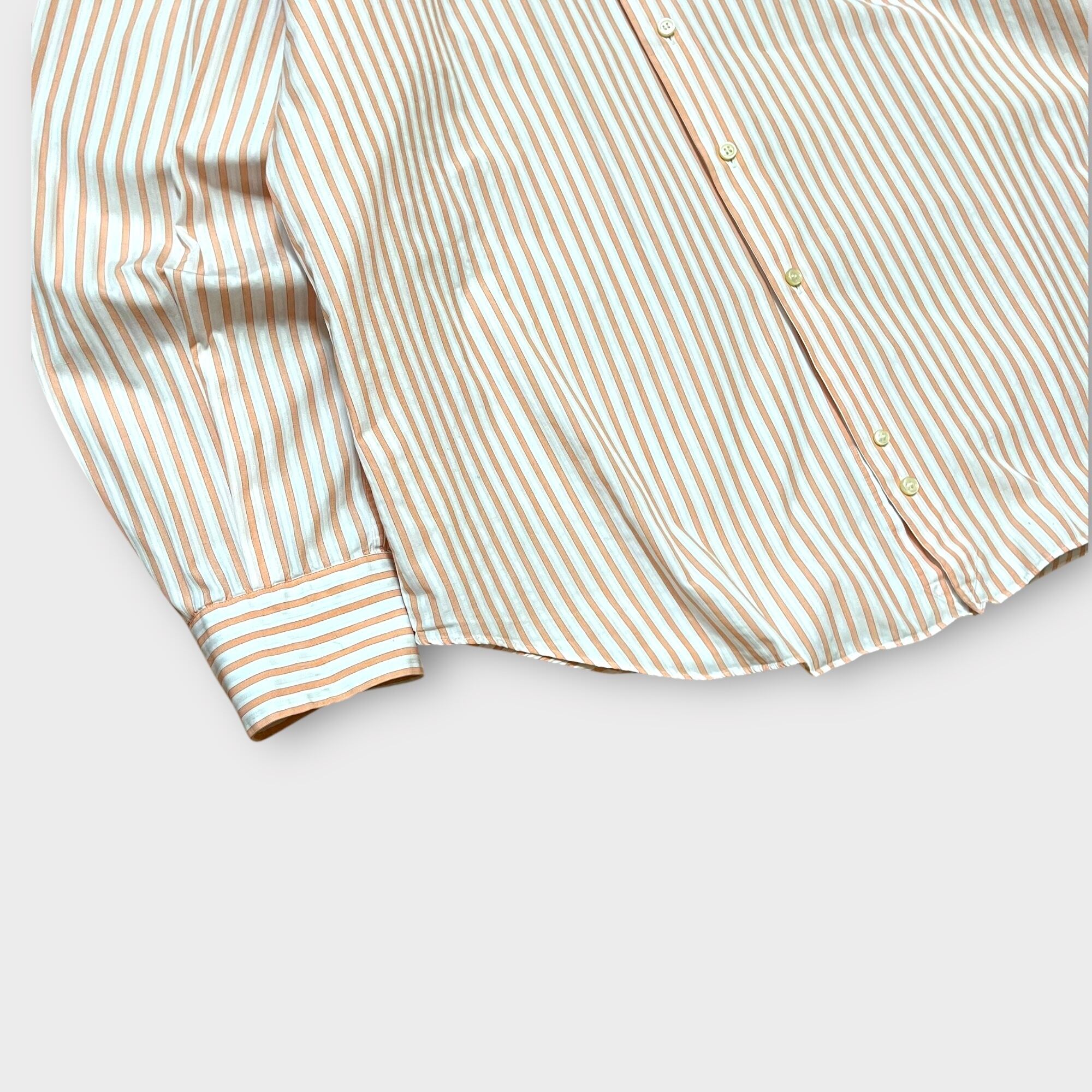 シンプルなホワイトとオレンジのストライプに胸ポケットにロゴの刺繍が入った1枚