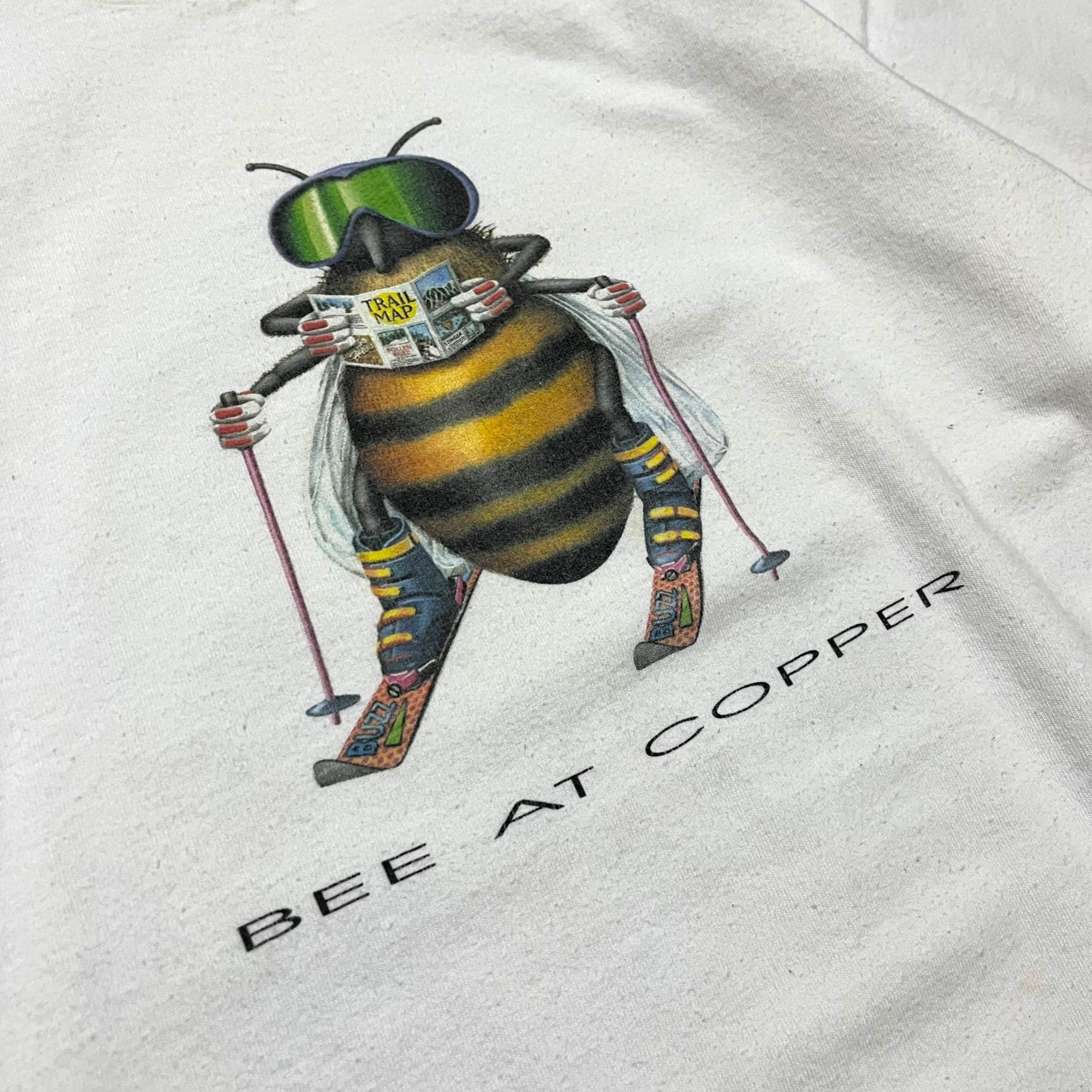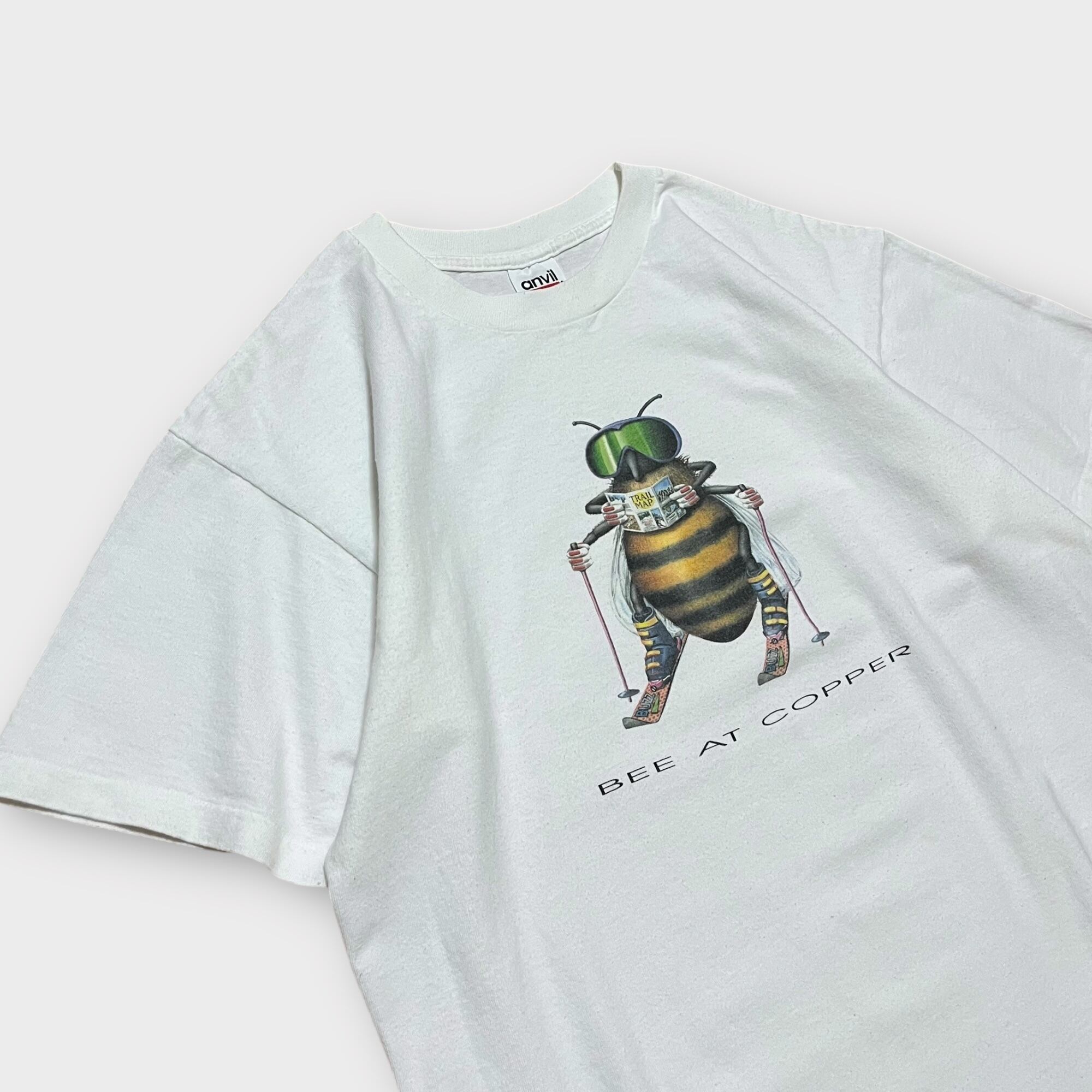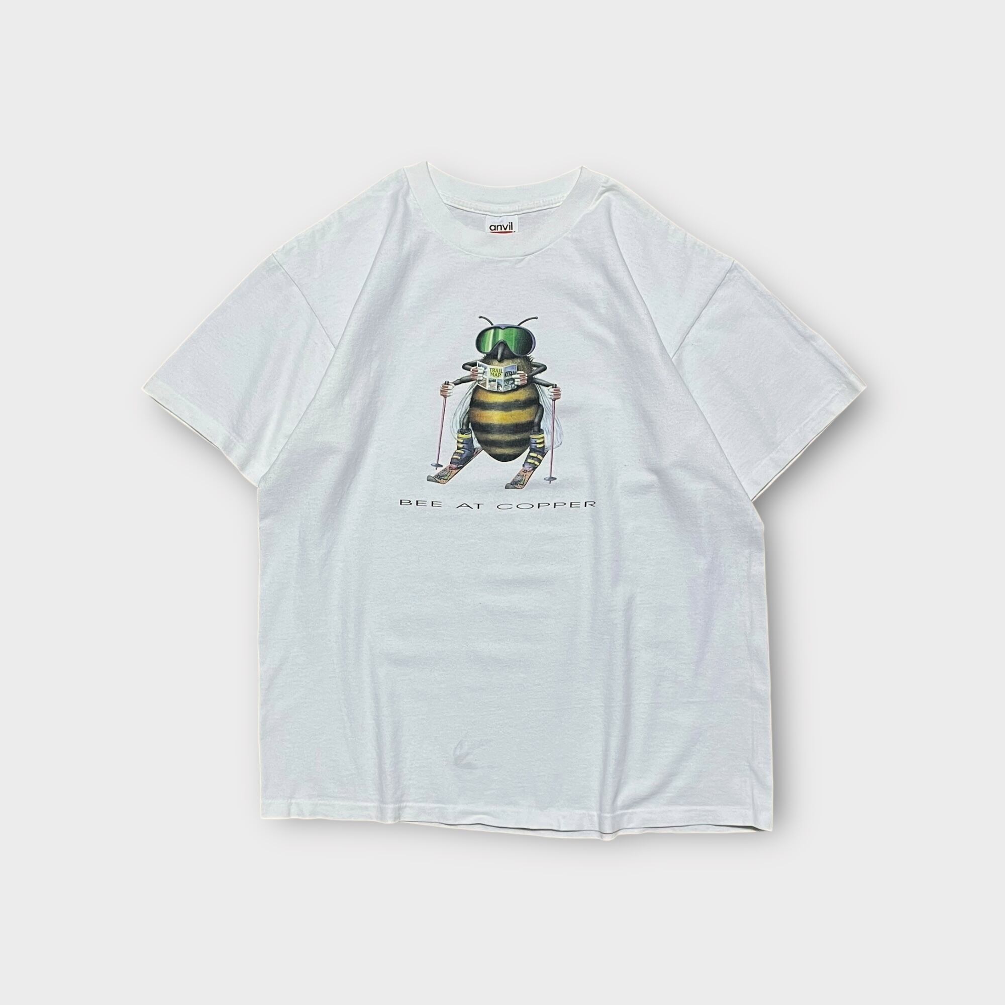 ハチがスキーをしながら地図を読むシュールなプリントのTシャツでなんとも言えない雰囲気が魅力的な1枚です。