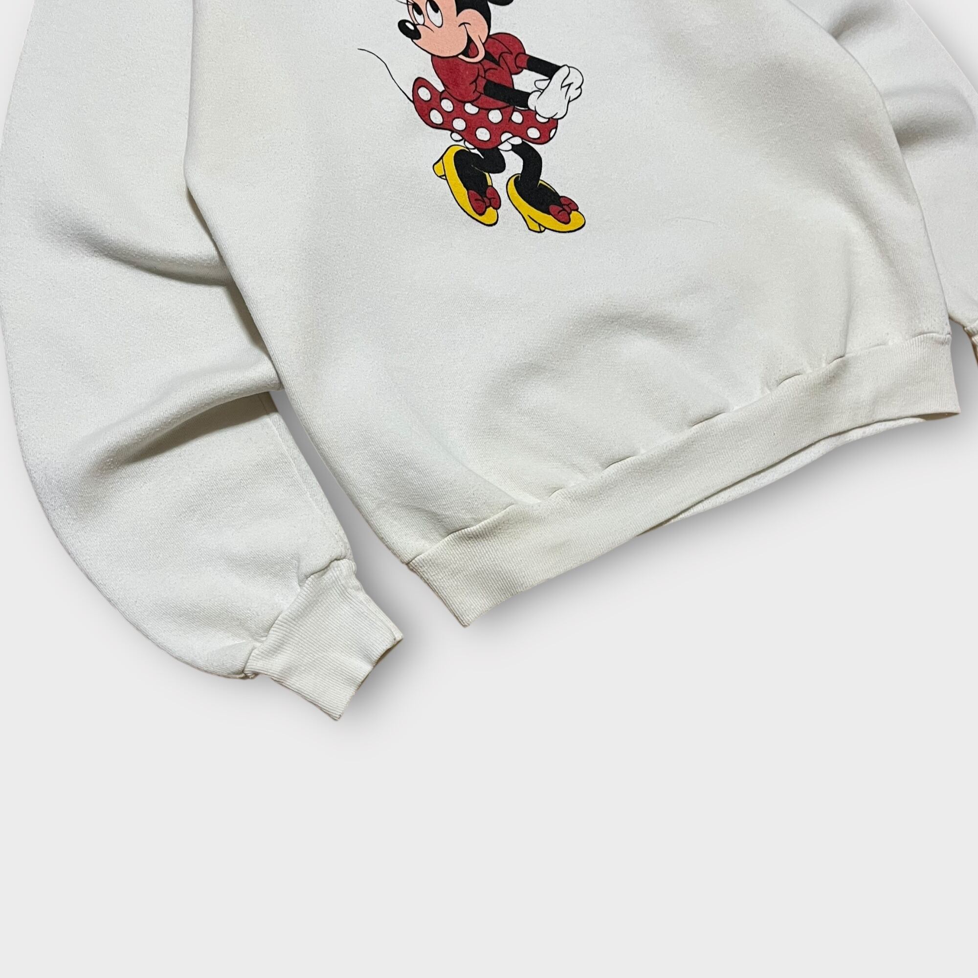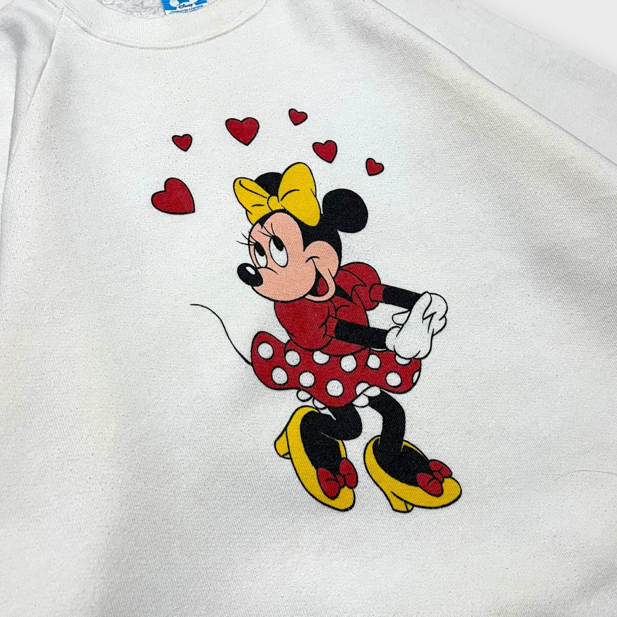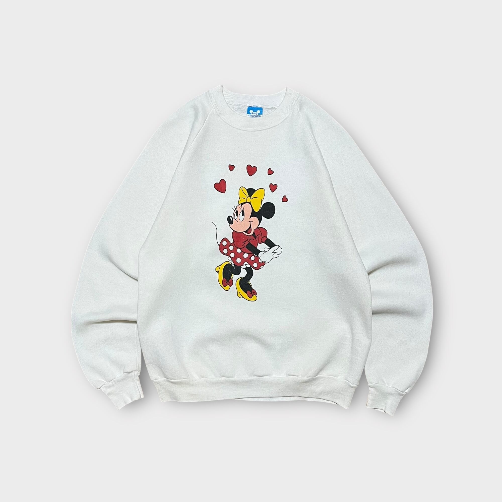 1980年代のUSA製ヴィンテージスウェットシャツ。ラグランスリーブ仕様で、フロントには可愛らしいミニーのプリントが施されたデザイン。程よい厚みの生地感で、ヴィンテージらしい風合いが魅力。使用感とシミが見られるため、古着の味を楽しめる方におすすめの一着です。