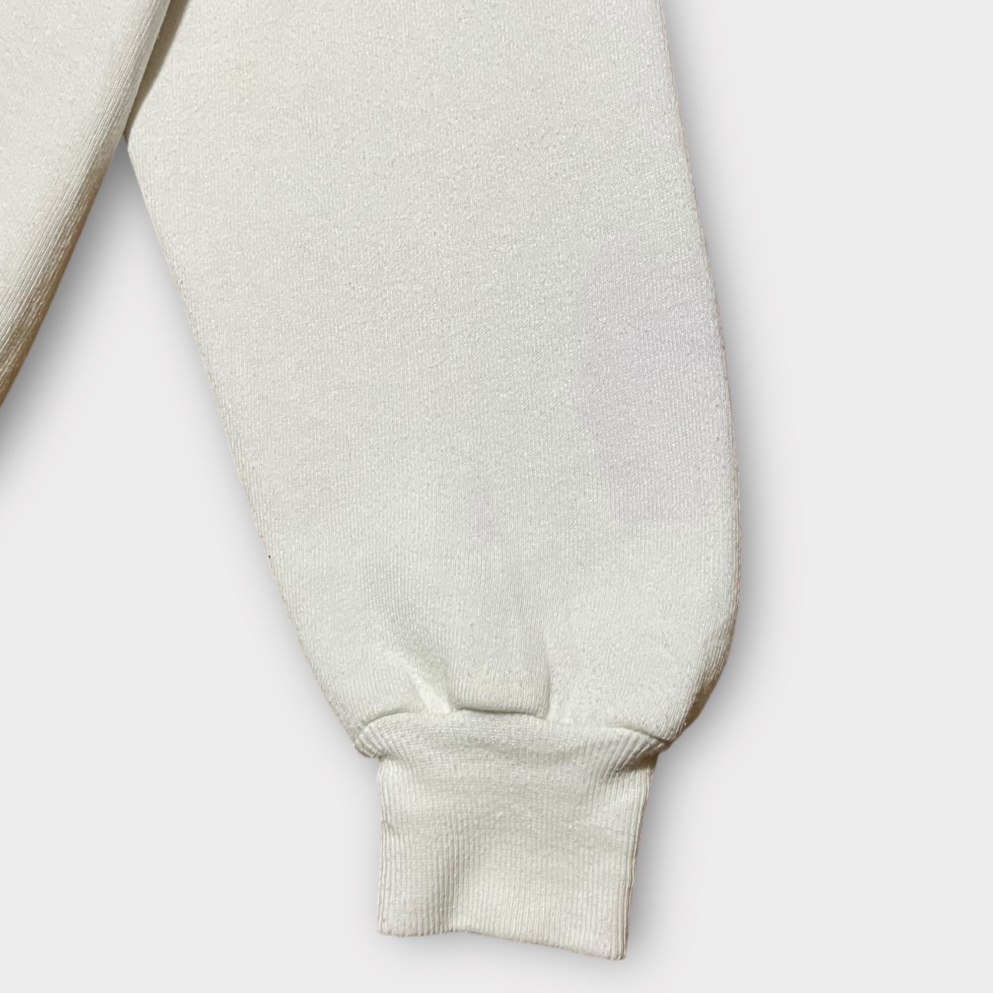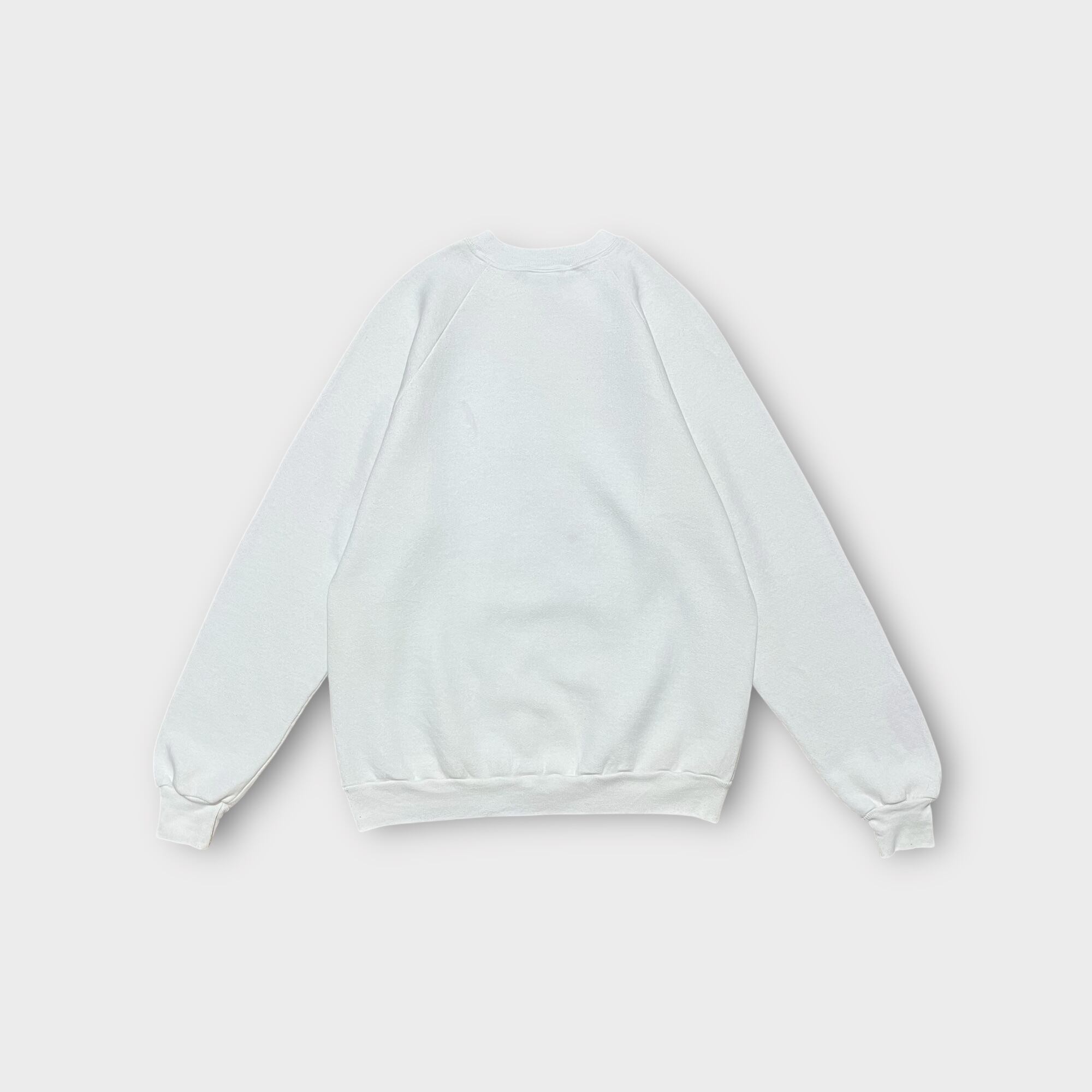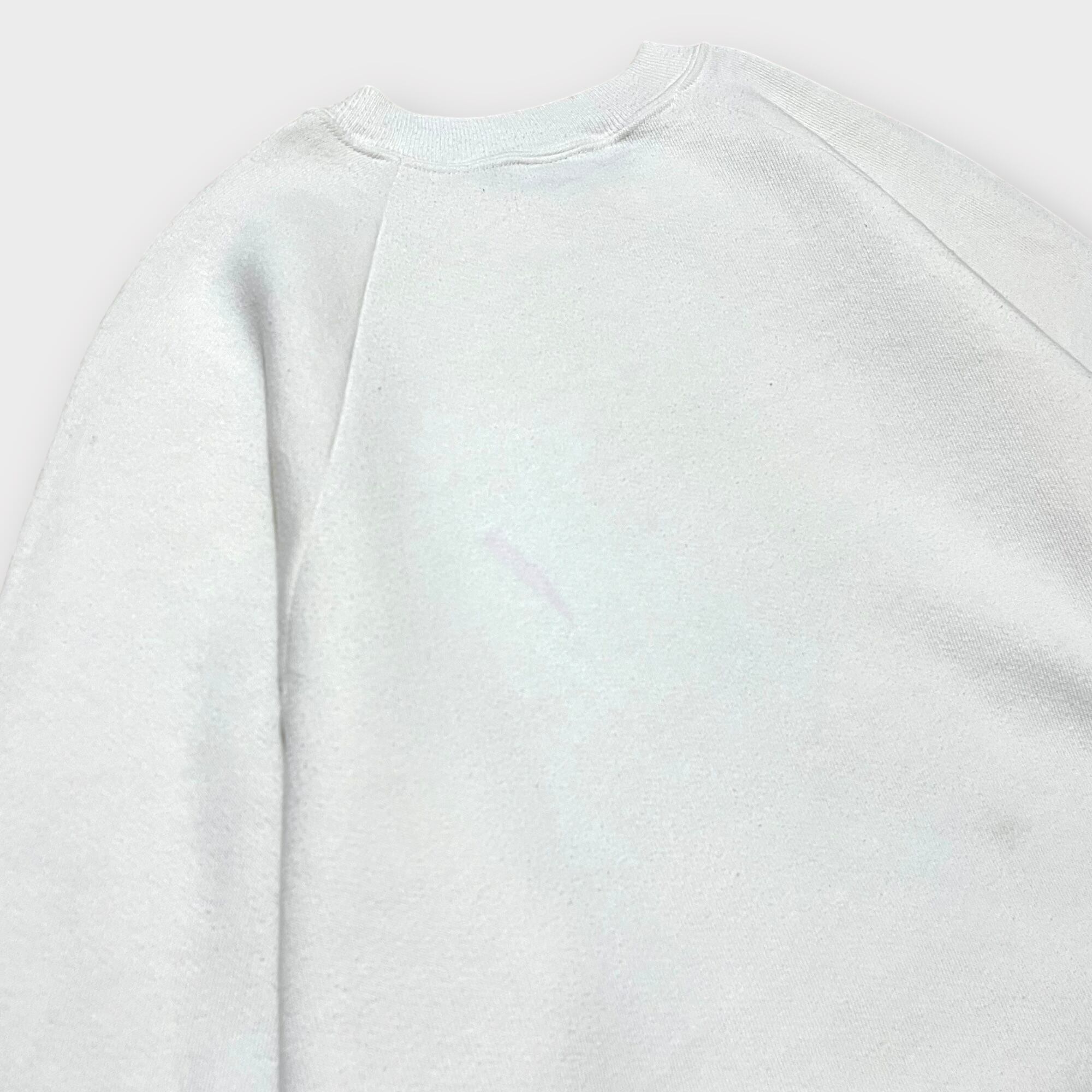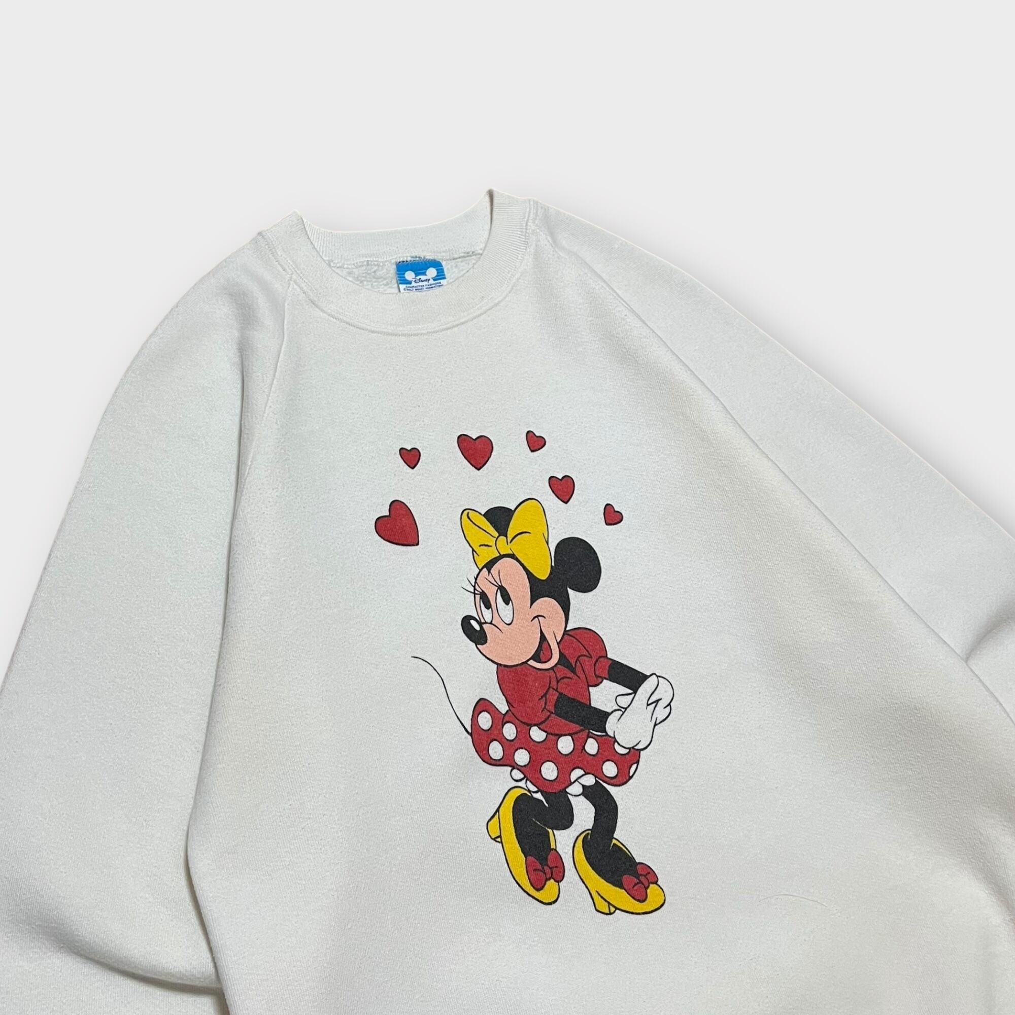 1980年代のUSA製ヴィンテージスウェットシャツ。ラグランスリーブ仕様で、フロントには可愛らしいミニーのプリントが施されたデザイン。程よい厚みの生地感で、ヴィンテージらしい風合いが魅力。使用感とシミが見られるため、古着の味を楽しめる方におすすめの一着です。
