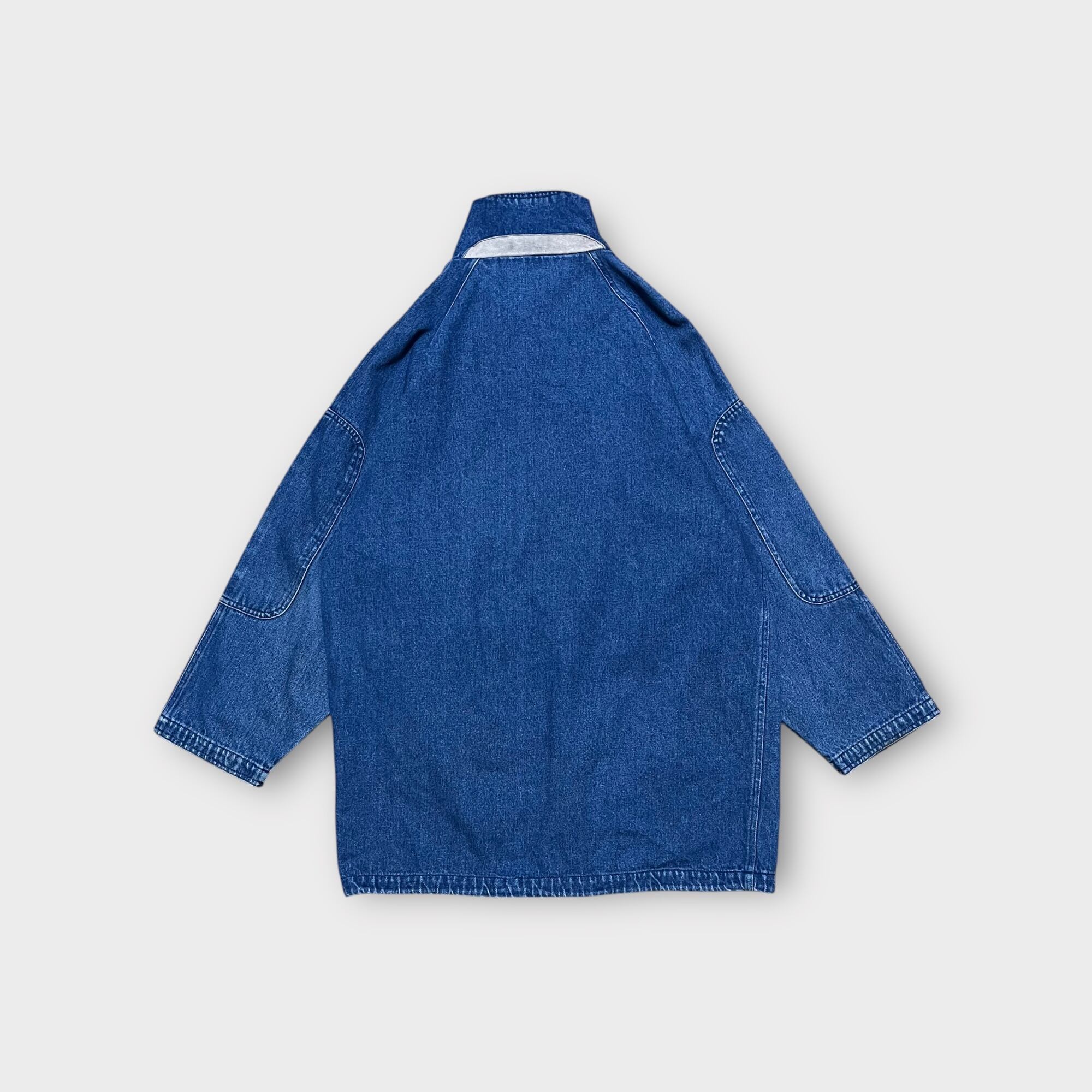 ゆったりとしたシルエットが魅力のデニムジャケット。ハイネック仕様とラグランスリーブで動きやすく、カジュアルながら洗練された雰囲気を演出。大きめのフラップポケットや裾のドローコードがデザインのアクセントに。ヴィンテージならではの風合いを楽しめる一着です。