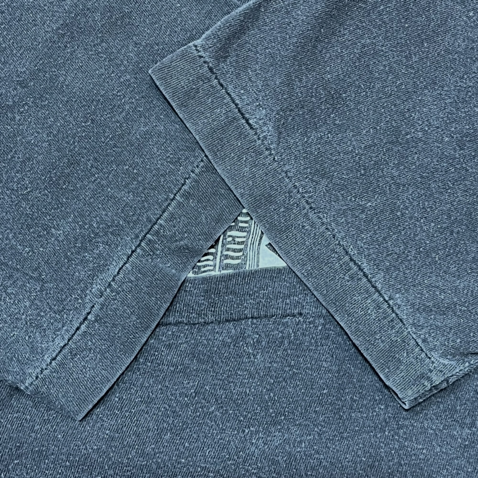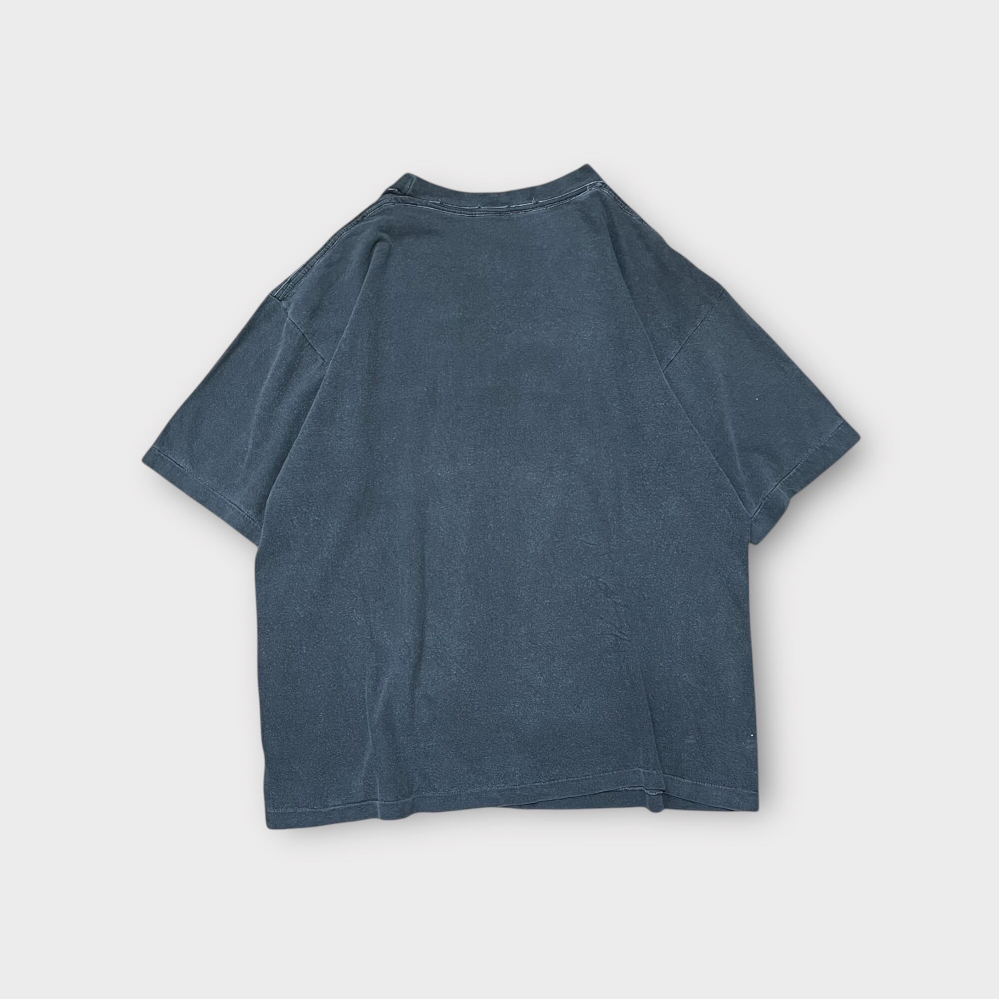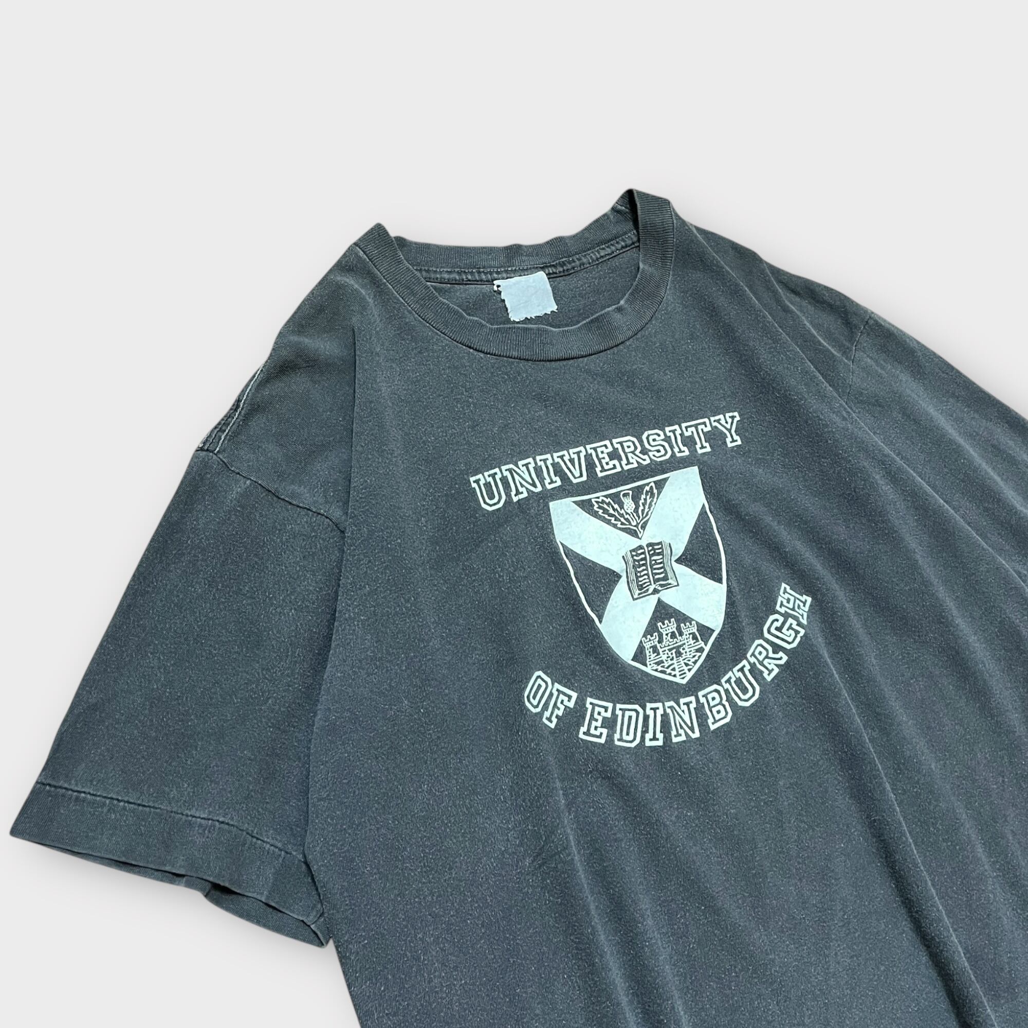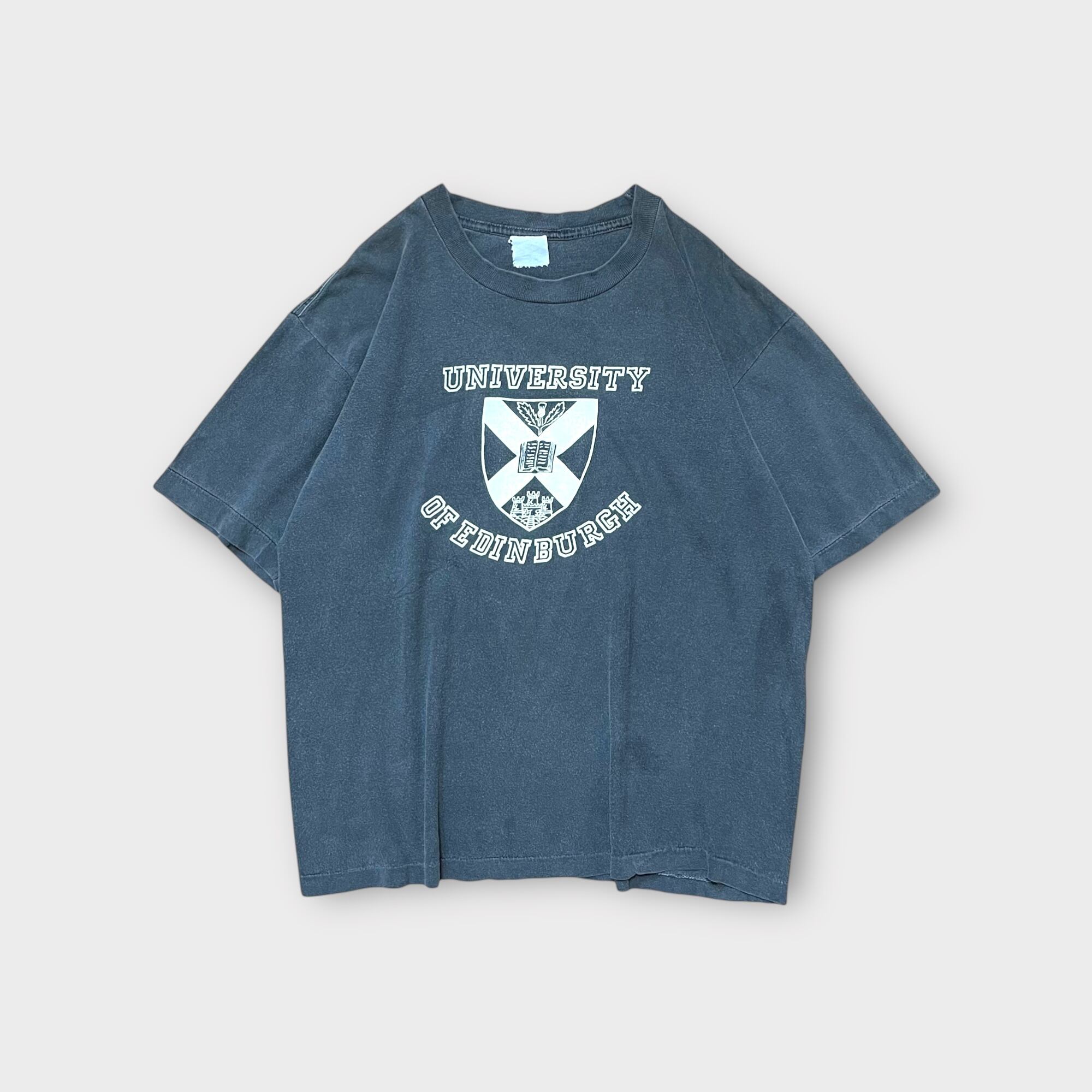 1980年代頃のヴィンテージTシャツ。エディンバラ大学のプリントが施されたクラシックな一枚です。全体的にフェードがかかったブラックカラーが特徴で、古着らしい雰囲気が魅力的。シングルステッチ仕様で、経年による風合いが際立ちます。タグが欠損しているため、ブランドやサイズの詳細は不明ですが、抜群に雰囲気の良い1枚です。