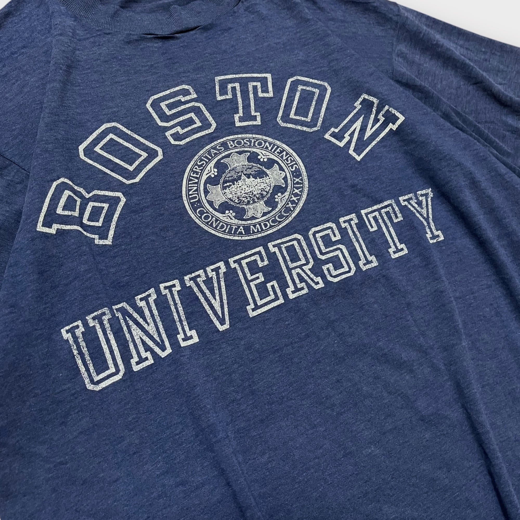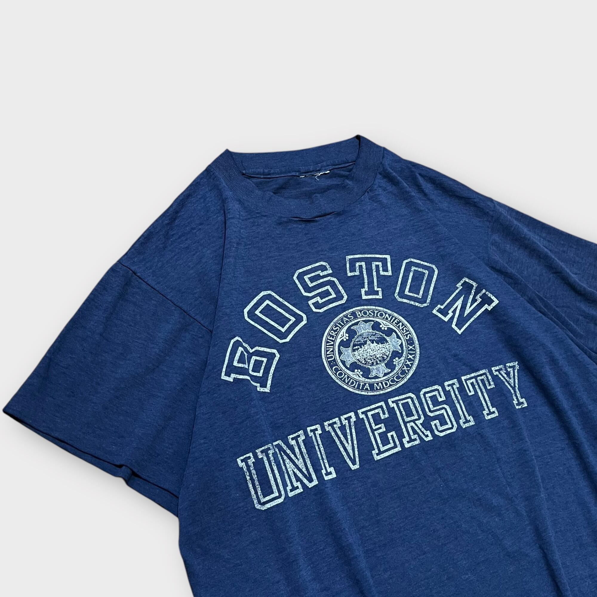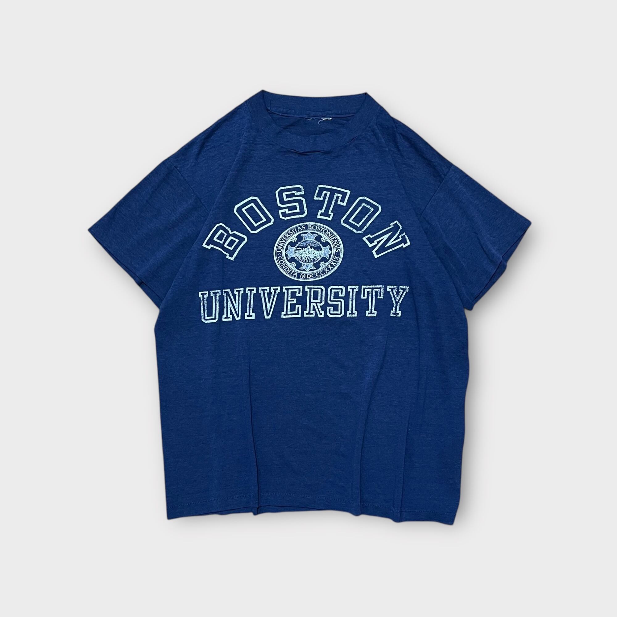 1980年代頃のヴィンテージTシャツ。ボストン大学のカレッジプリントが施されたクラシックなデザイン。コットンとポリエステルの混紡素材で、柔らかく肌馴染みの良い「テロテロ」な質感が特徴です。袖・裾はシングルステッチ仕様で、ヴィンテージならではのディテールが楽しめます。