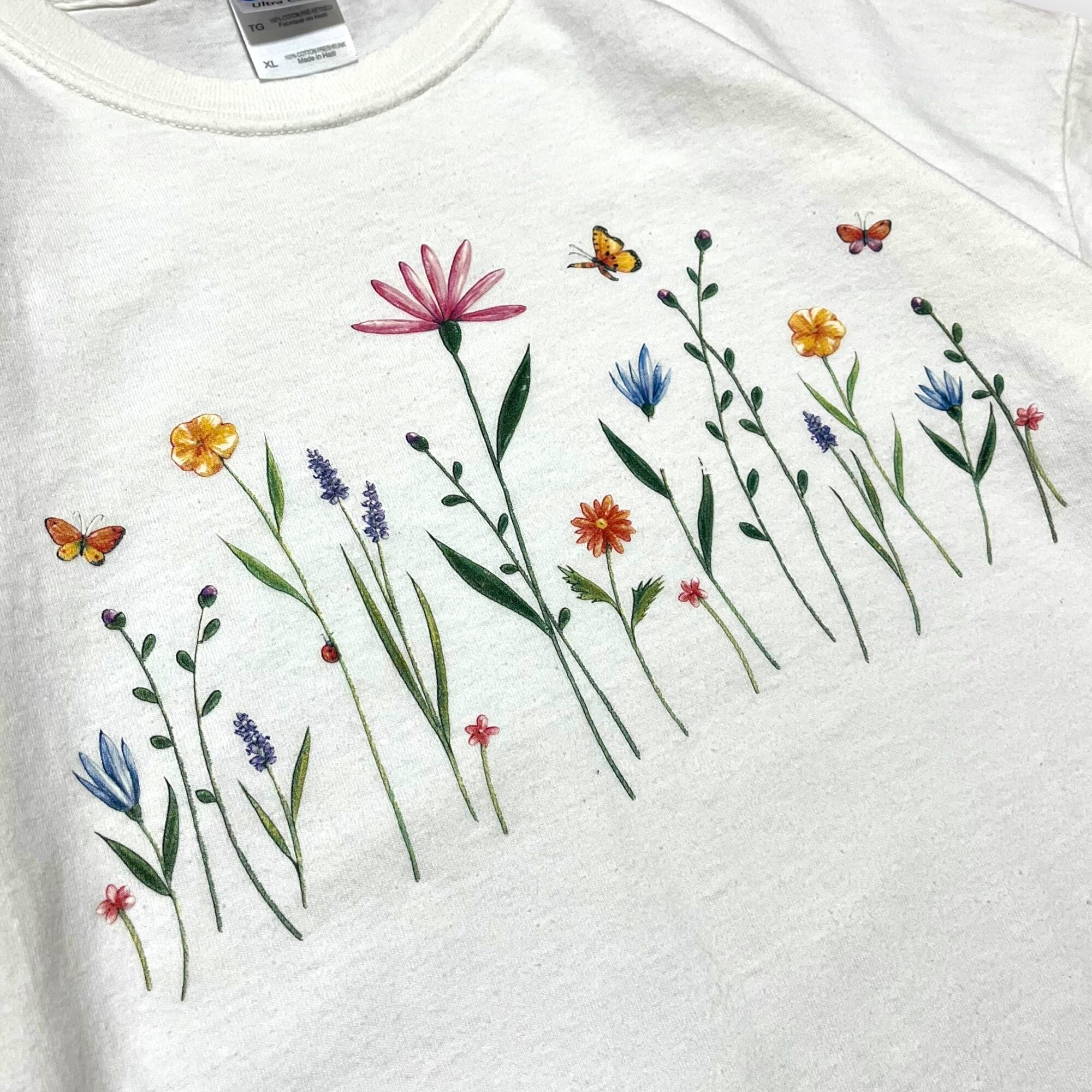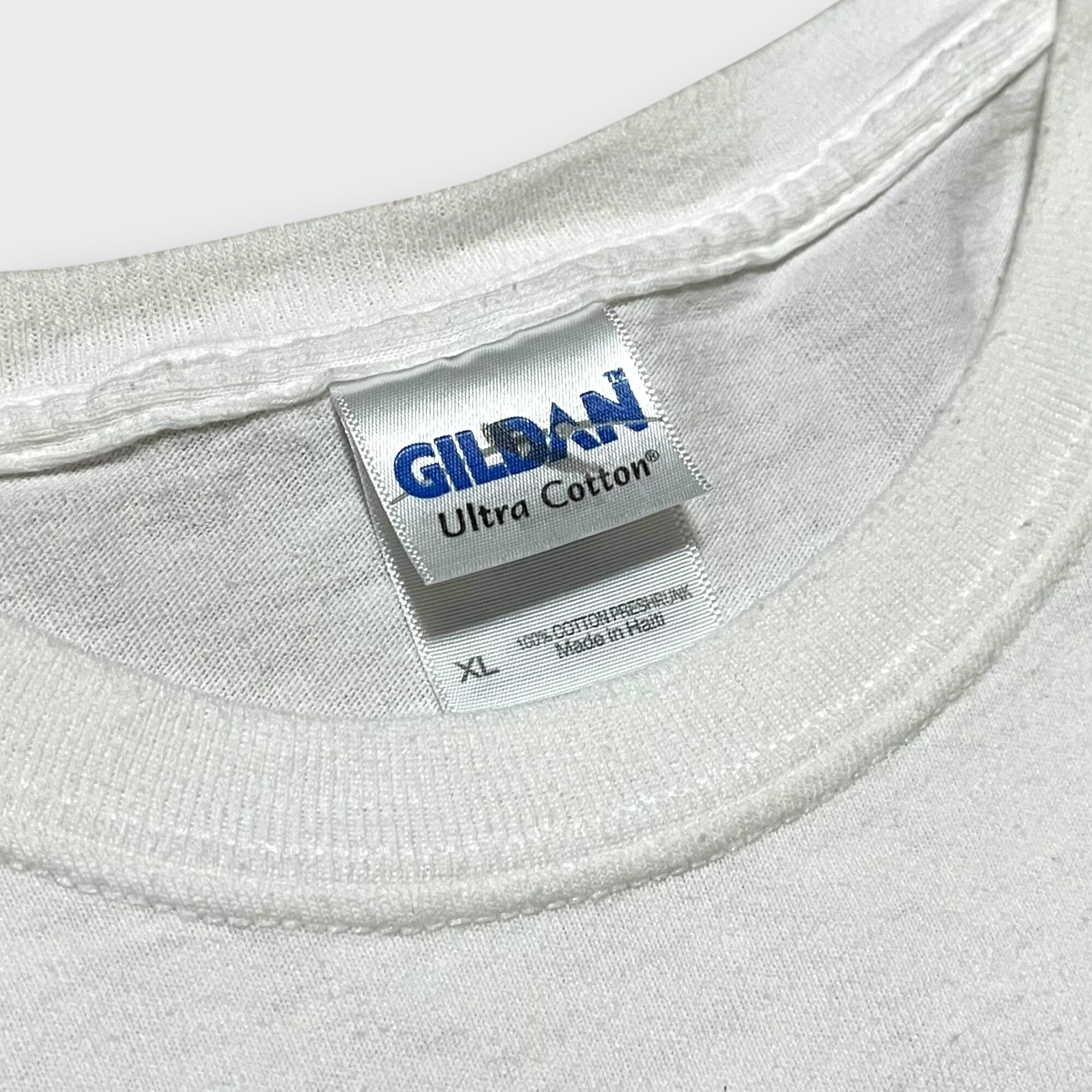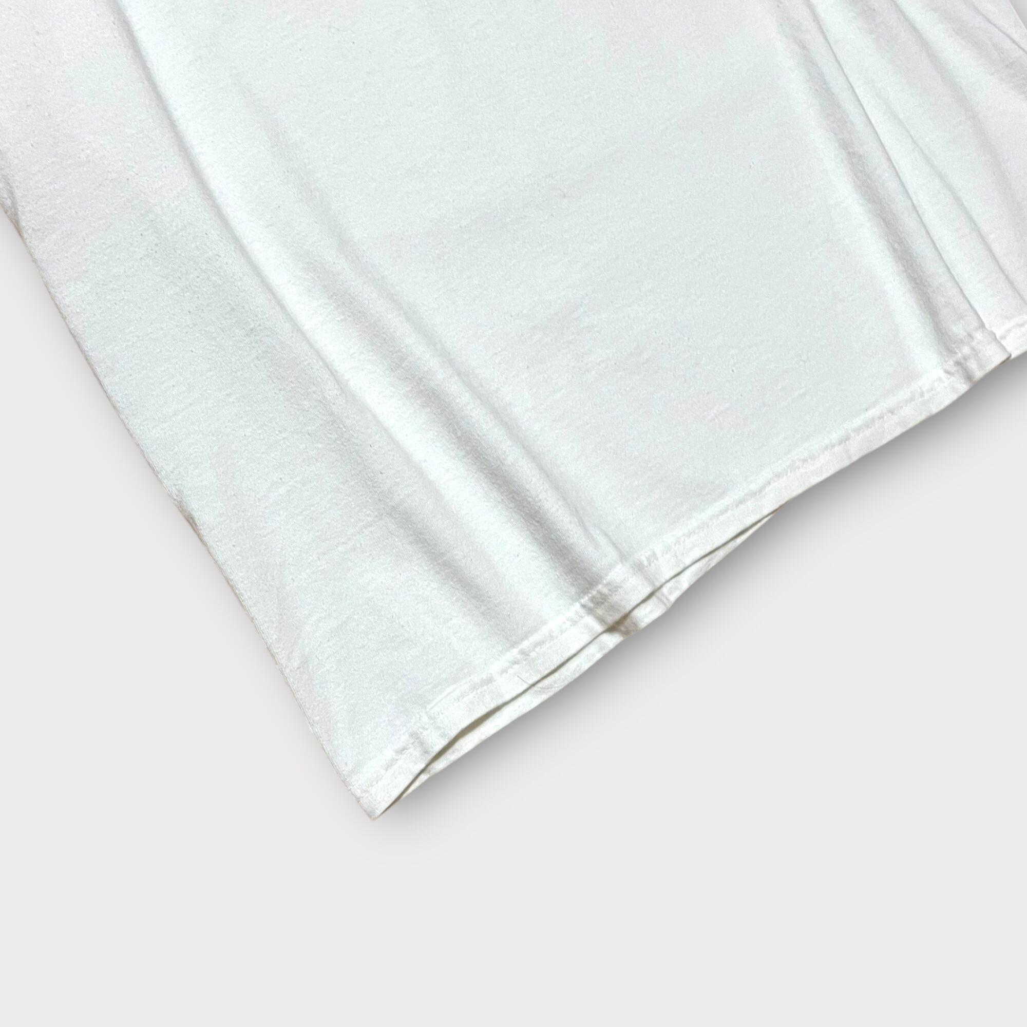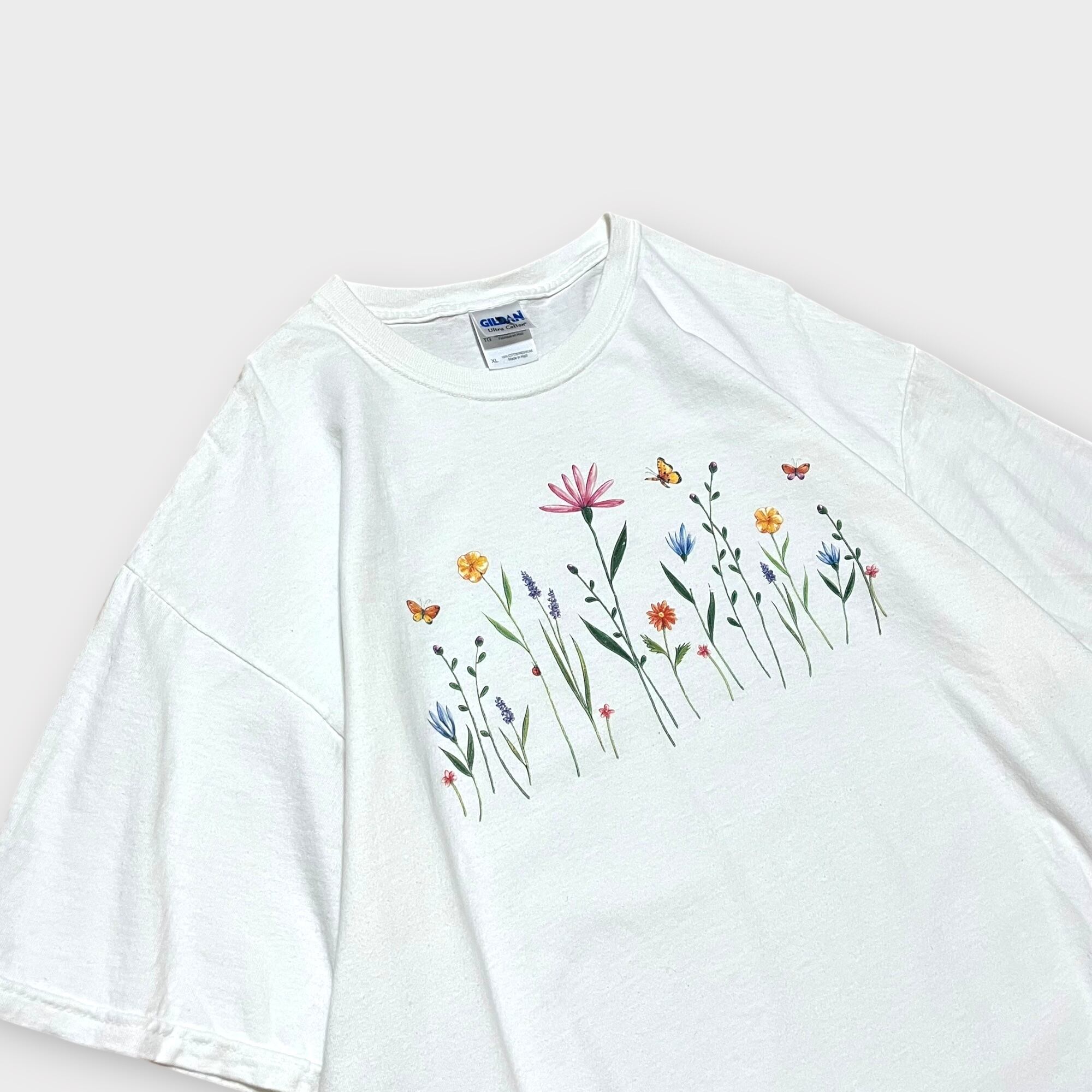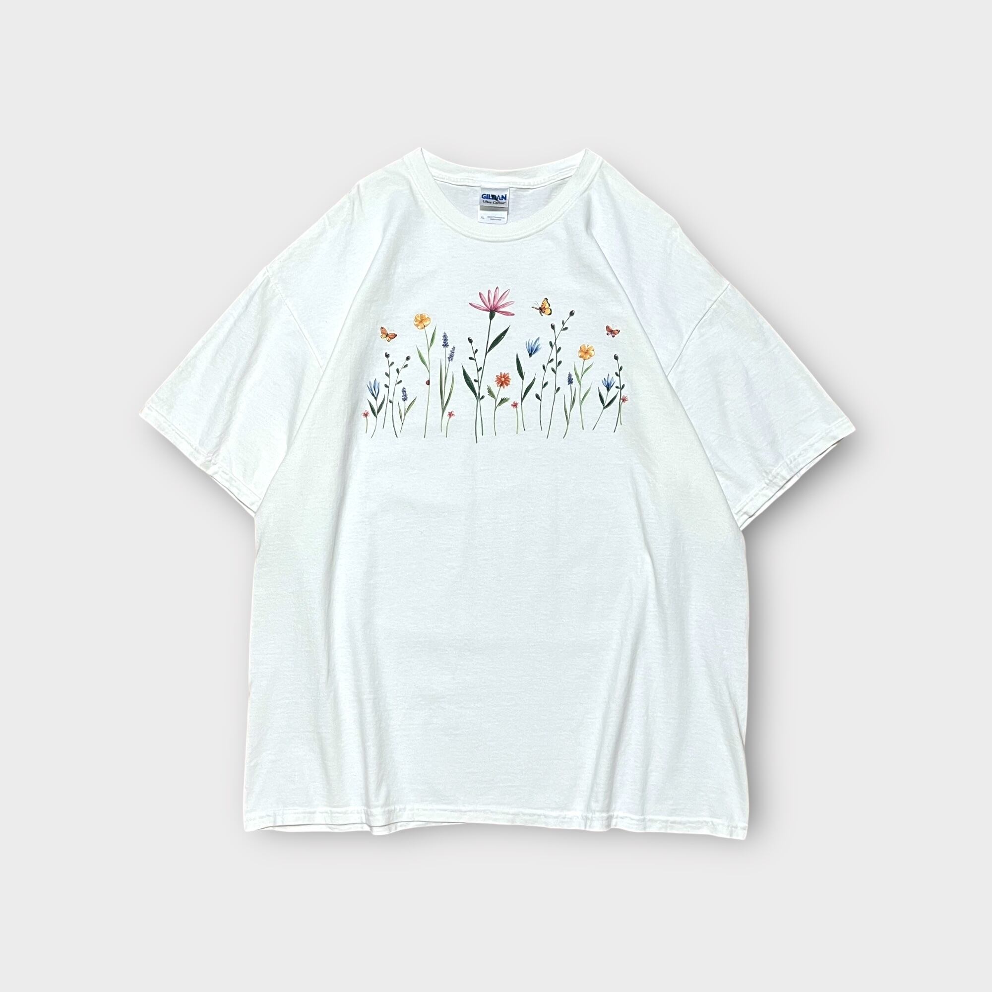 2000年代のGILDAN製Tシャツで、シンプルなホワイトボディにフラワー、蝶、てんとう虫のプリントが施されたデザインが特徴です。このプリントは、自然の要素を取り入れたカラフルで美しいデザインで、視覚的に華やかさを加えています。シンプルながらも個性を感じさせ、春や夏のコーディネートにぴったりのアイテムです。