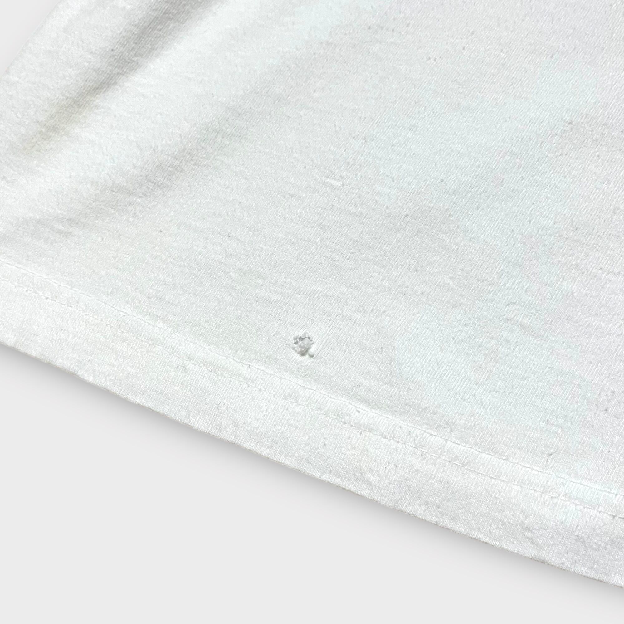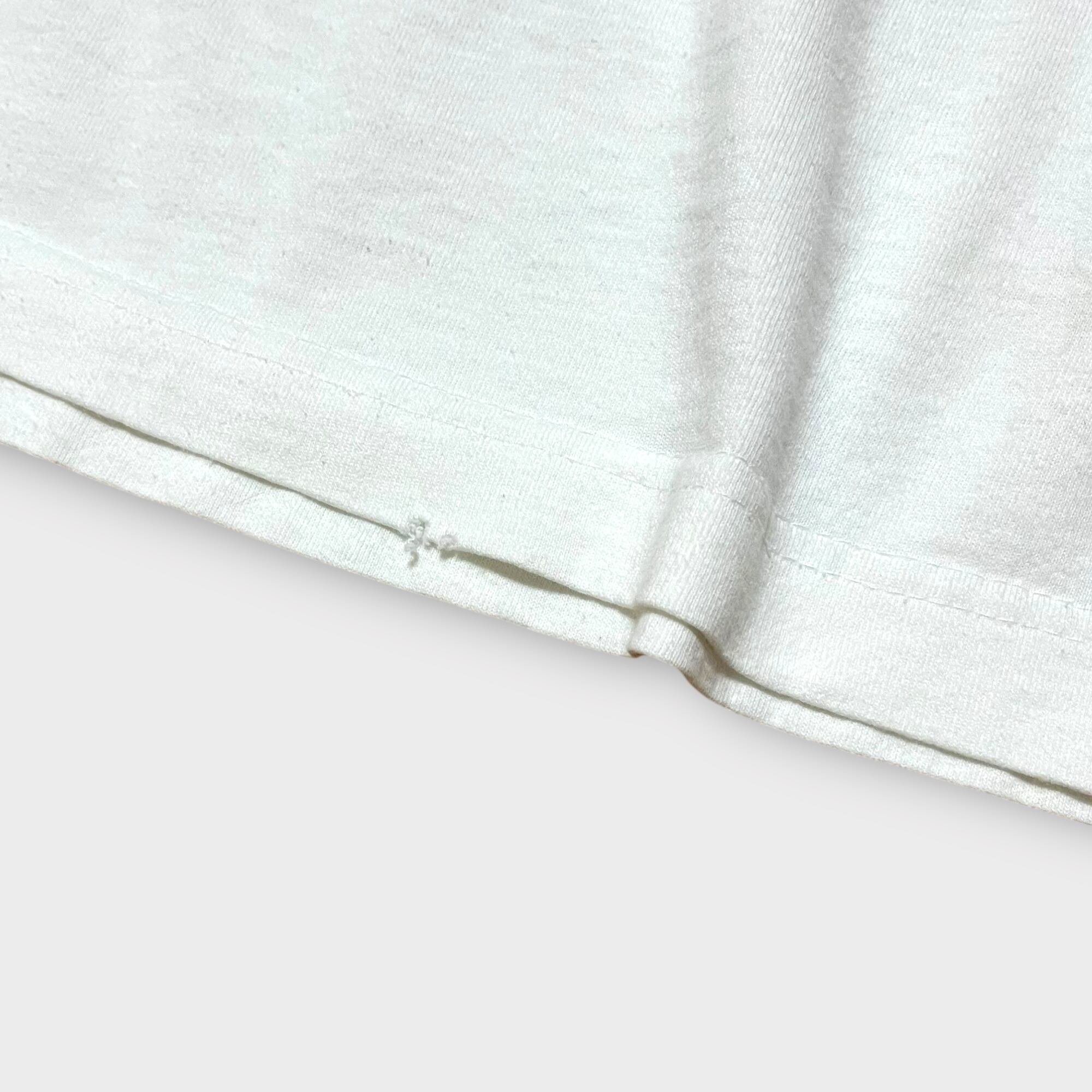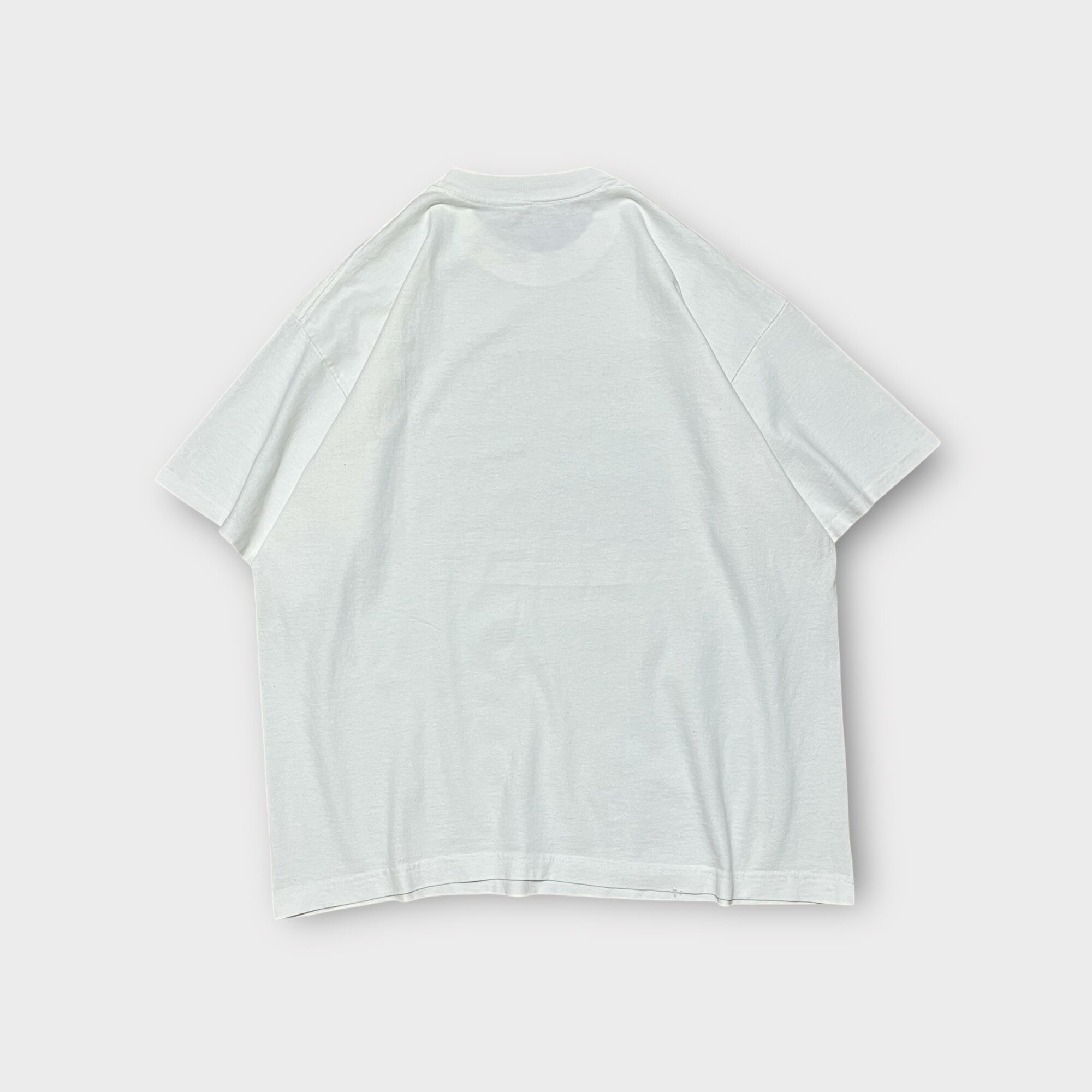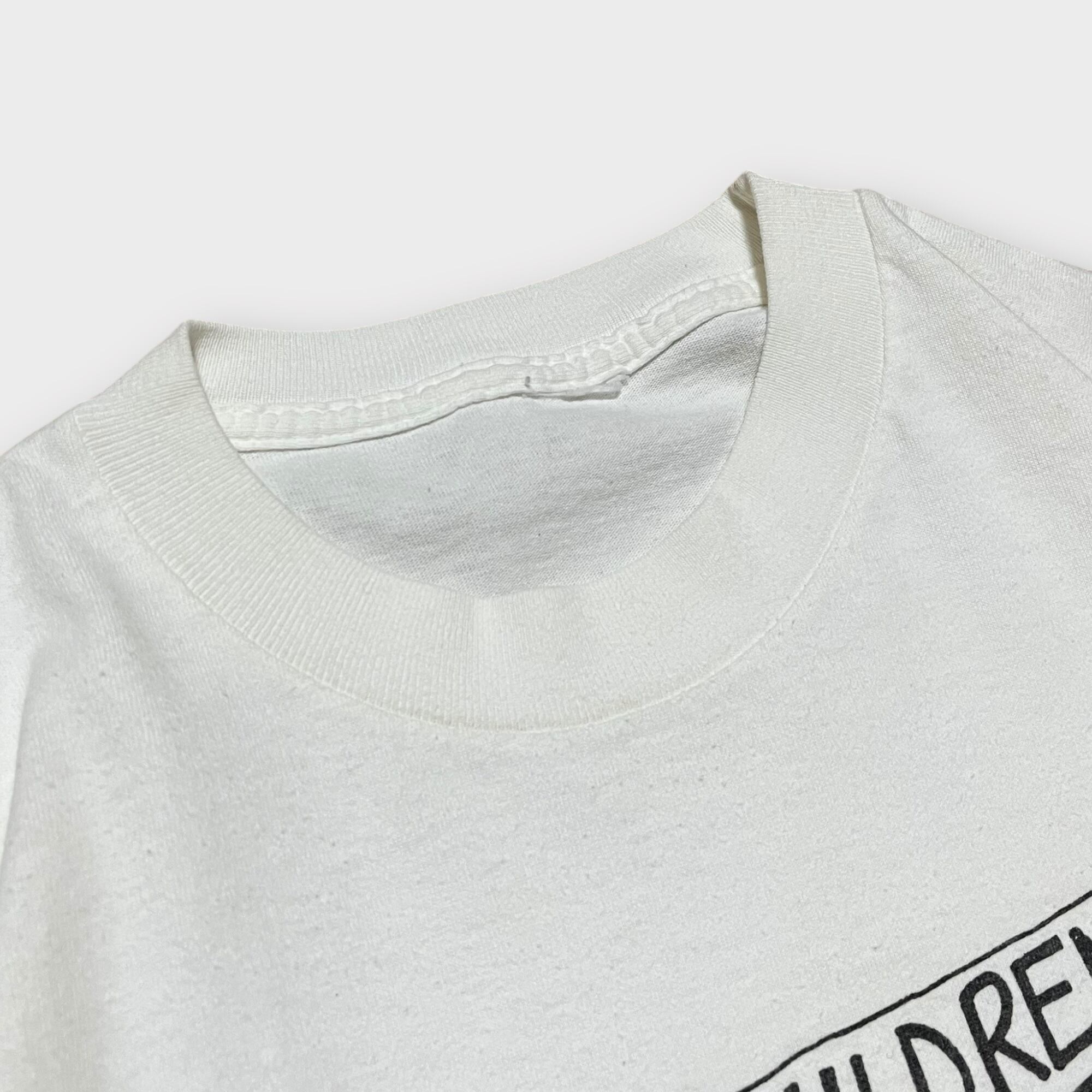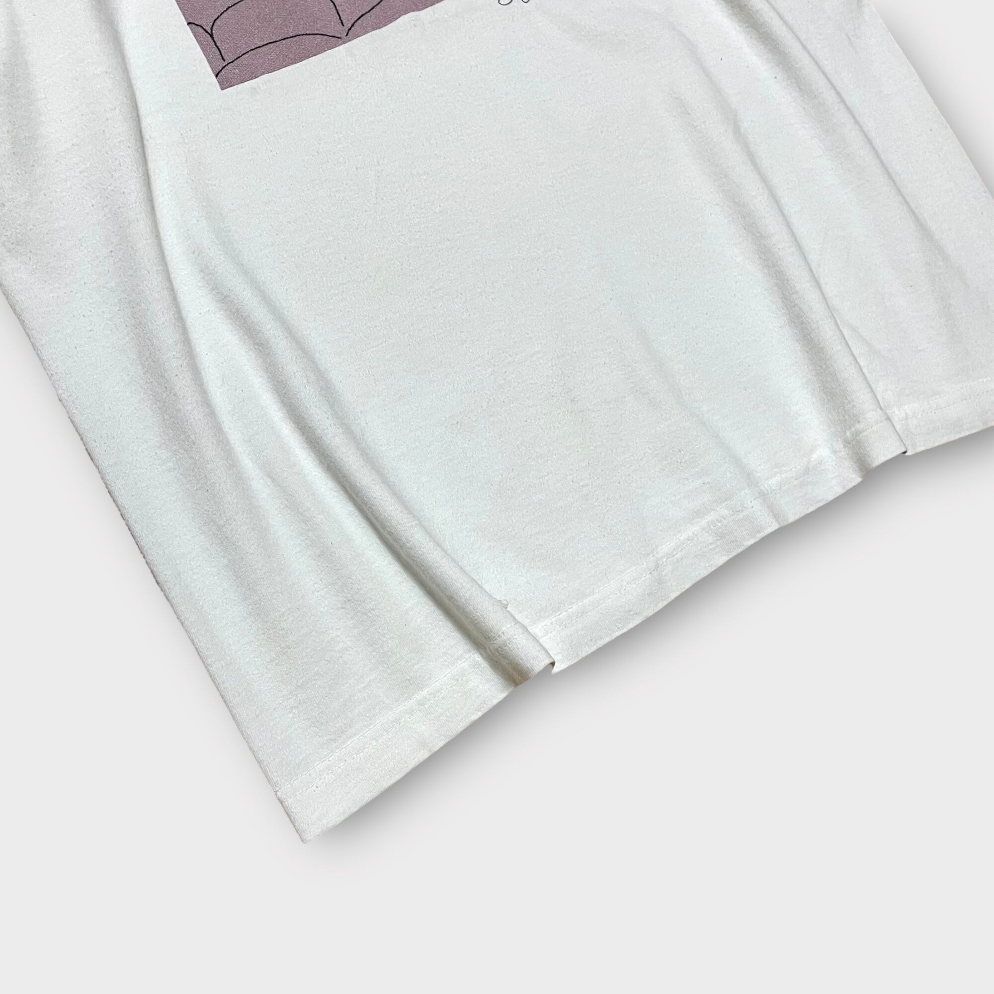 1989年のコピーライトが施されたヴィンテージのプリントTシャツです。ホワイトボディに映画館をモチーフにしたシュールなキャラクタープリントが特徴的で、独特のデザインが魅力です。袖はシングルステッチ仕様。裾に小さな穴と切れがありますが、その分ヴィンテージ感が増し、味わい深いアイテムです。ヴィンテージの風合いを楽しむことができる、ユニークな一着です。