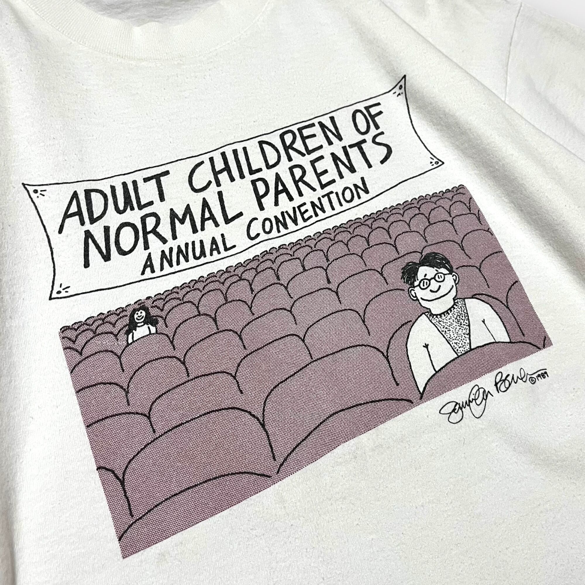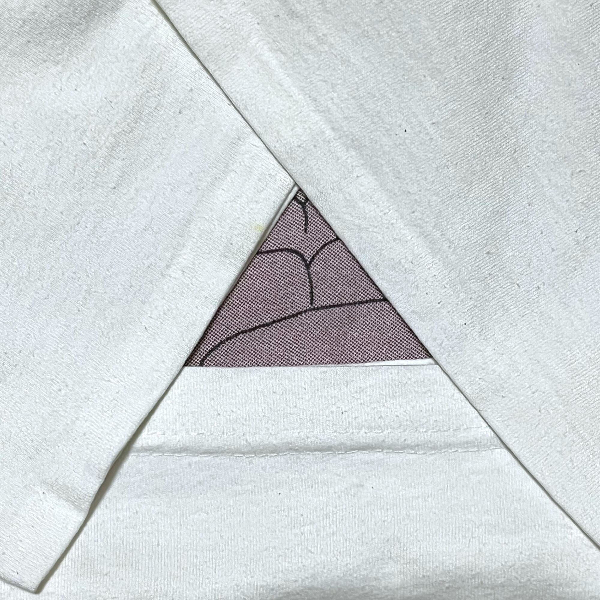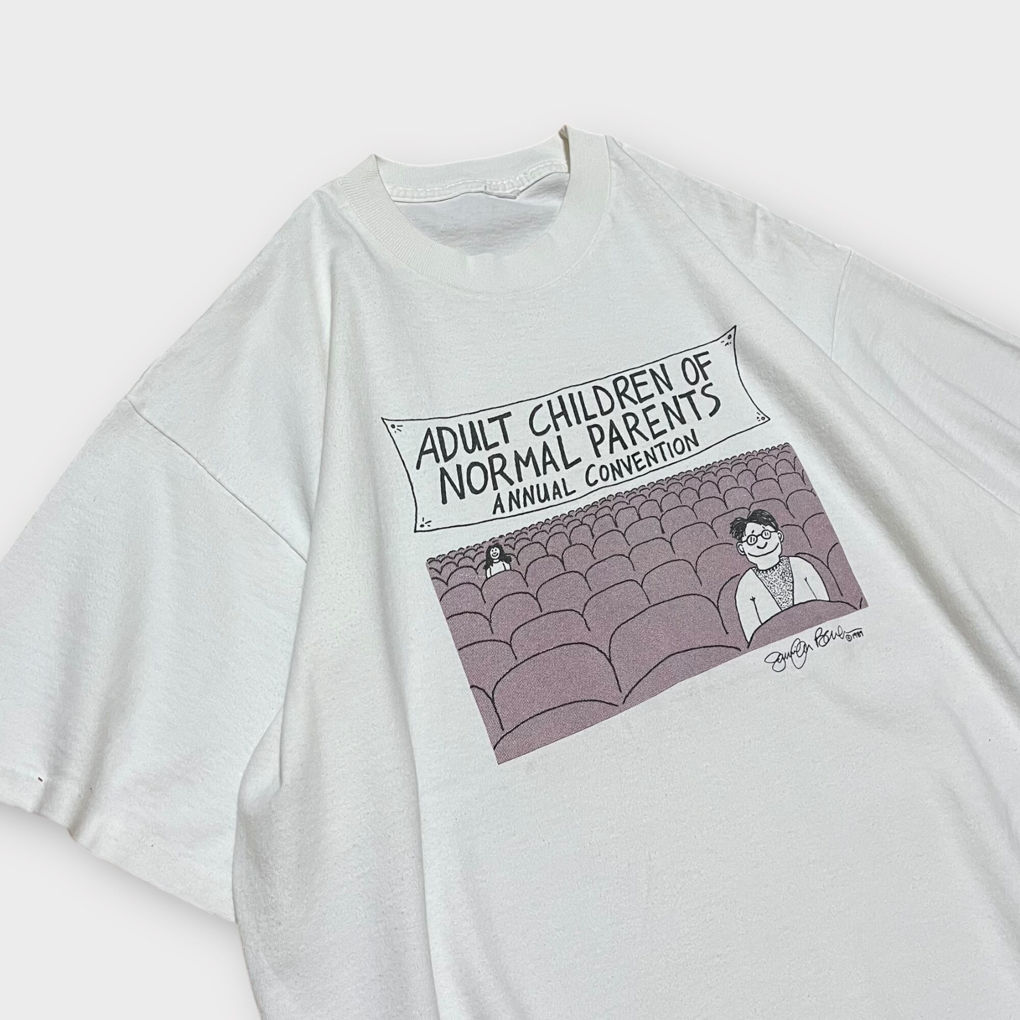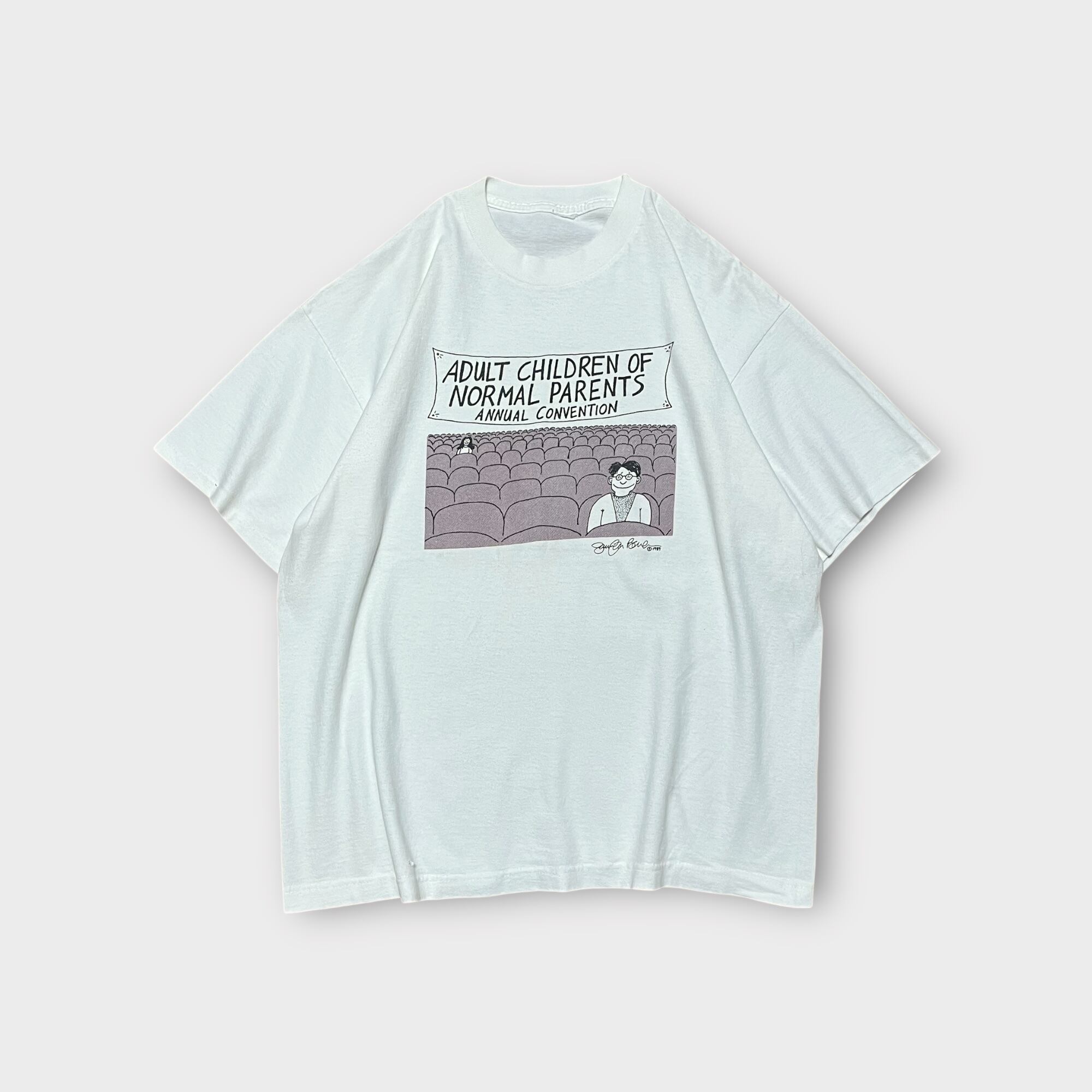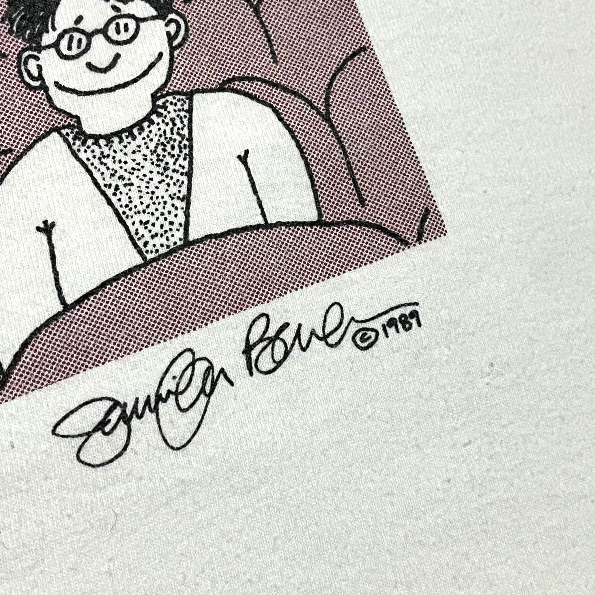 1989年のコピーライトが施されたヴィンテージのプリントTシャツです。ホワイトボディに映画館をモチーフにしたシュールなキャラクタープリントが特徴的で、独特のデザインが魅力です。袖はシングルステッチ仕様。裾に小さな穴と切れがありますが、その分ヴィンテージ感が増し、味わい深いアイテムです。ヴィンテージの風合いを楽しむことができる、ユニークな一着です。