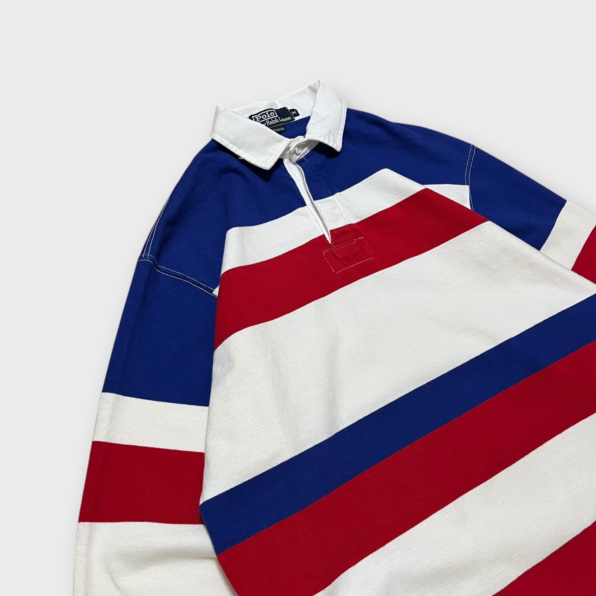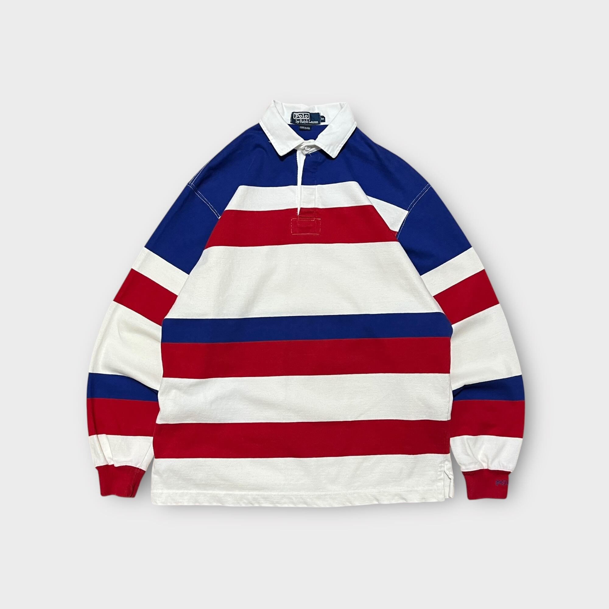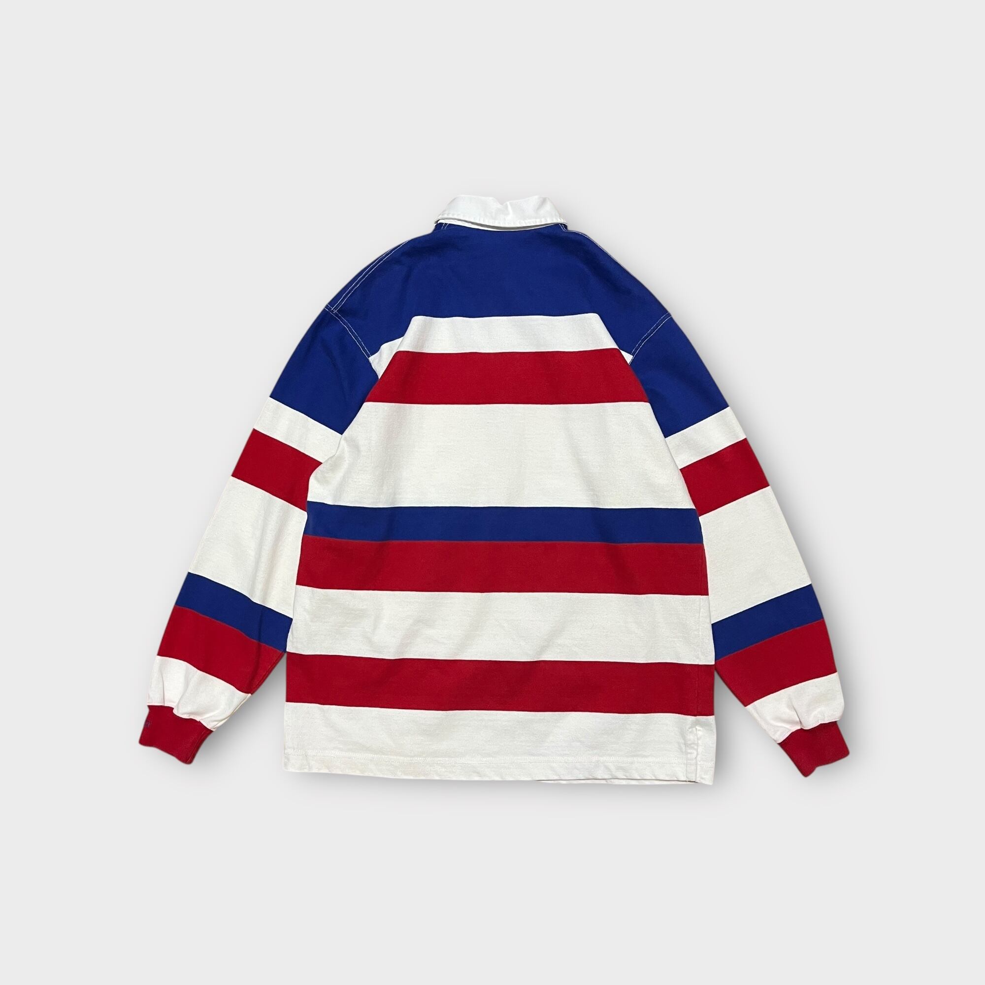 1990年代のRalph Lauren製ラガーシャツ。アメリカ製の希少な一着で、クラシックなラガースタイルを象徴するホワイト・レッド・ブルーのボーダーデザインが特徴です。しっかりとした100%コットン素材を使用し、ヴィンテージならではの風合いを楽しめる仕上がり。程よい厚みがありながらも柔らかく、着心地の良さが魅力です。