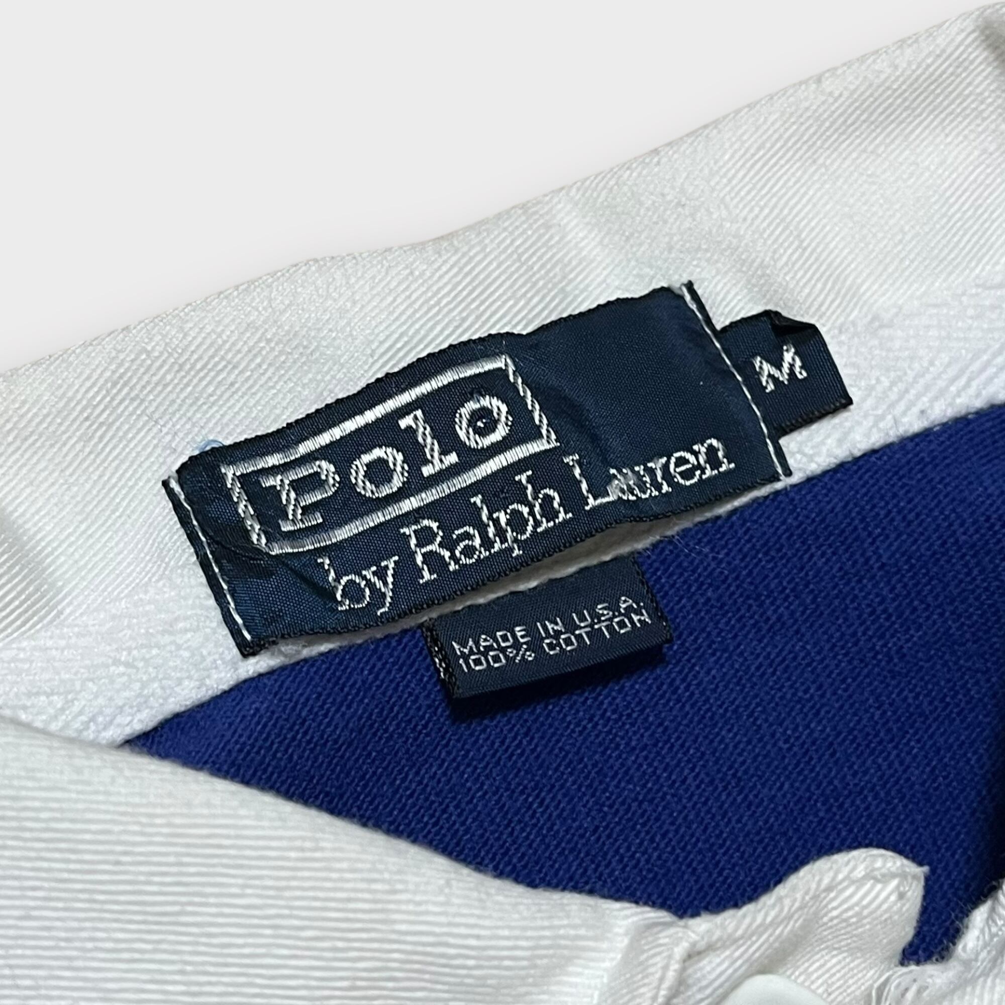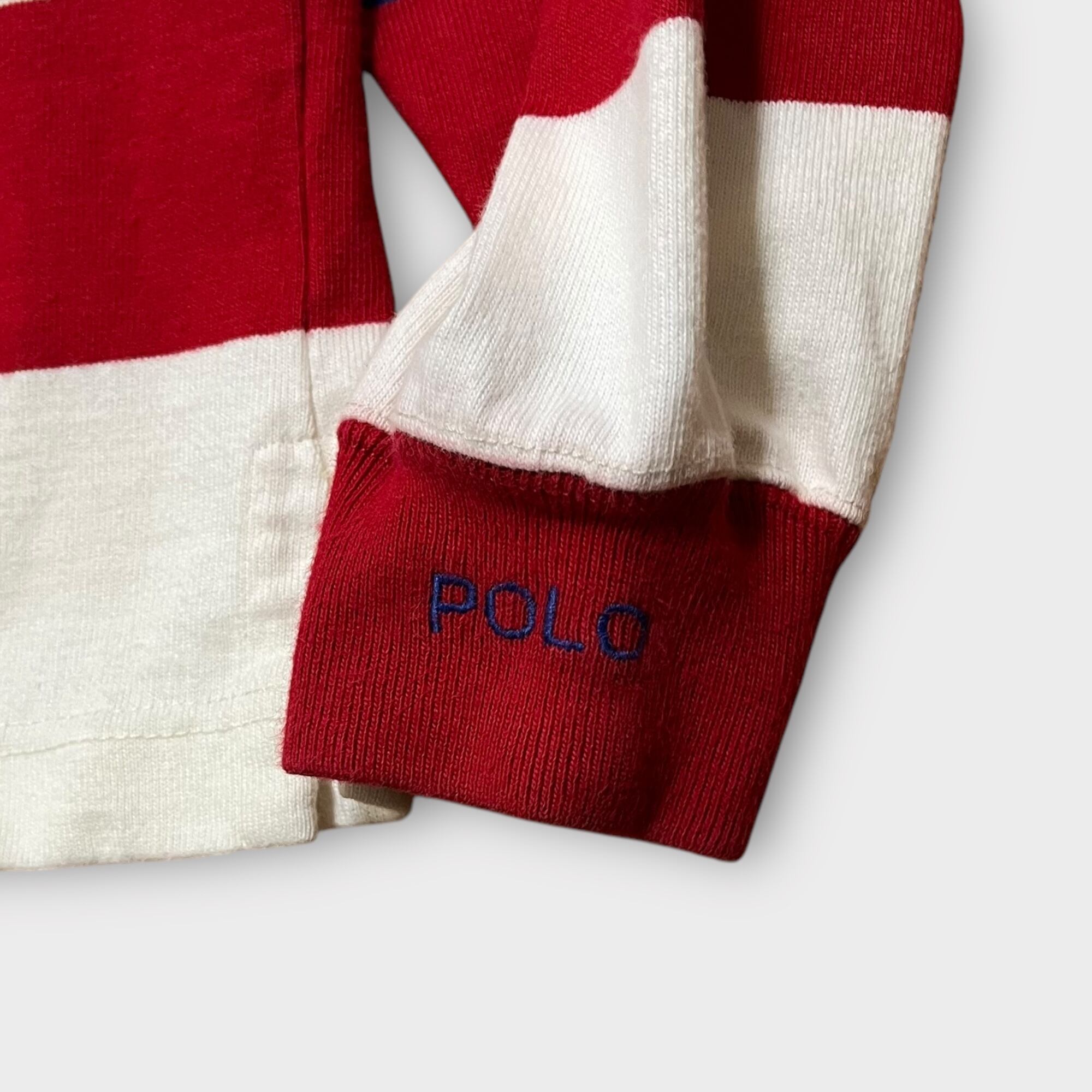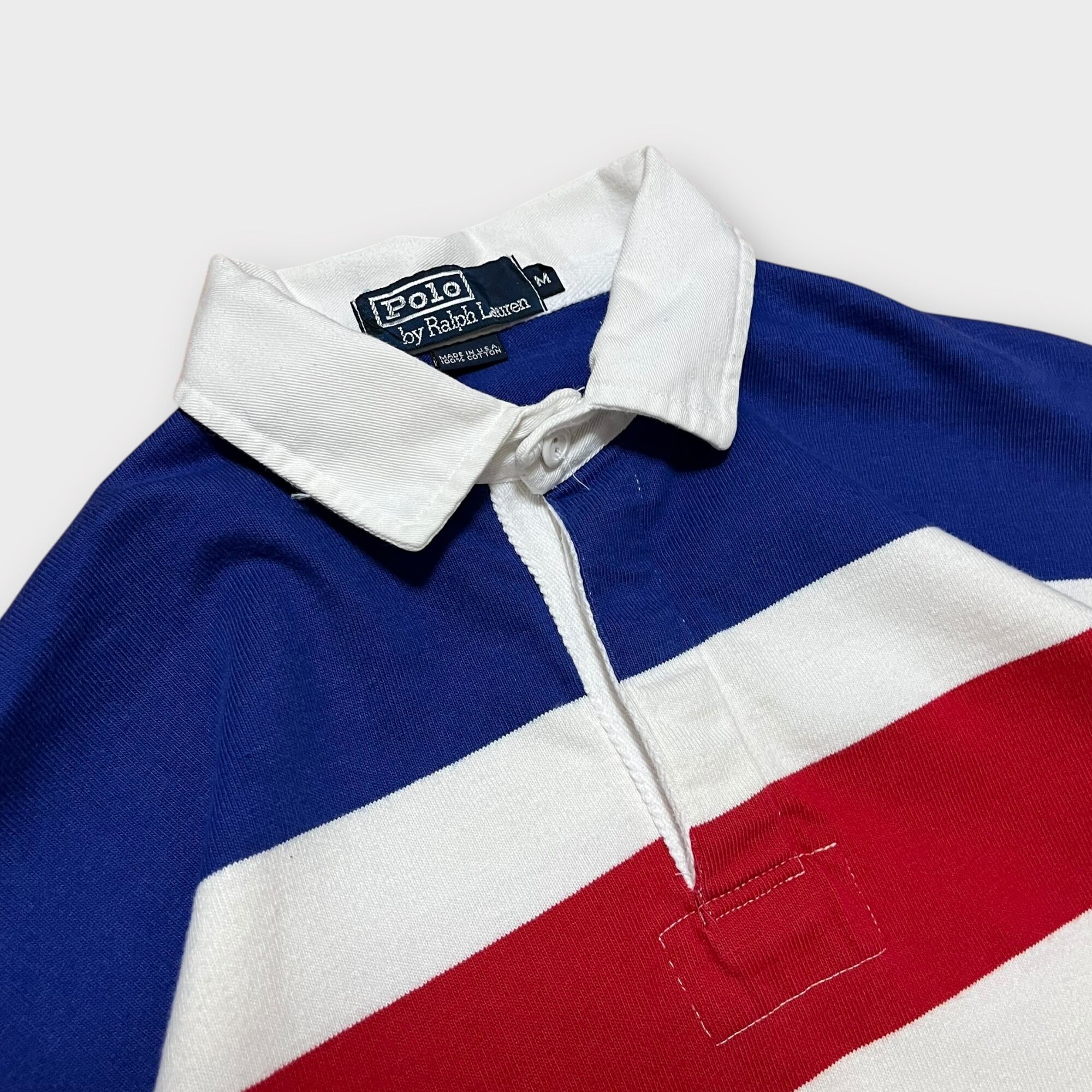 1990年代のRalph Lauren製ラガーシャツ。アメリカ製の希少な一着で、クラシックなラガースタイルを象徴するホワイト・レッド・ブルーのボーダーデザインが特徴です。しっかりとした100%コットン素材を使用し、ヴィンテージならではの風合いを楽しめる仕上がり。程よい厚みがありながらも柔らかく、着心地の良さが魅力です。