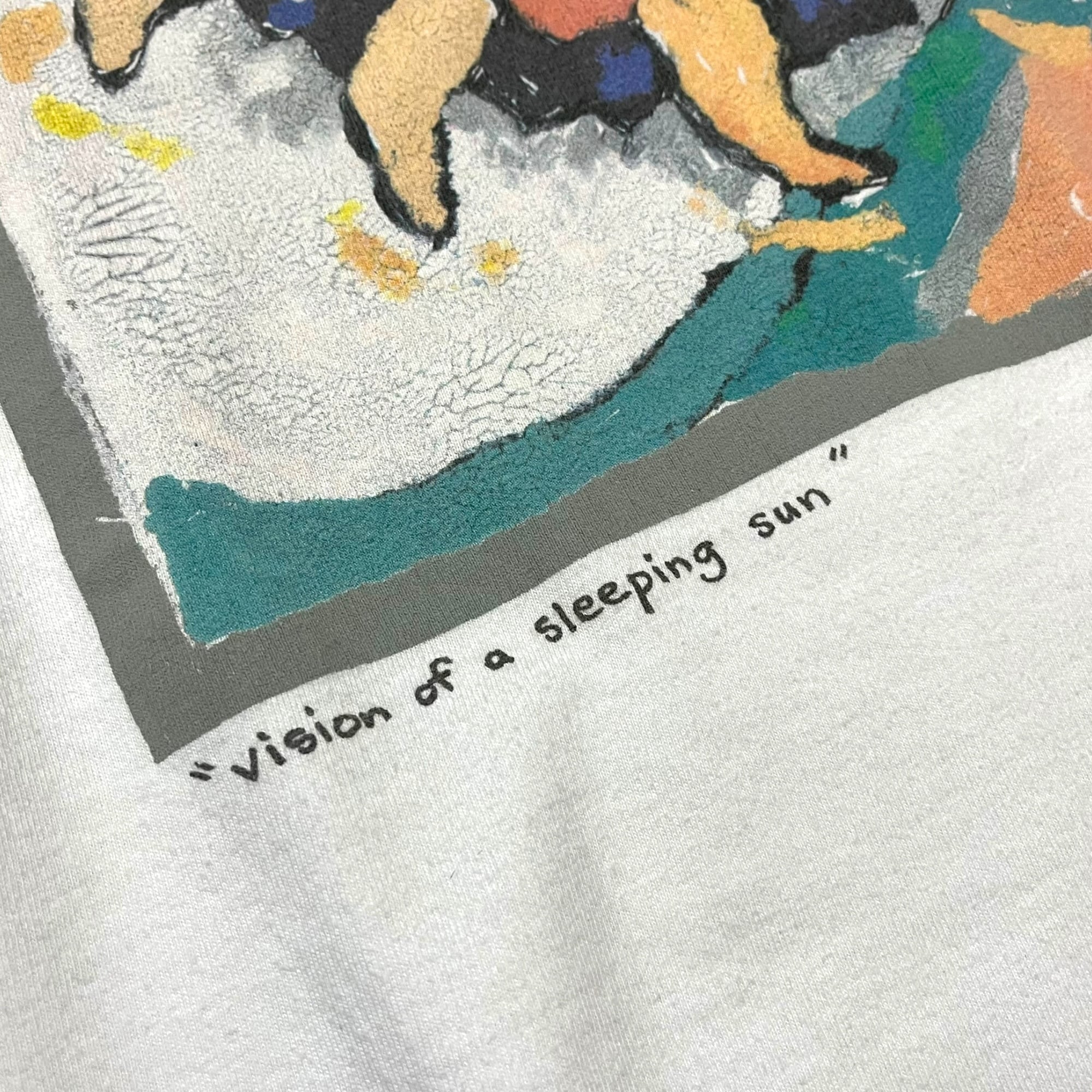 フロントには「Vision of a Sleeping Sun」と題されたアートワークが大胆にプリントされ、太陽をモチーフにしたユニークなデザインが特徴。アーティストによる筆致を活かした独特のテクスチャーが感じられ、クラッキング(ひび割れ)したプリントがヴィンテージ感をさらに引き立てています。グラフィックの下部には手書き風のタイトルがプリントされ、右下にはアーティストのサインが施されたデザイン性の高い一枚。