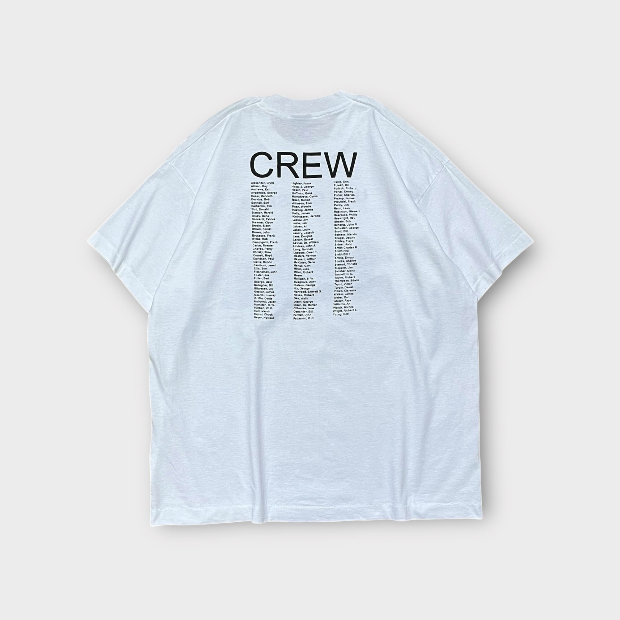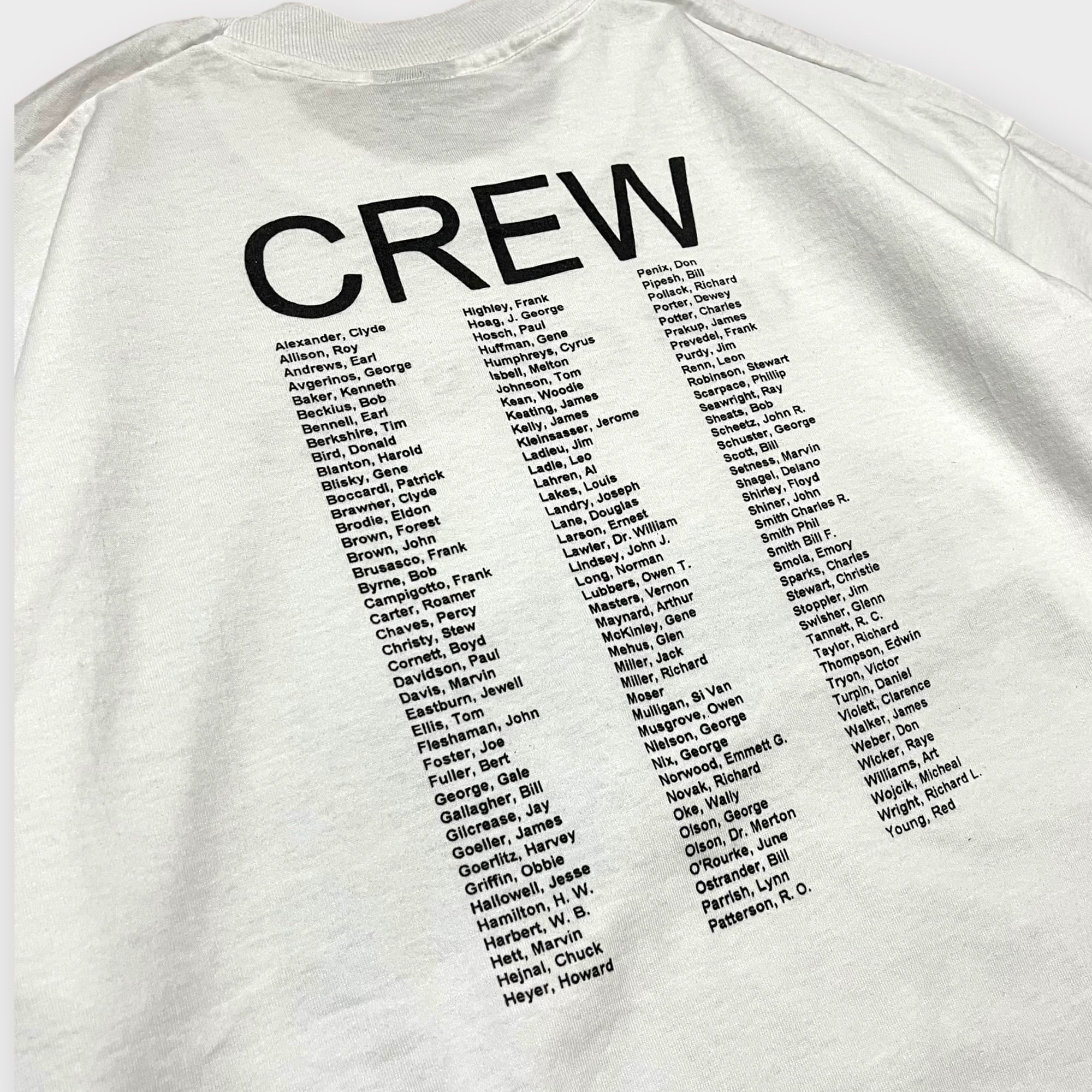 背面には「CREW」の大きなプリントと、その下にクルーメンバーの名前がずらりと並んだデザインが施されています。USS CATSKILLに関わったクルーの名が刻まれており、ミリタリー好きにとっても特別な意味を持つ一枚です。フロントの戦艦デザインと組み合わせることで、よりストーリー性のある仕上がりとなっています。