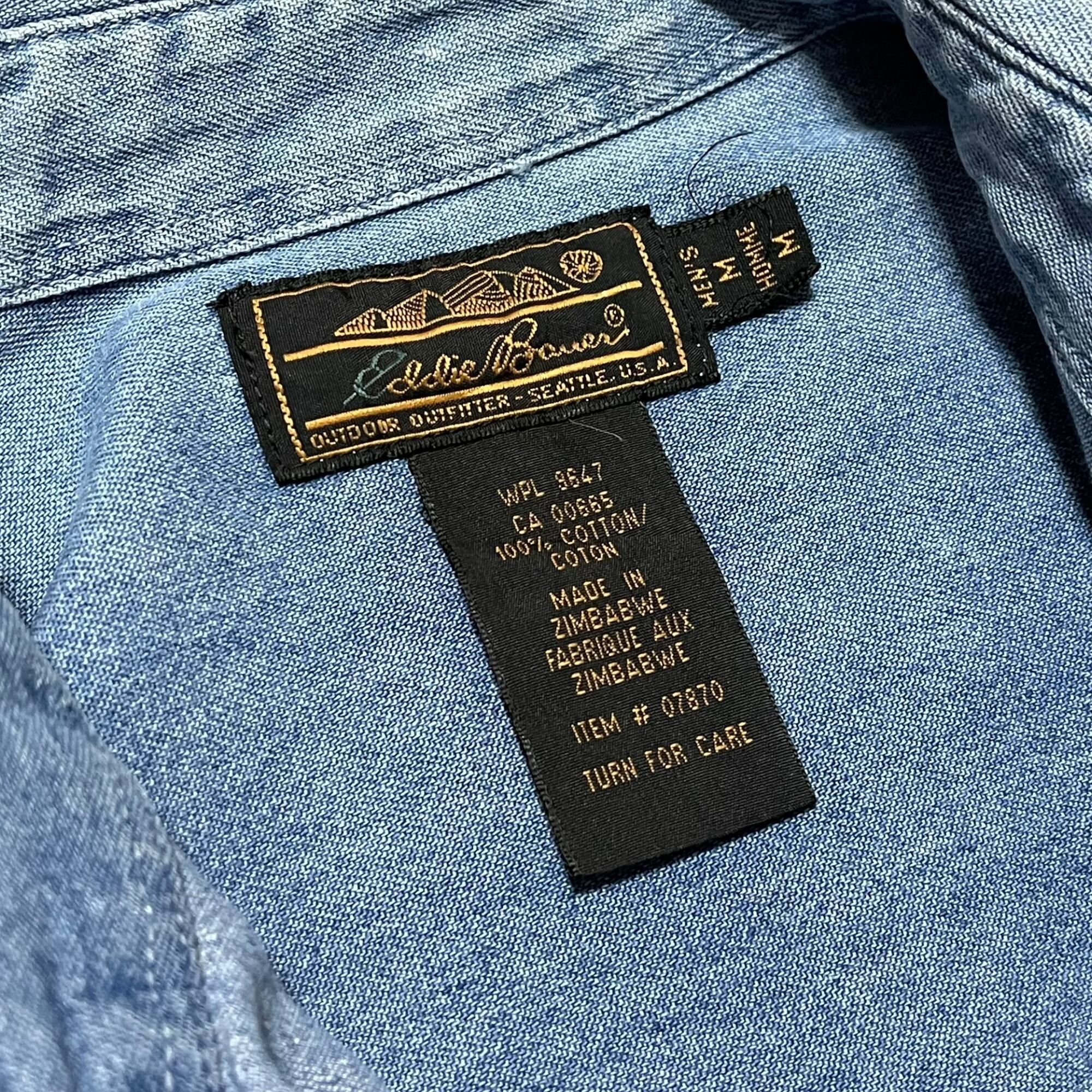 Eddie Bauerの1990年代ヴィンテージデニムシャツ。淡いカラーのデニム生地が特徴で。カジュアルなデイリースタイルにもアウトドアシーンにもマッチします。