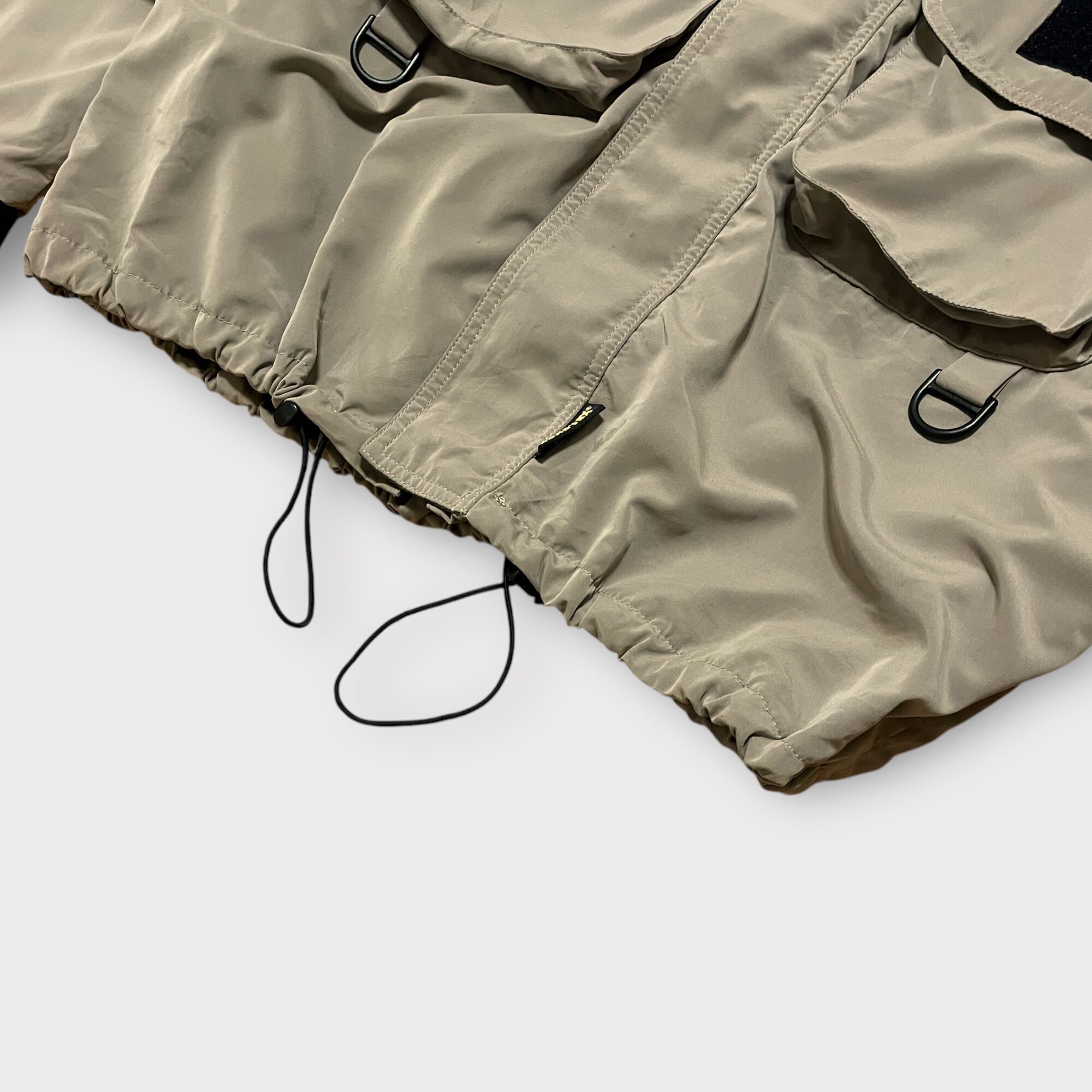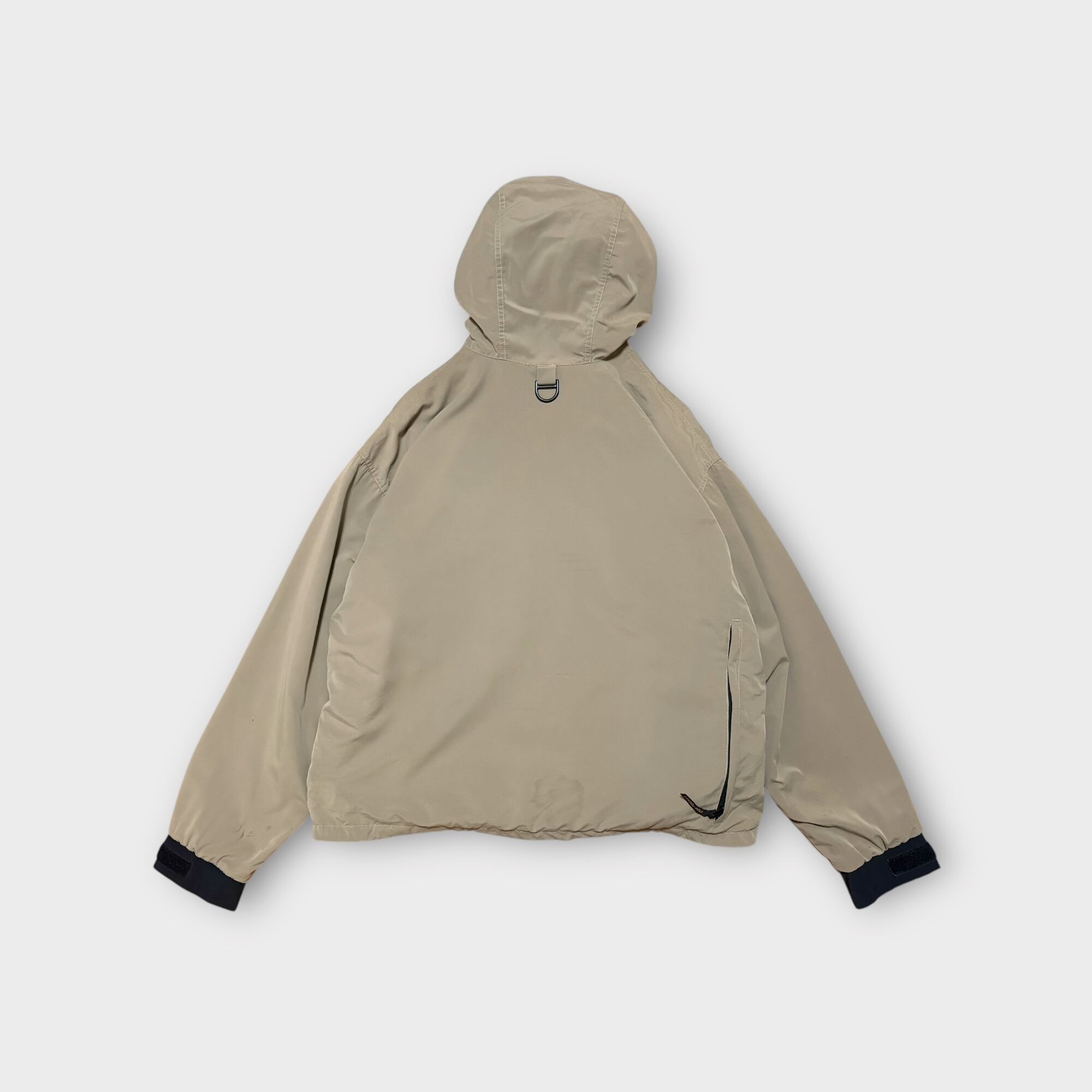 シェルには軽量かつ耐久性の高いポリエステル素材を採用。裏地にはGORE-TEXメンブレンを搭載し、悪天候下でも快適な着用感をキープ。フロントには大容量のフラップポケットを2つ配置し、ギアや小物の収納に優れています。Dリングやベルクロパッチが施され、実用性とデザイン性を両立。さらに、裾のドローコードや袖口のベルクロアジャスターにより、フィット感を自在に調整可能です。