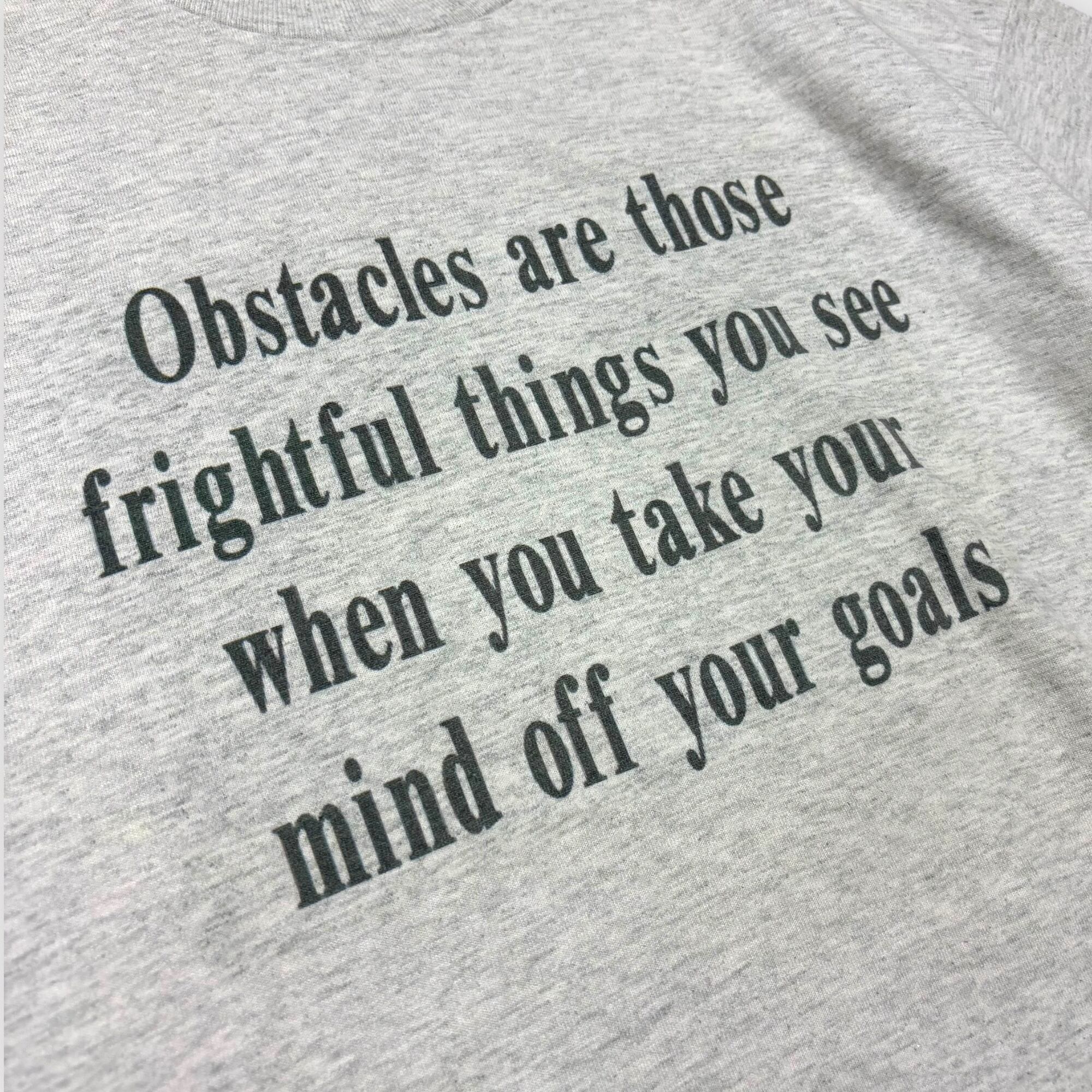 フロントには「Obstacles are those frightful things you see when you take your mind off your goals(障害とは、目標から目をそらしたときに見える恐ろしいもの)」という一文がプリントされており、着る者・見る者の心に静かに訴えかけてきます。