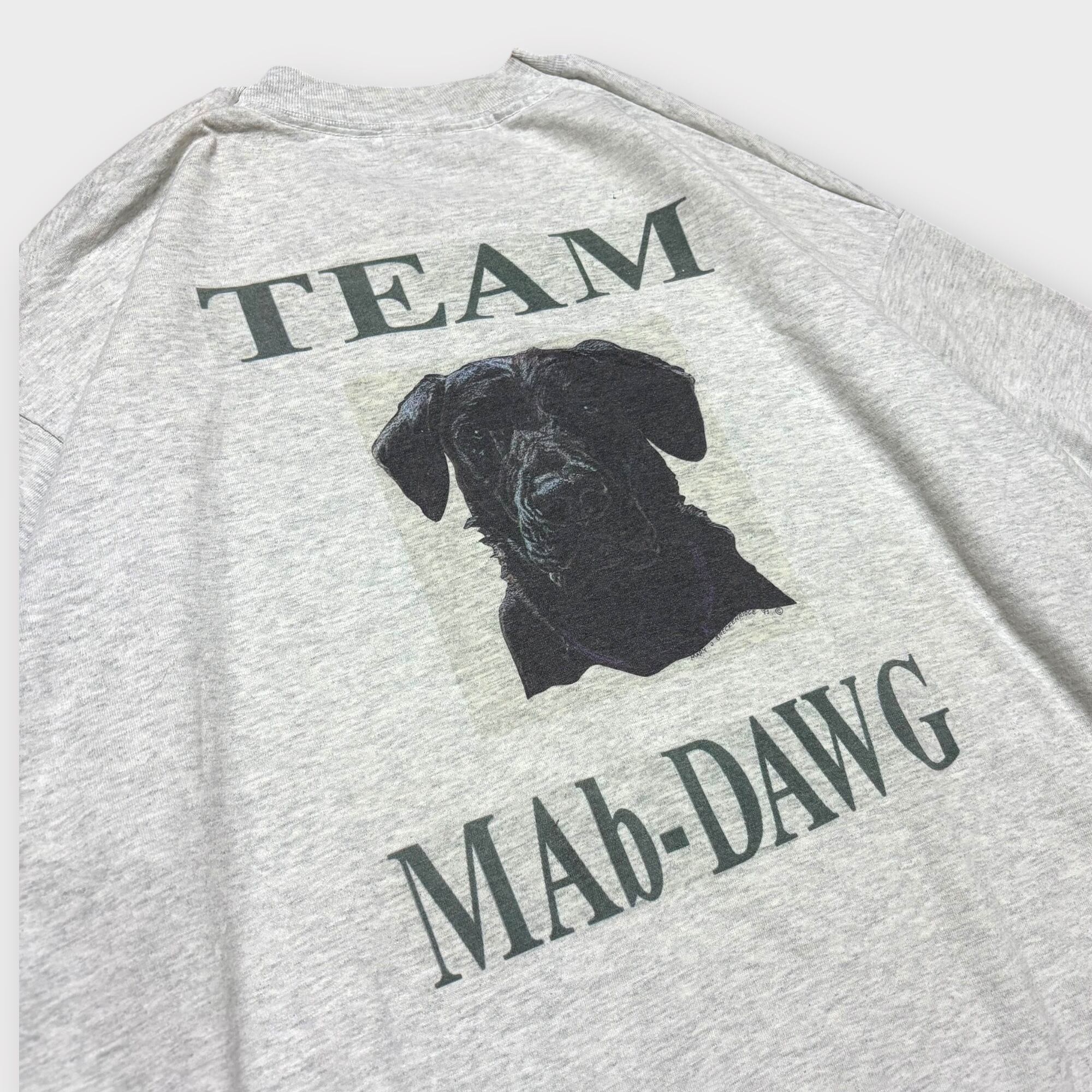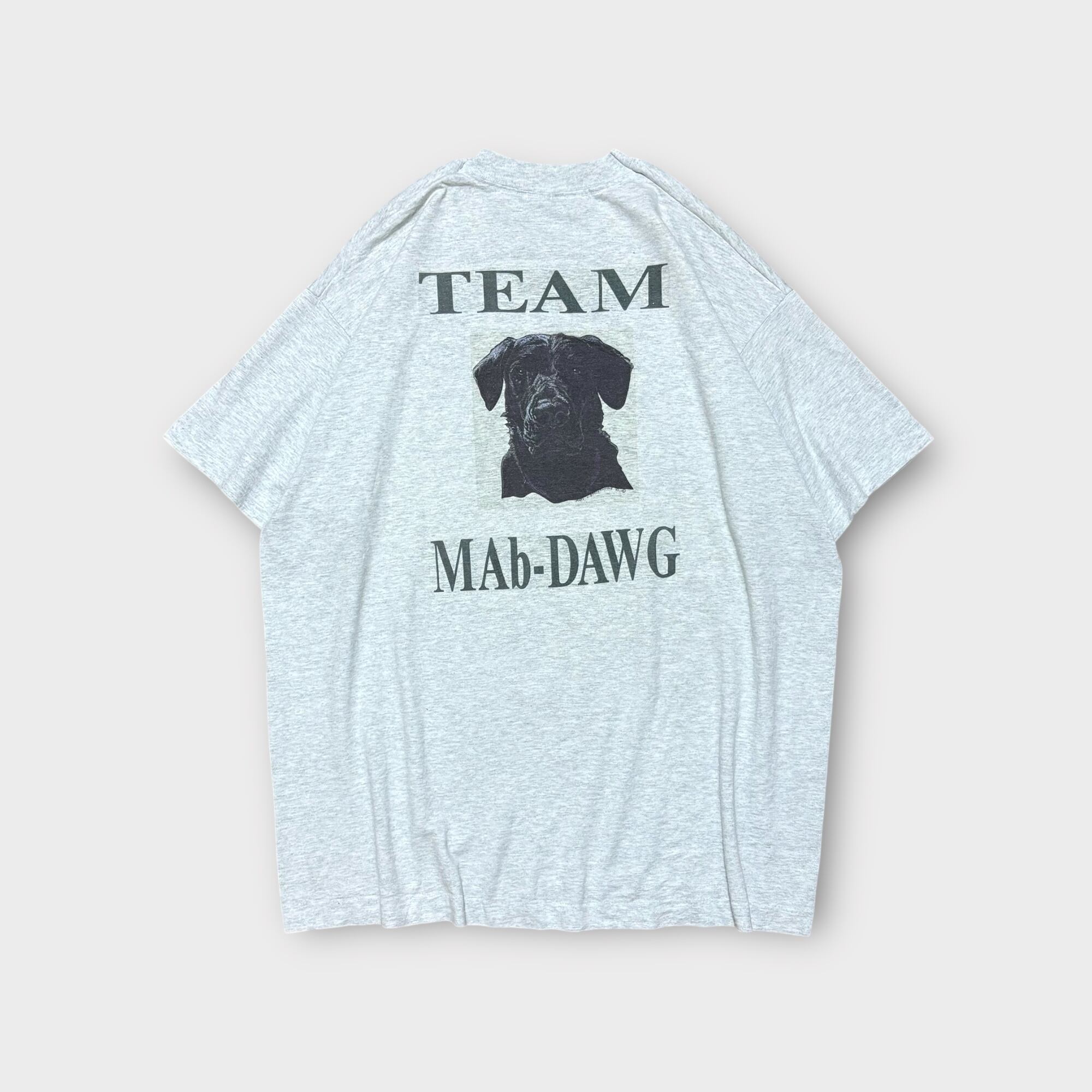 バックには、黒いラブラドールと思われる犬のプリントと “TEAM Mab-DAWG” の文字が。ユニークな名前やアーティストのサイン(Mary J. Breckenridge)とコピーライトの記載(’91)も確認でき、デザイン性・ストーリー性のある一着です。