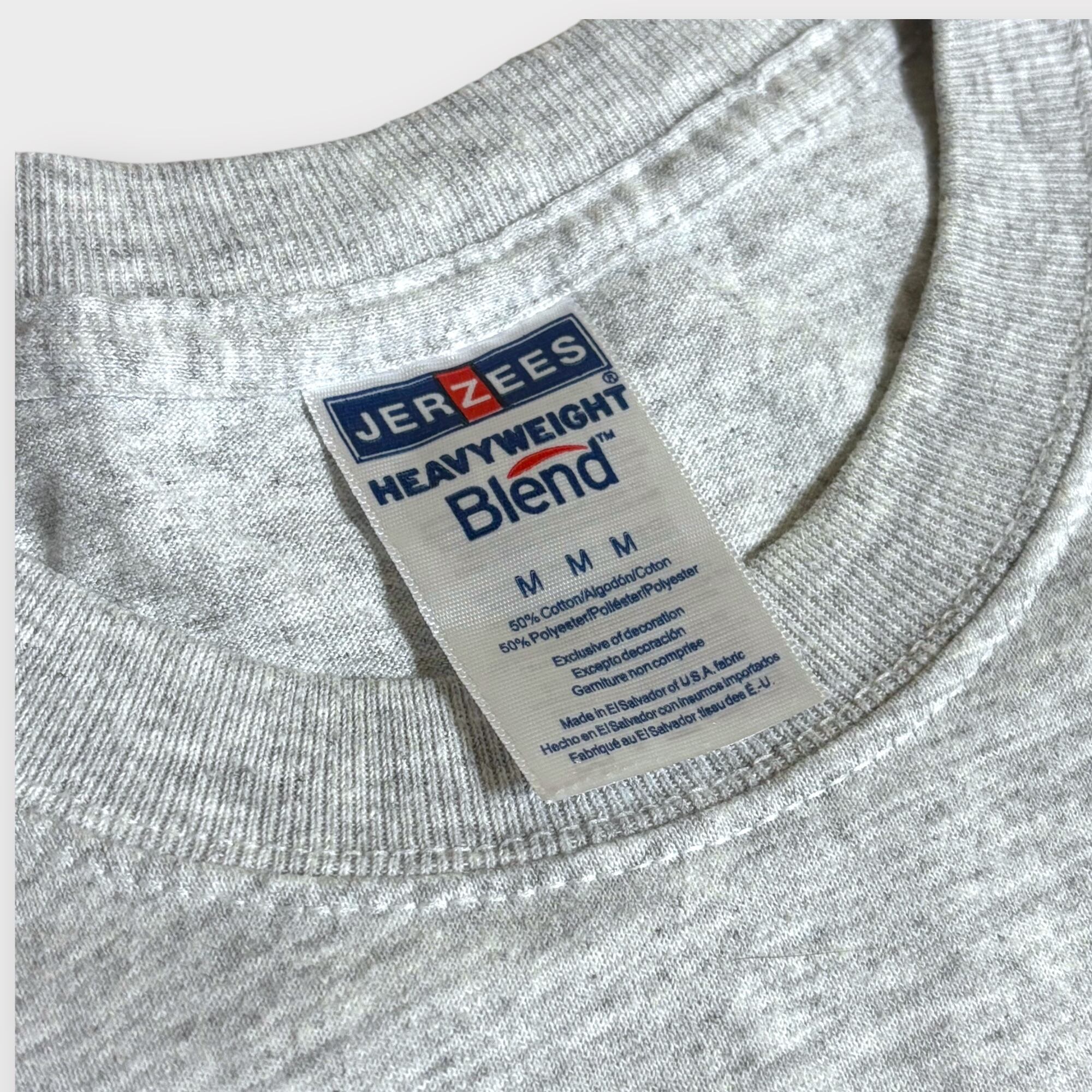 ボディはJERZEES HEAVYWEIGHT BLEND。表記は“ヘビーウェイト”ですが、実際は軽やかでやや薄手の生地感。肌離れの良いコットン×ポリエステル混紡で、春夏に一枚で快適に着用いただけます。縫製はエルサルバドル、使用ファブリックはUSA製。