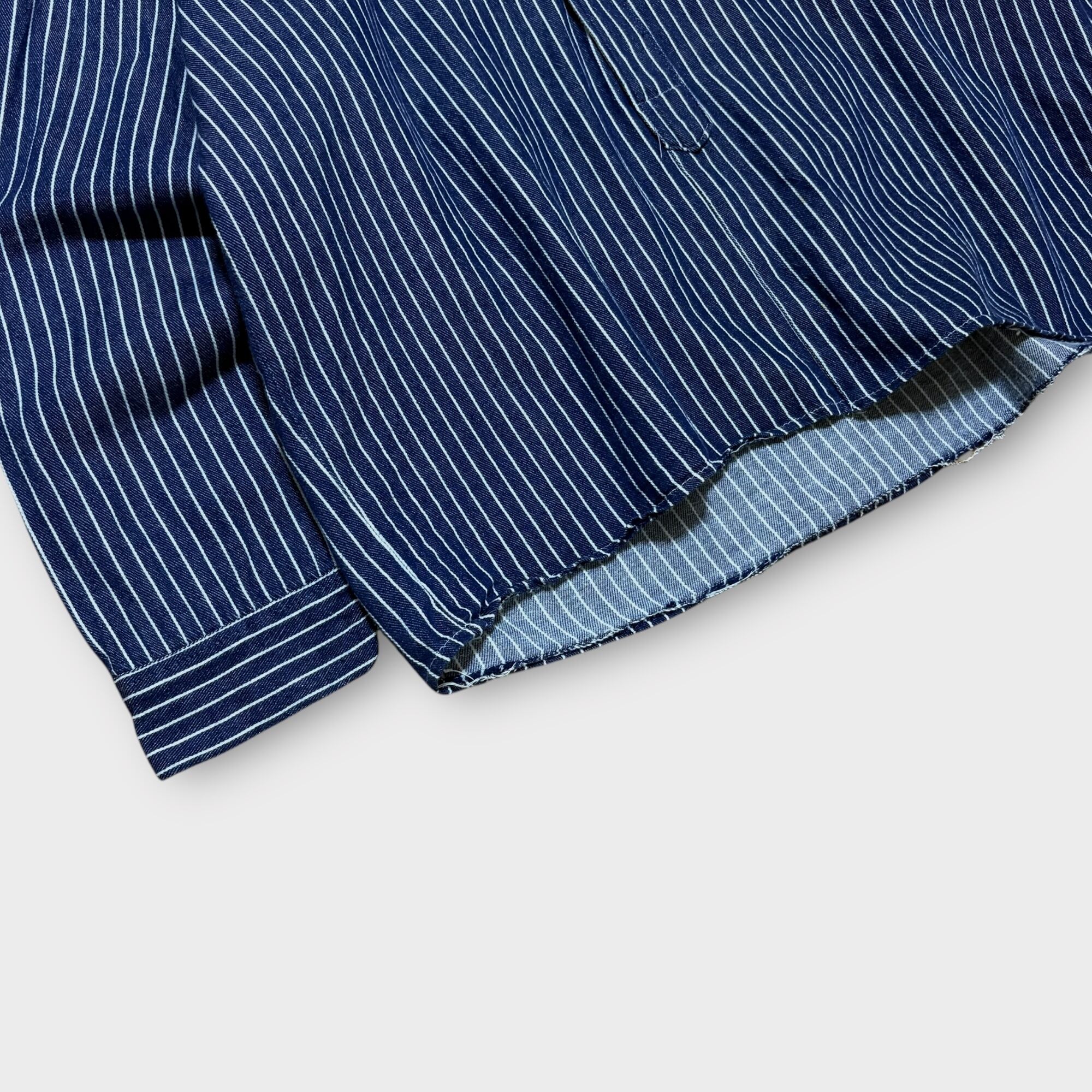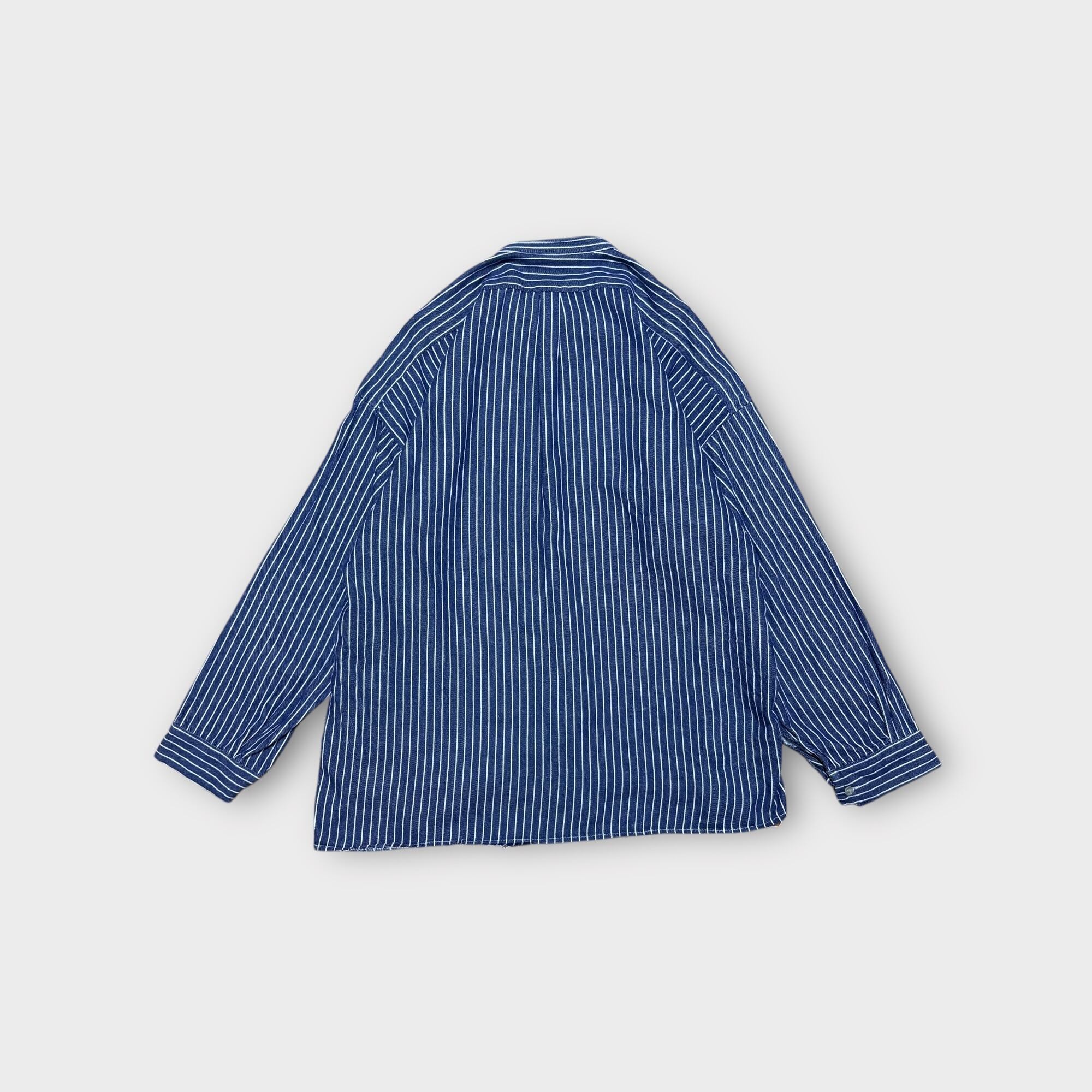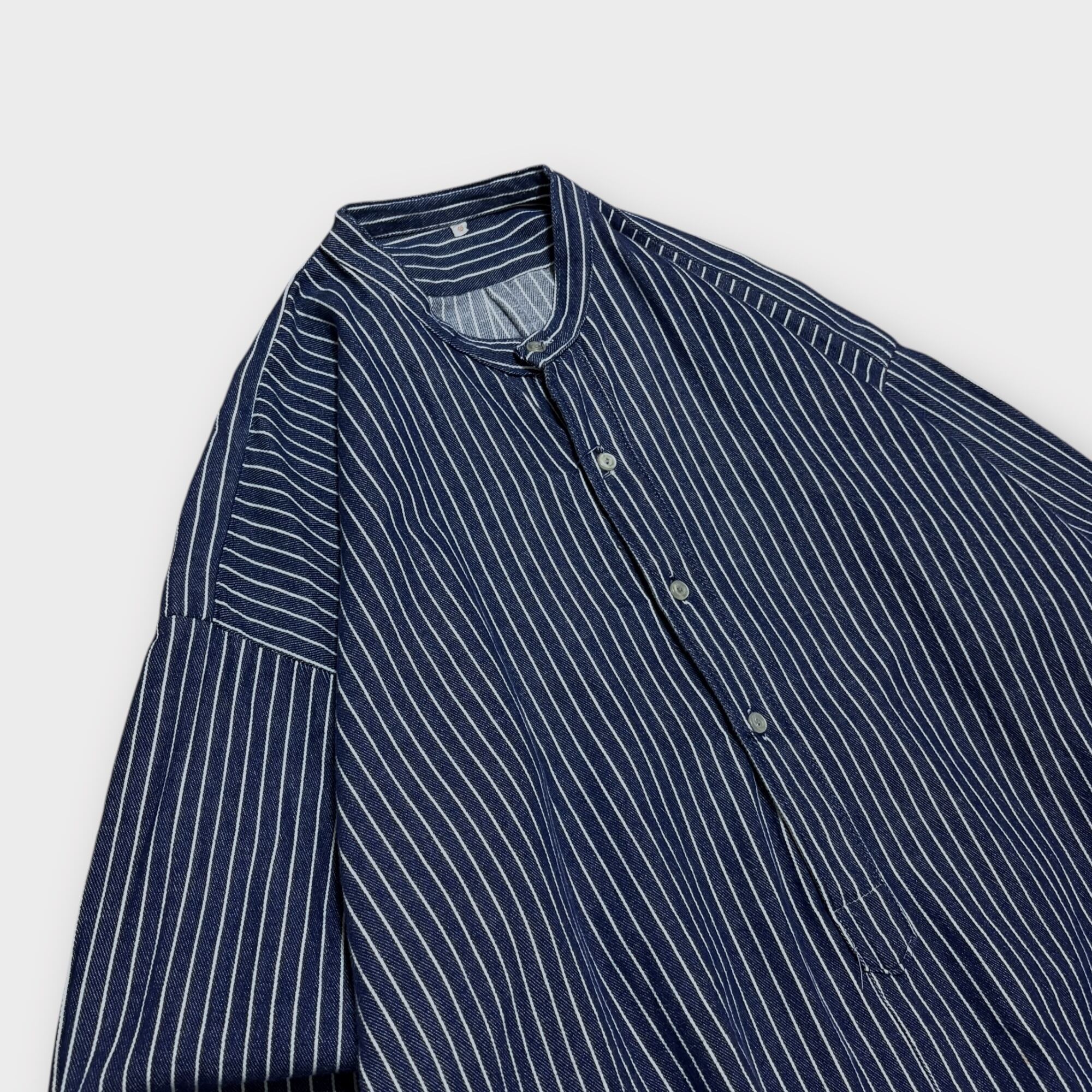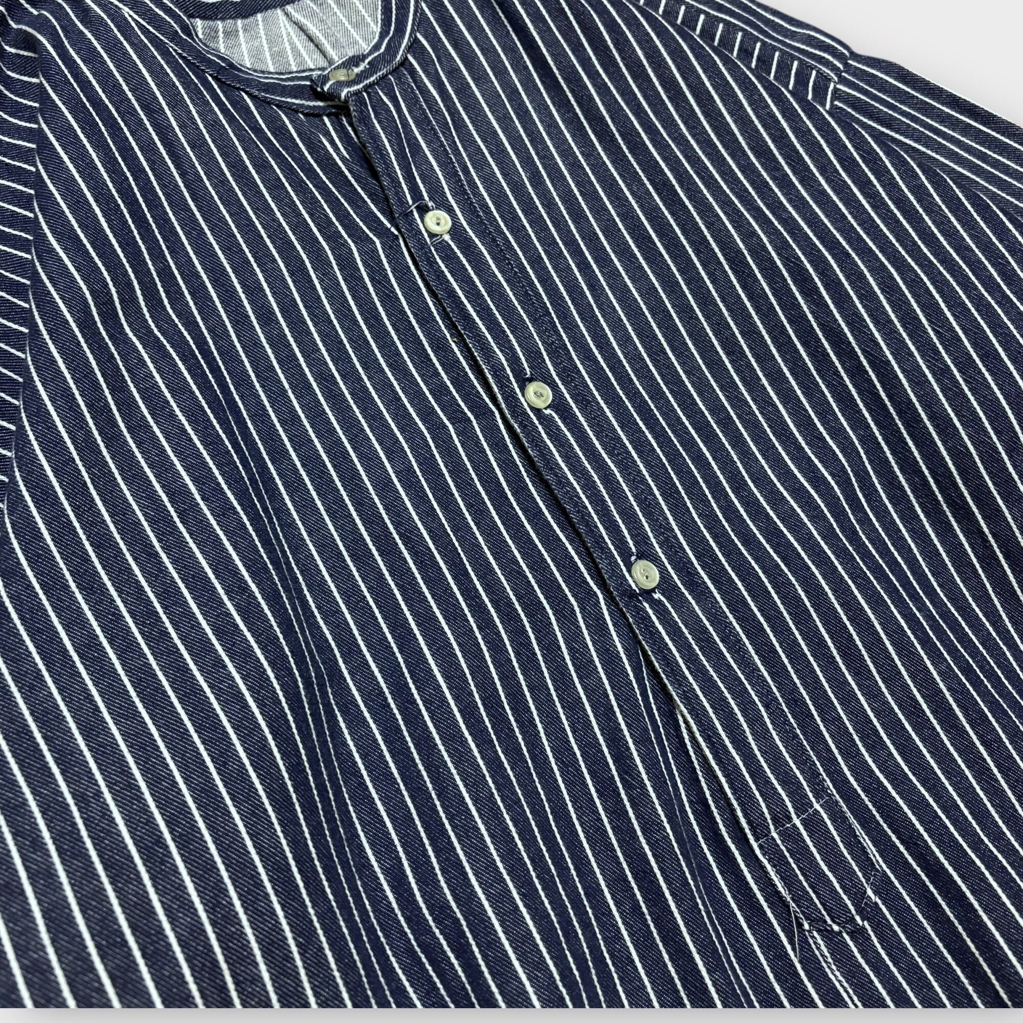 ネイビーを基調にした落ち着いた配色に、ホワイトのストライプが映える上品な印象。ハーフボタン仕様と丸みのあるバンドカラーがクラシカルな佇まいを引き立てます。