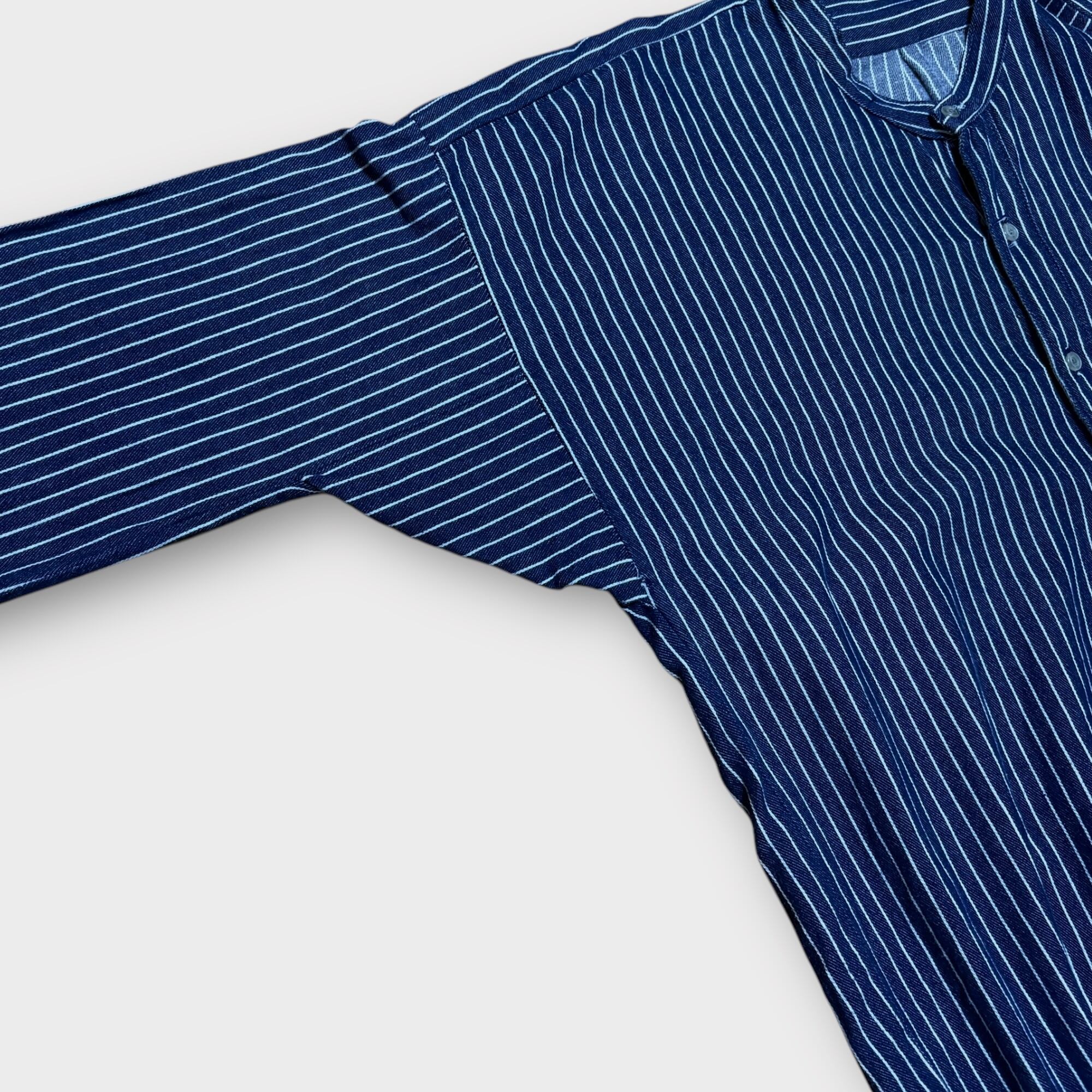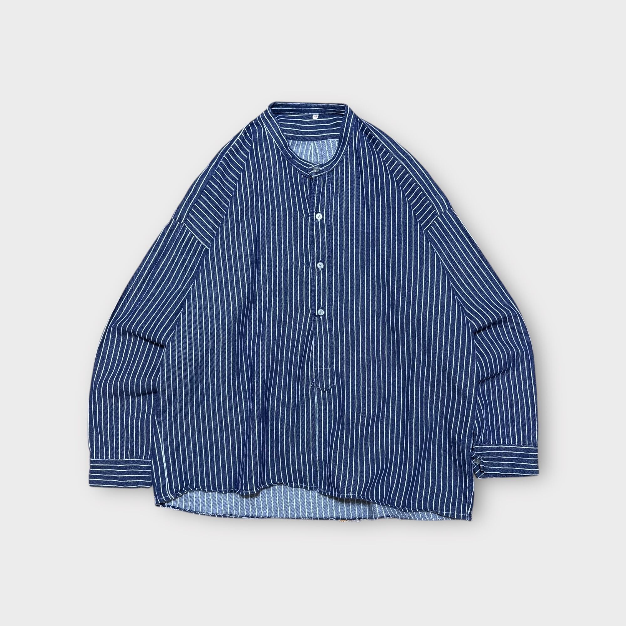 タグなどの明確なブランド表示はありませんが、ヨーロッパのフィッシャーマンシャツを思わせる空気感と、丁寧なディテールが光る一枚。リネンシャツやバンドカラー好きの方にも、スタイルの幅を広げる春の羽織りとしておすすめです。