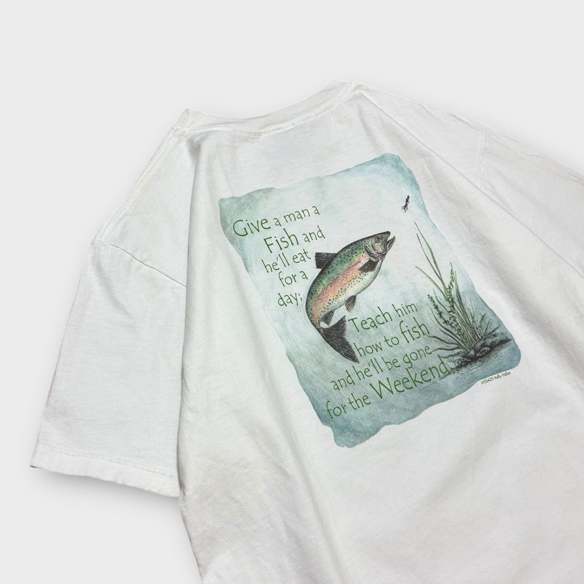 バックには「Give a man a Fish and he’ll eat for a day; Teach him how to fish and he’ll be gone for the Weekend.」という英語のことわざがプリントされたユニークな一枚。