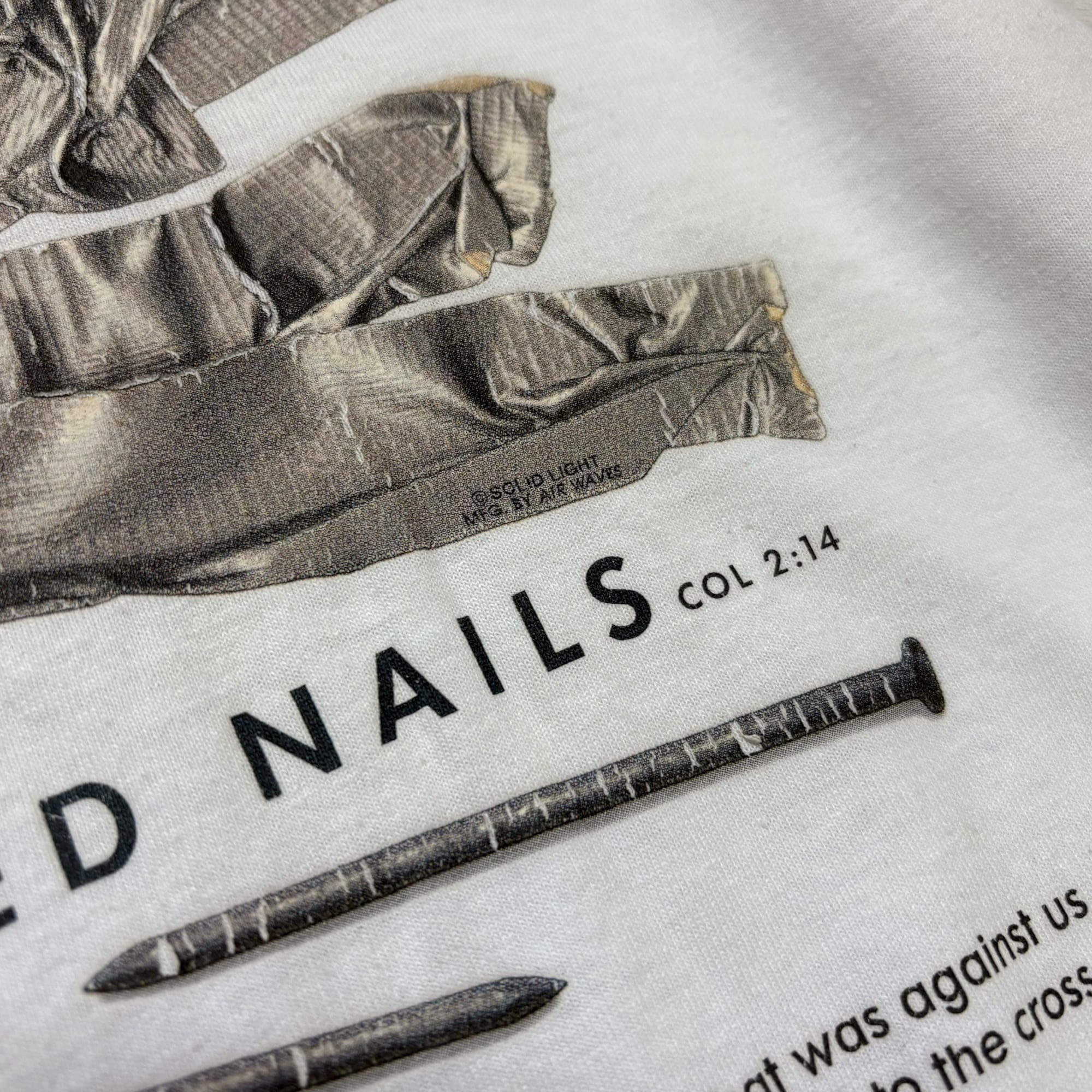 フロントに大きくプリントされたダクトテープと釘、そして引用されているのは聖書の一節「コロサイ人への手紙2章14節」。