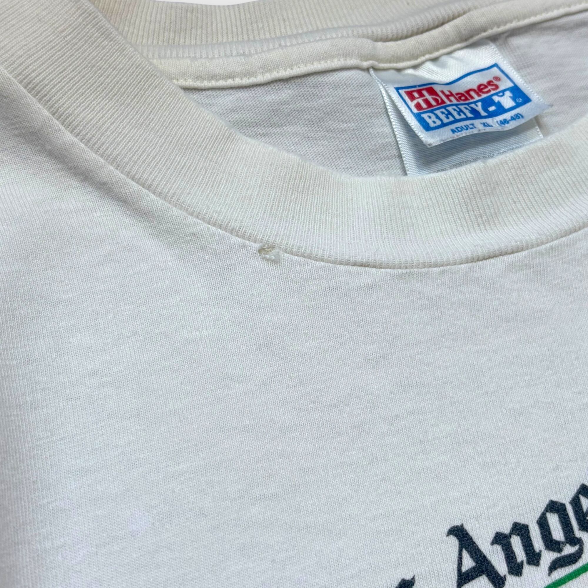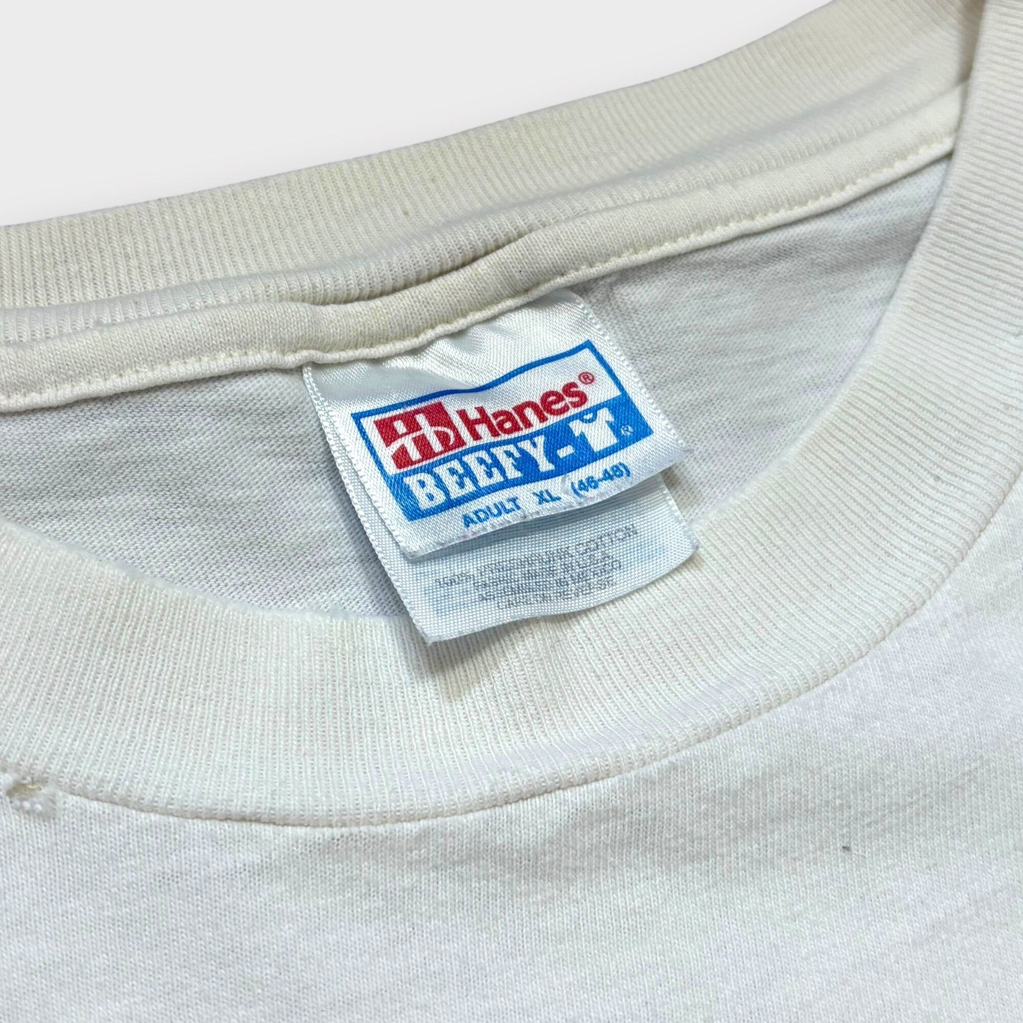 ボディはHanesの定番BEEFY-T。しっかりしたコットン生地で、やや短め着丈のボックスシルエット。
