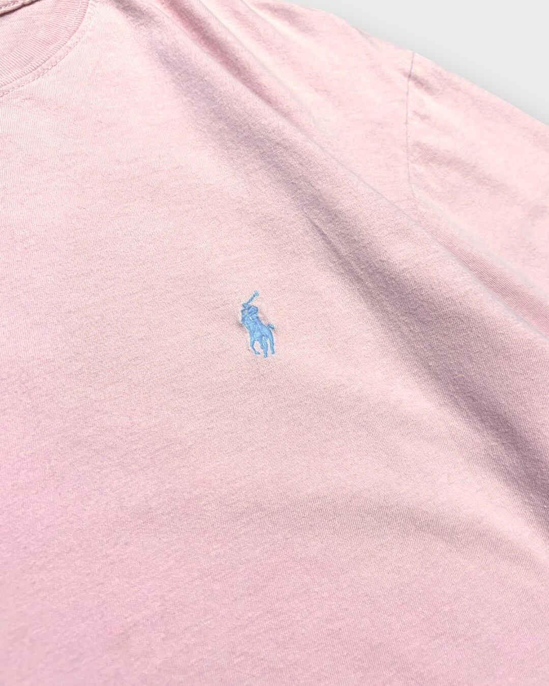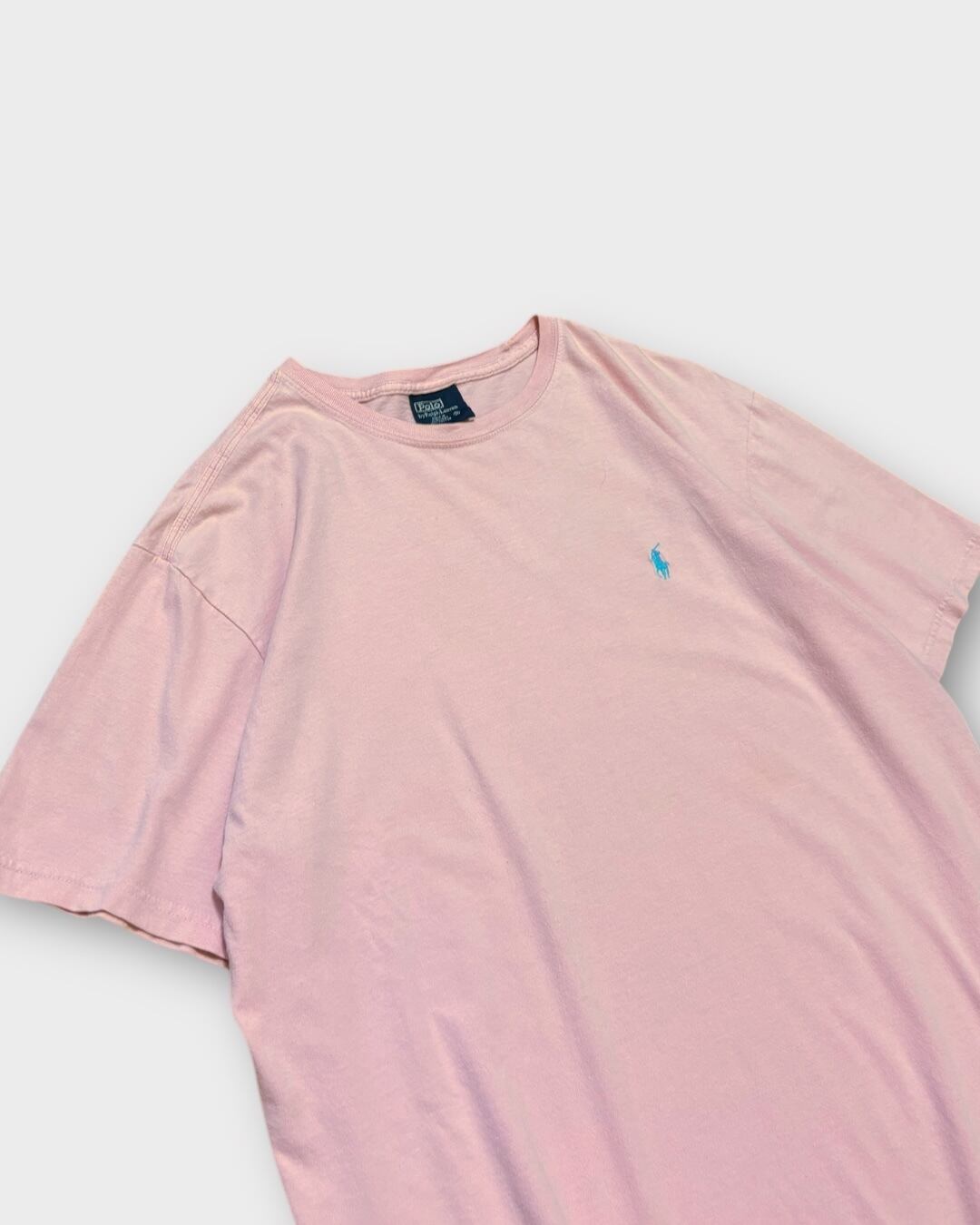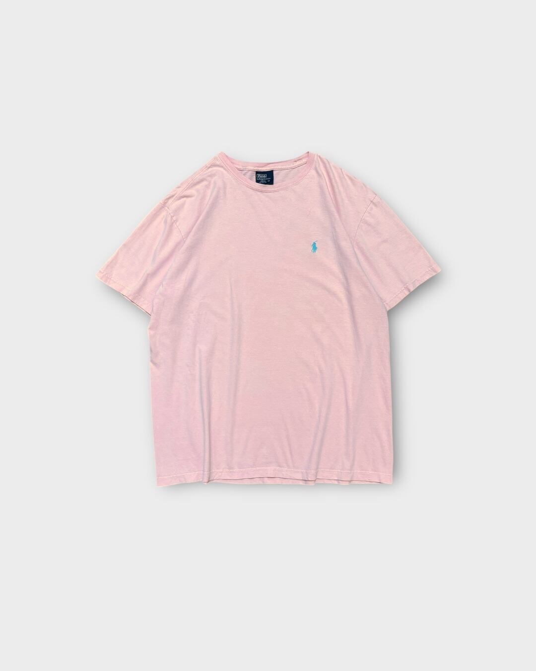 柔らかなピンクボディに、淡いブルーのポニー刺繍が映えるRalph LaurenのワンポイントTシャツ。