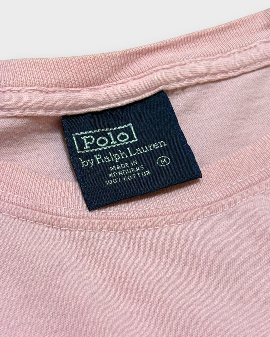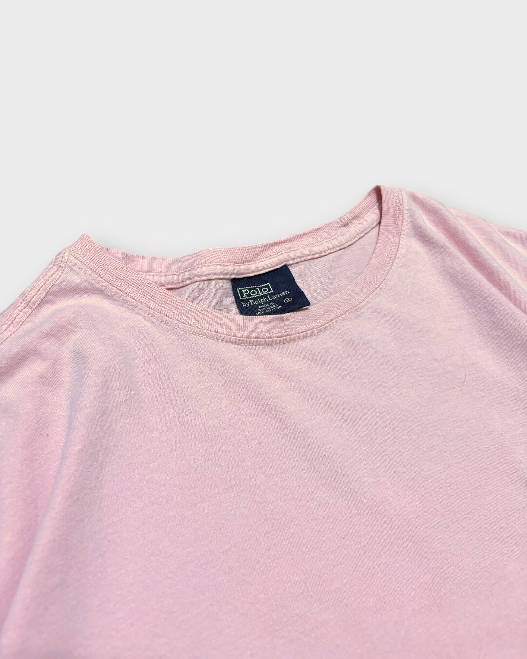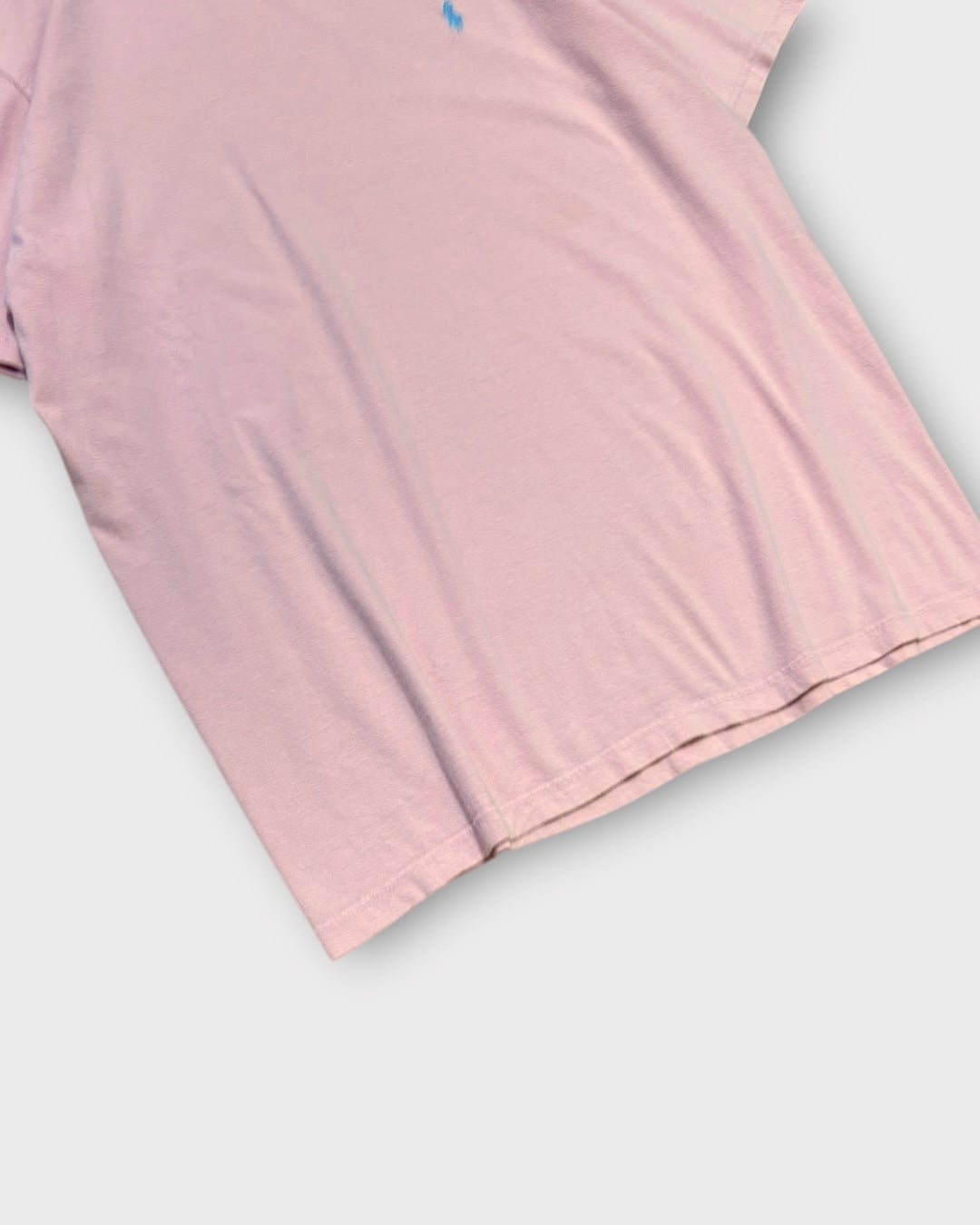柔らかなピンクボディに、淡いブルーのポニー刺繍が映えるRalph LaurenのワンポイントTシャツ。