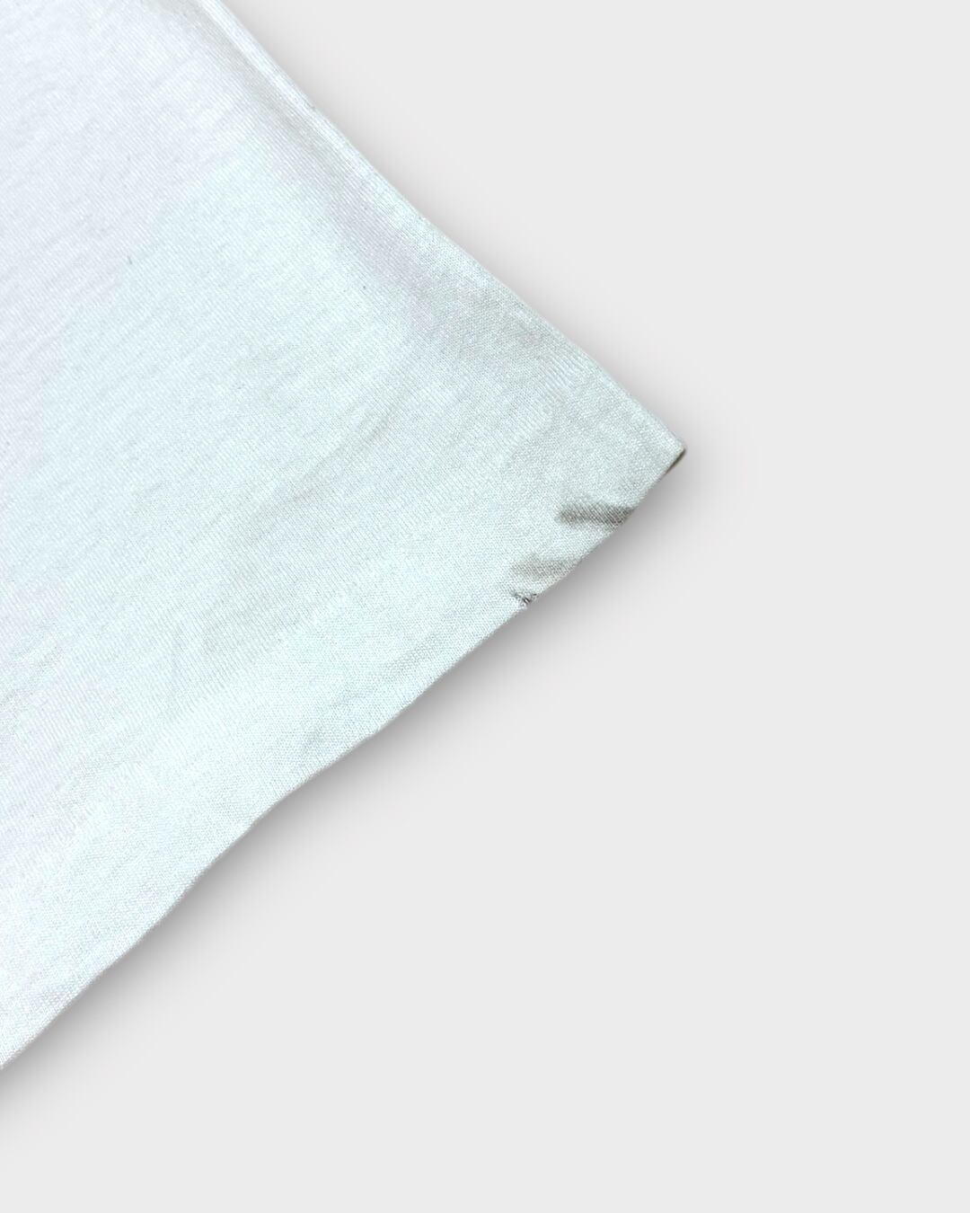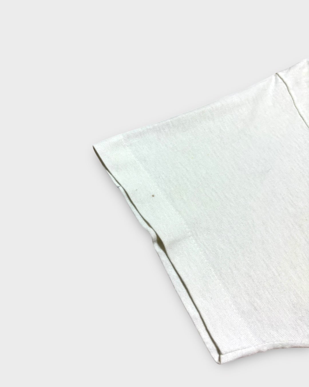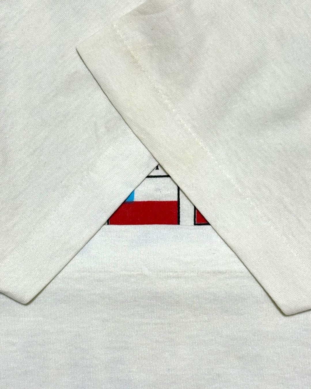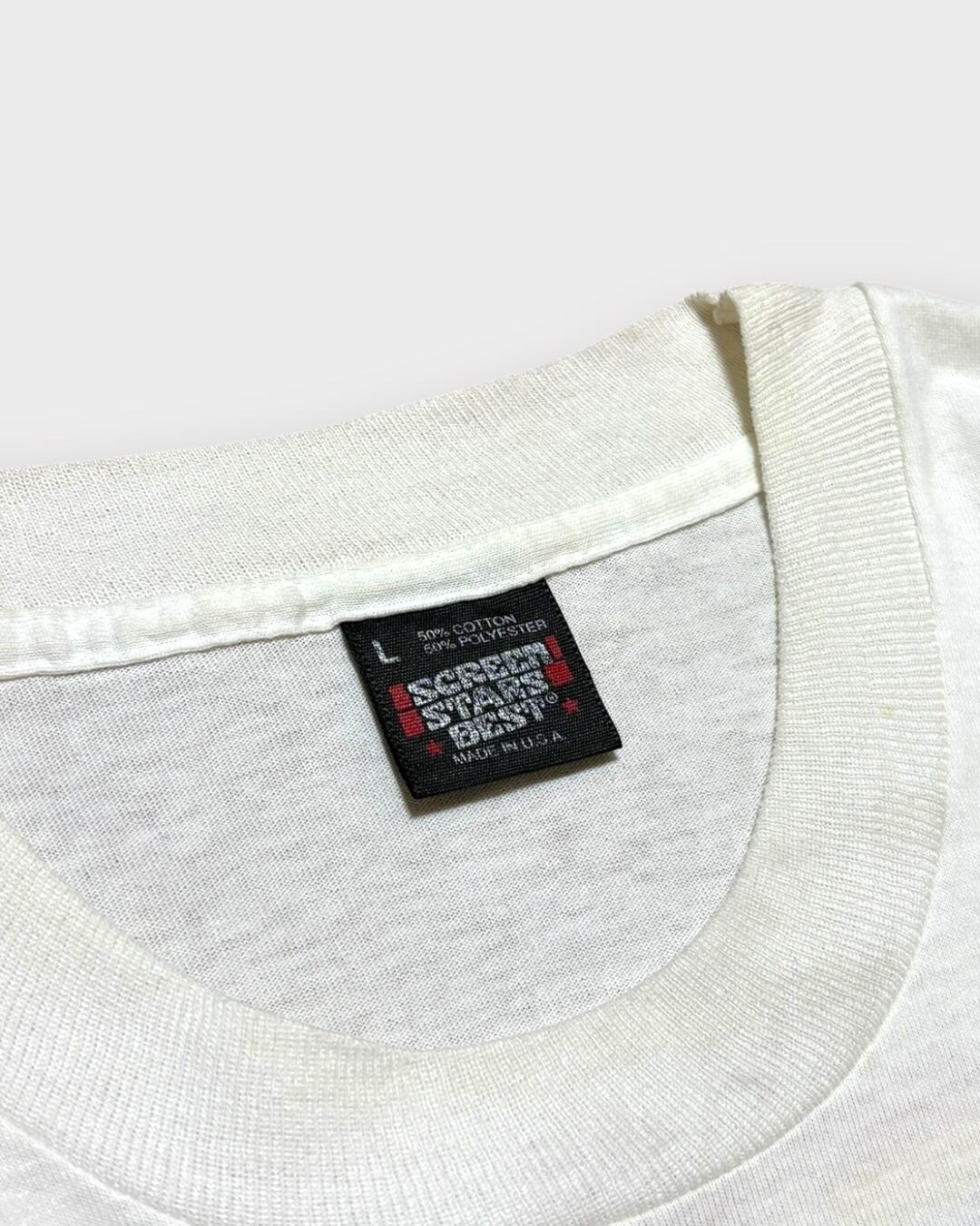 ボディはMade in USAのSCREEN STARS BEST、黒タグ・赤バー入りの80年代タグ。ポリコットンの柔らかくドライな質感に加え、シングルステッチ仕様で、1980年代のヴィンテージらしいスタイル