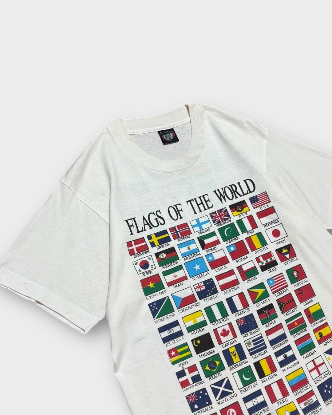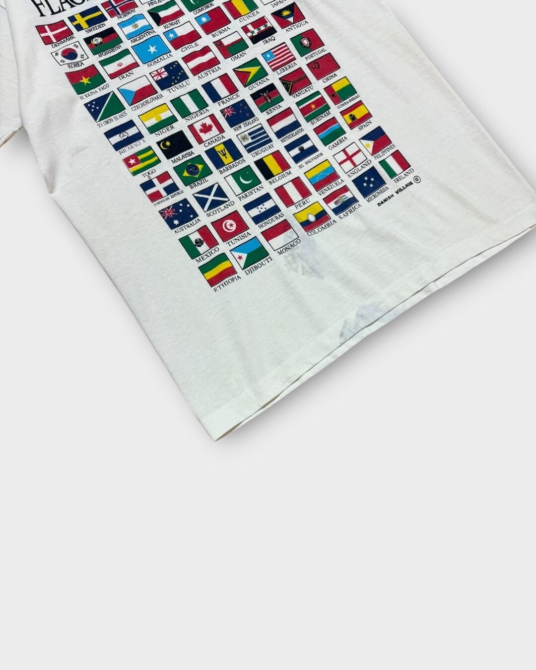 「FLAGS OF THE WORLD」のタイトルのもと、世界各国の国旗がびっしりと前後にプリントされた、アート性の高いグラフィックTシャツ。