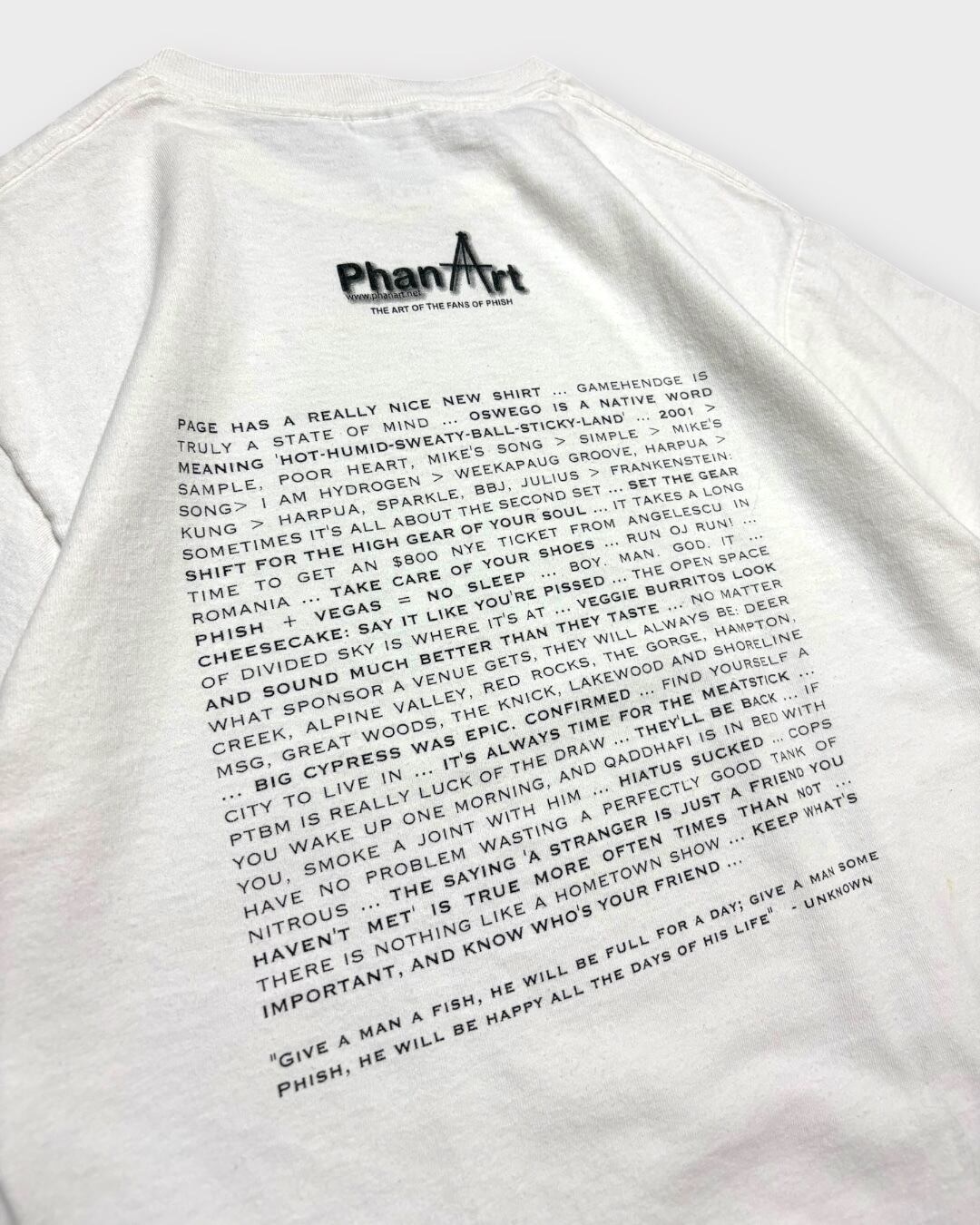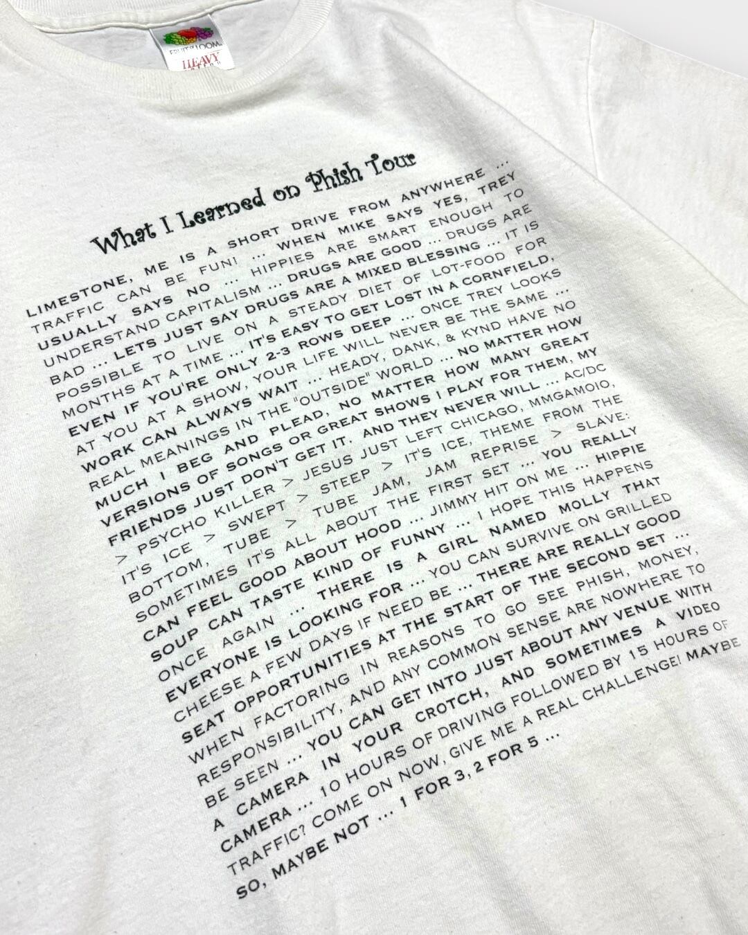 アメリカのジャムバンド「Phish」のファンカルチャーを詰め込んだ、非常に珍しい一枚。前面には「Phishツアーから学んだこと」がユーモラスかつ皮肉たっぷりに綴られ、背面には“PhanArt”(=Phishファンによるアート作品)と題された続編のようなプリントが施されています。