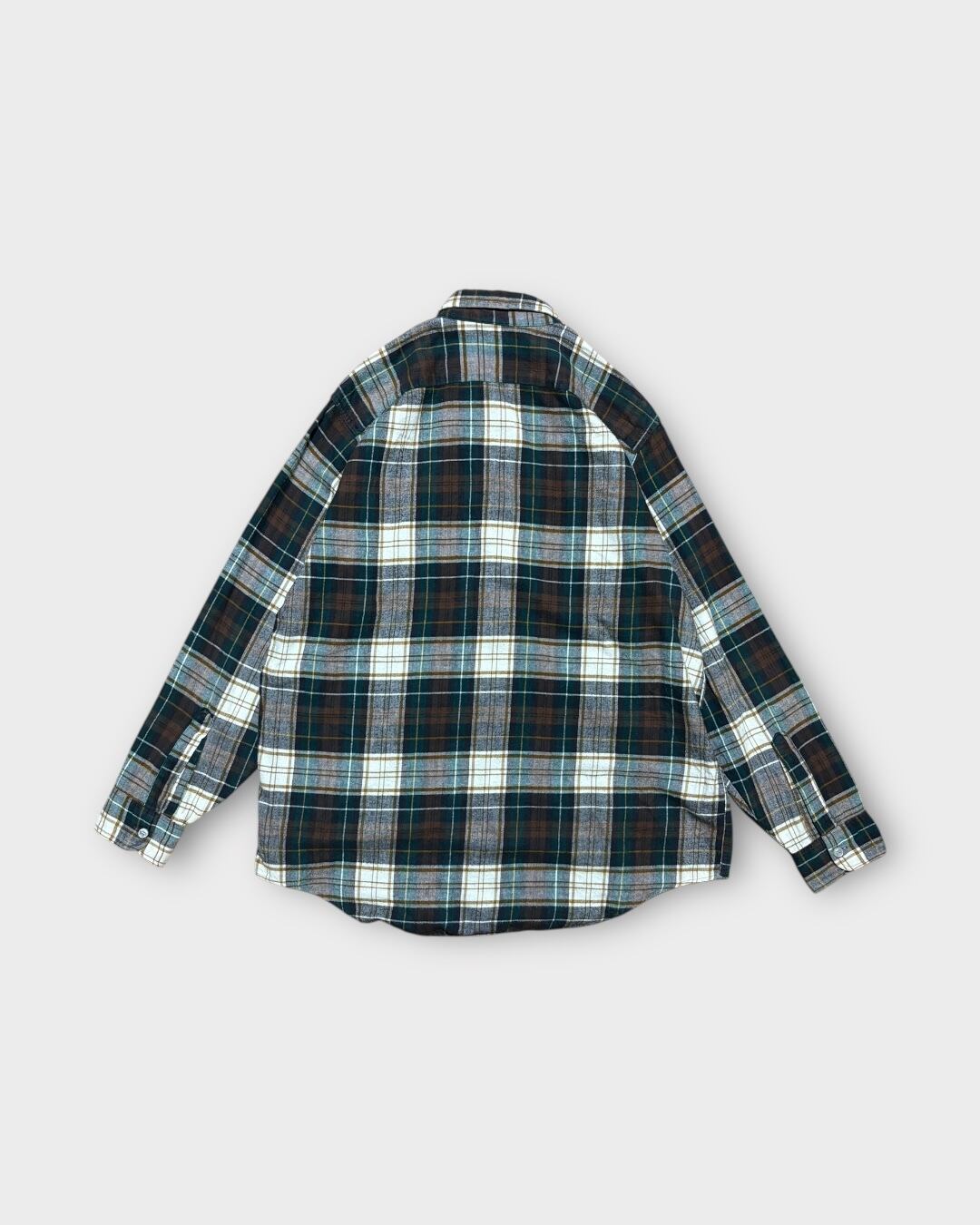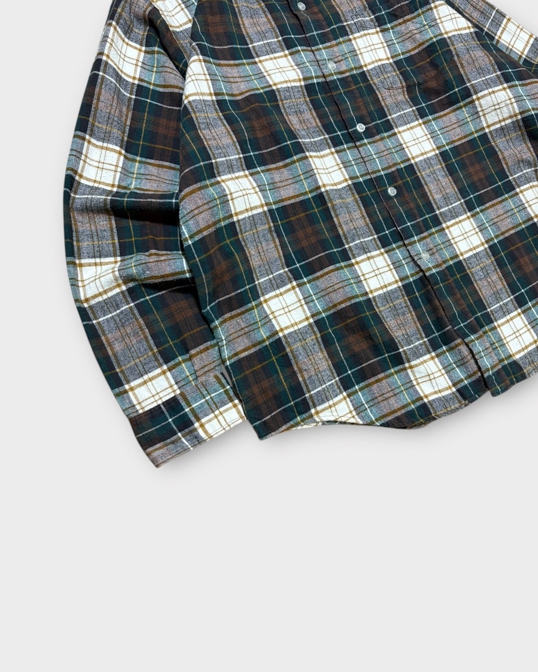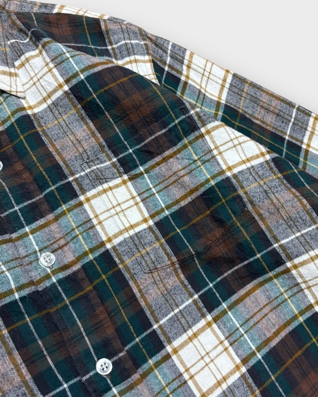 グリーン・ブラウンを基調とした落ち着いた配色で、カジュアルにもナチュラルにも合わせやすい万能なチェック柄。