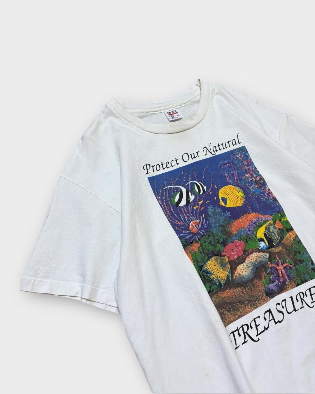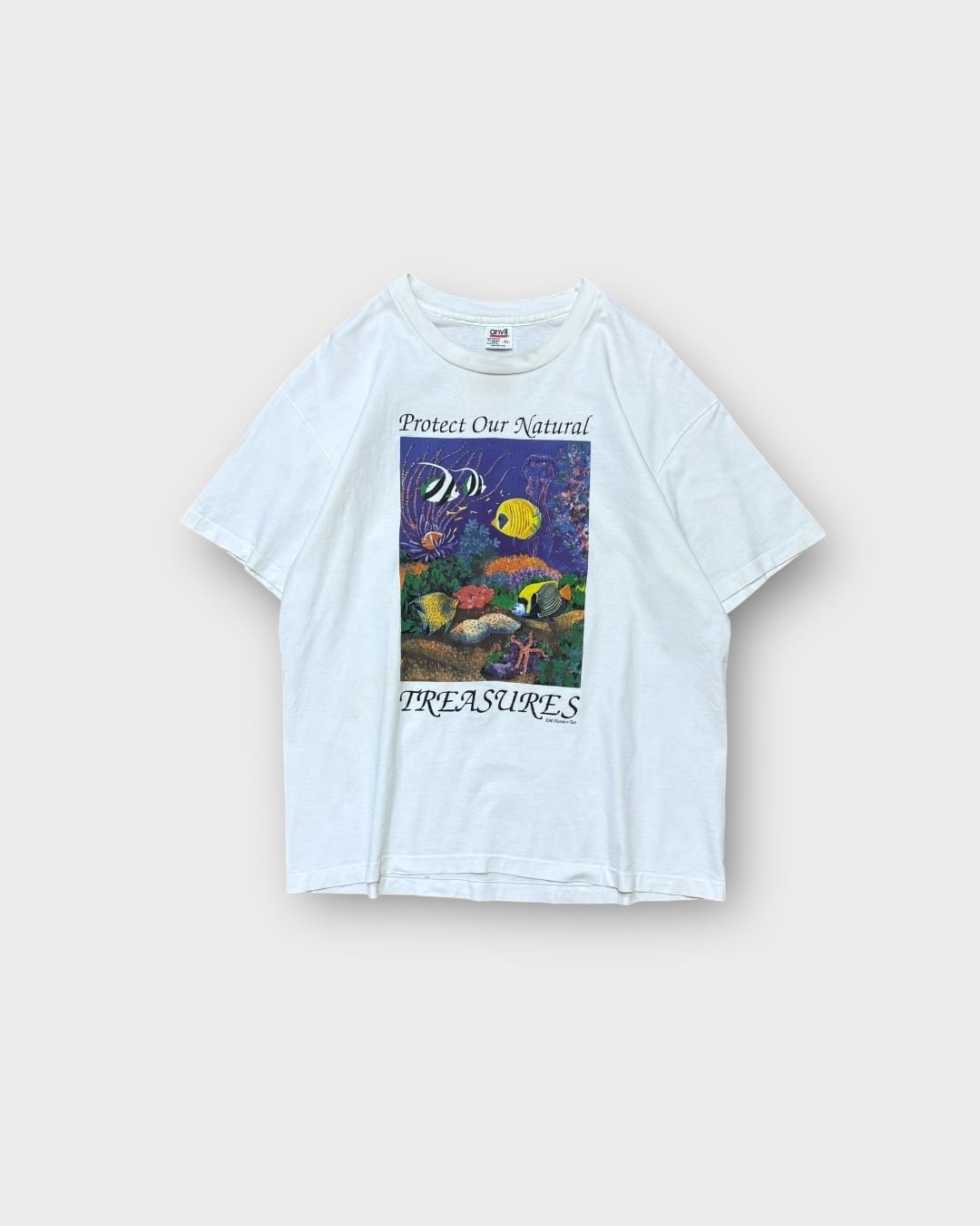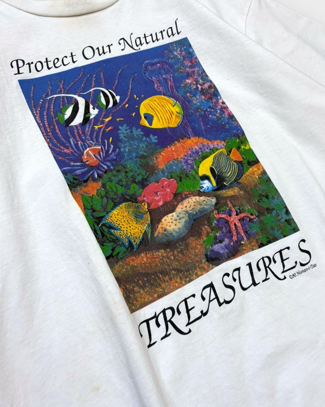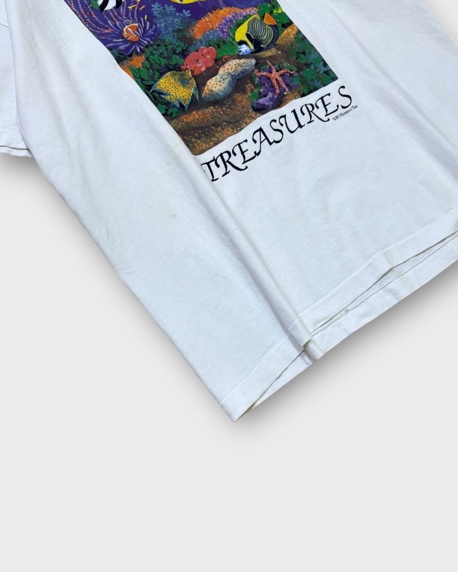 1990年コピーライト入り、「Protect Our Natural Treasures(自然の宝を守ろう)」のスローガンとともに、海の中の美しい生態系を描いたアートプリントが目を引く一着。色彩豊かな魚たちや海中のディテールが描き込まれ、グラフィックとしての完成度も非常に高いです。