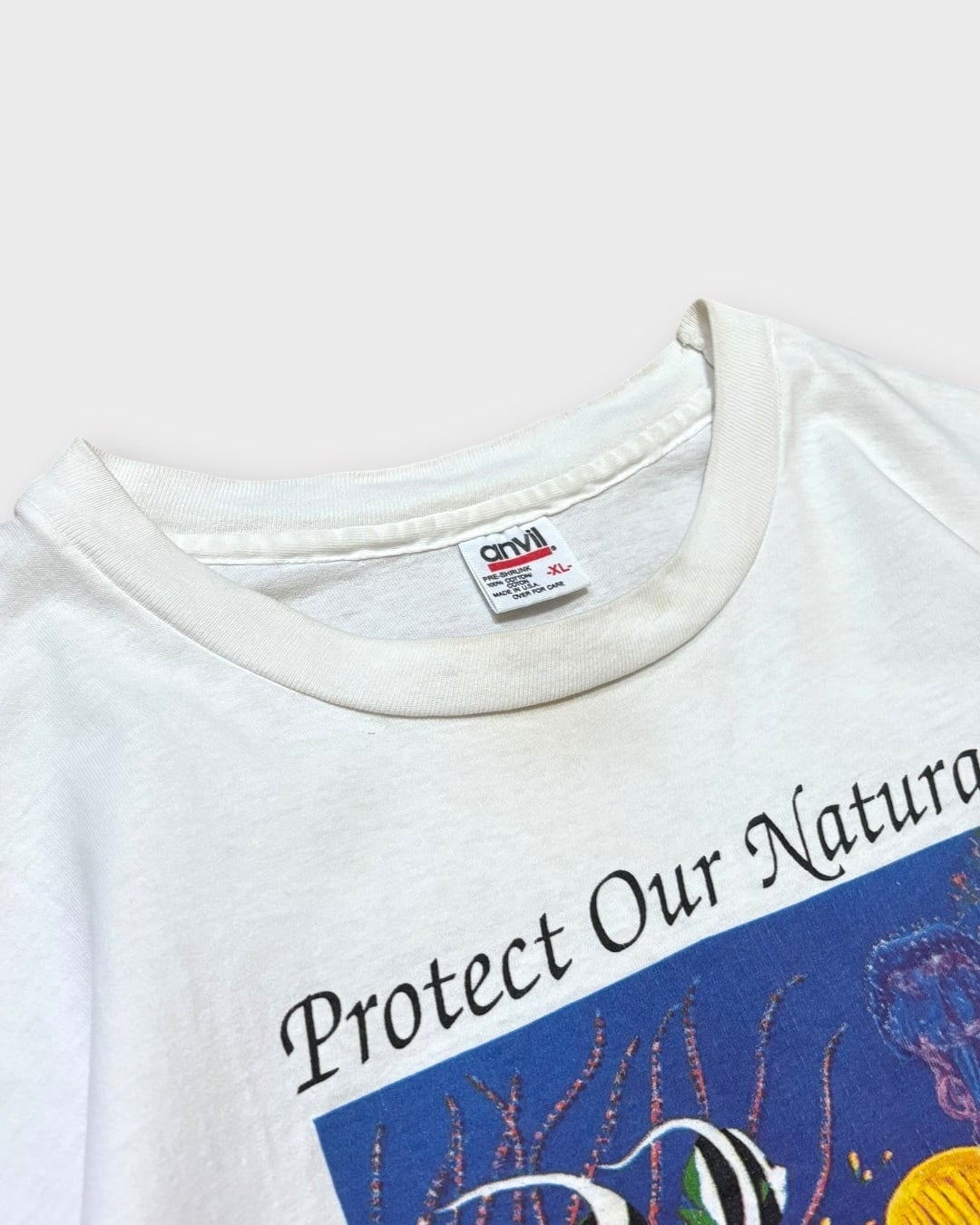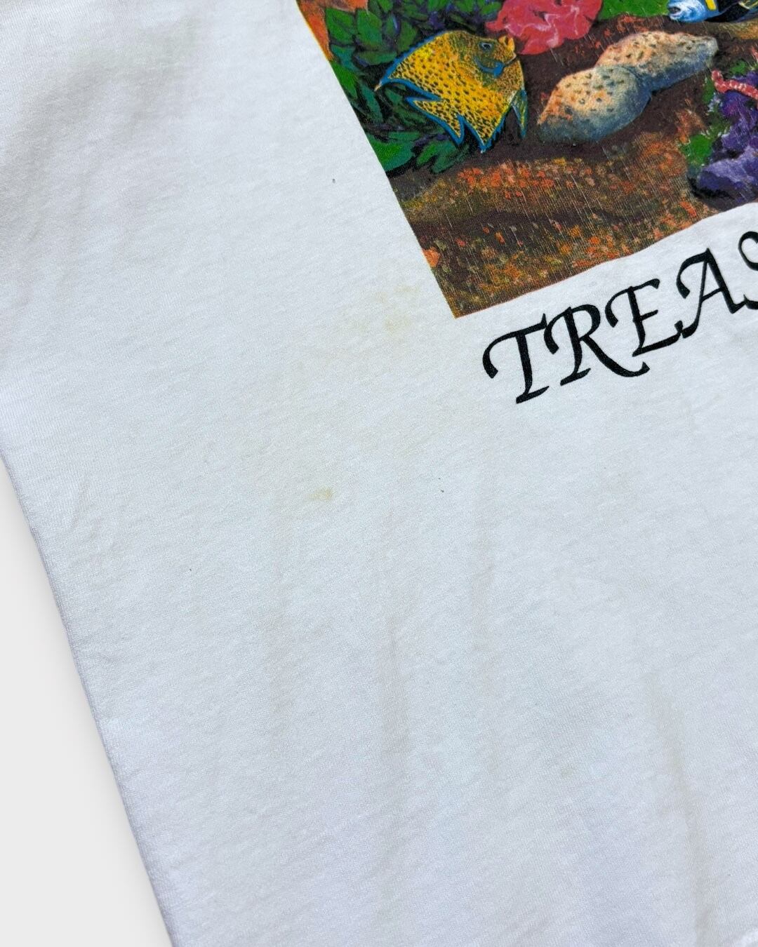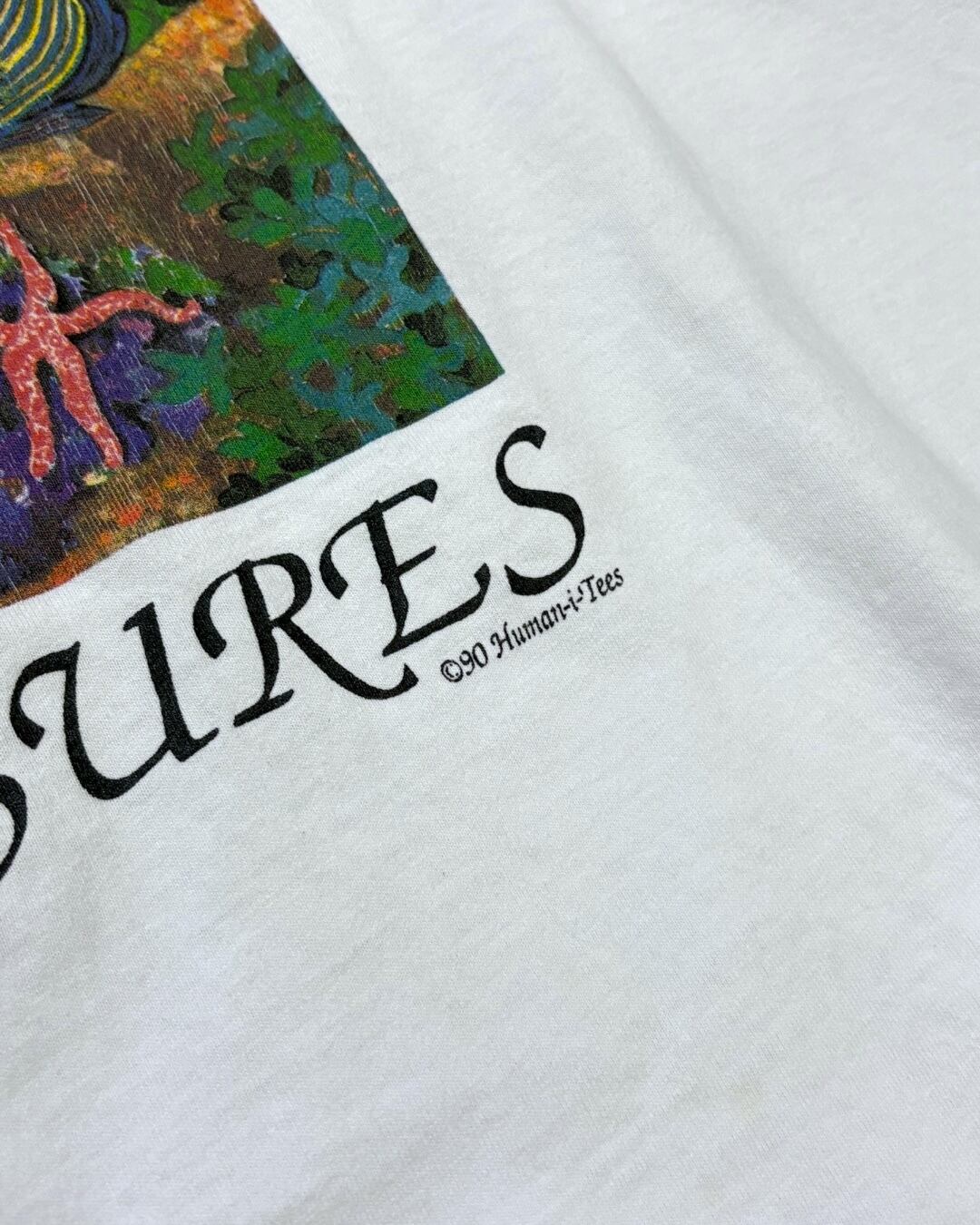 1990年コピーライト入り、「Protect Our Natural Treasures(自然の宝を守ろう)」のスローガンとともに、海の中の美しい生態系を描いたアートプリントが目を引く一着。色彩豊かな魚たちや海中のディテールが描き込まれ、グラフィックとしての完成度も非常に高いです。
