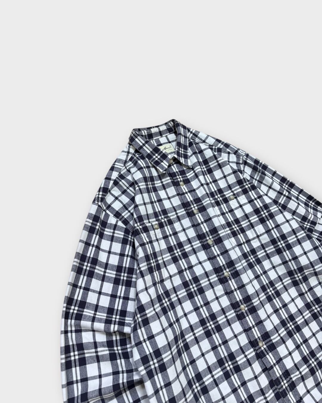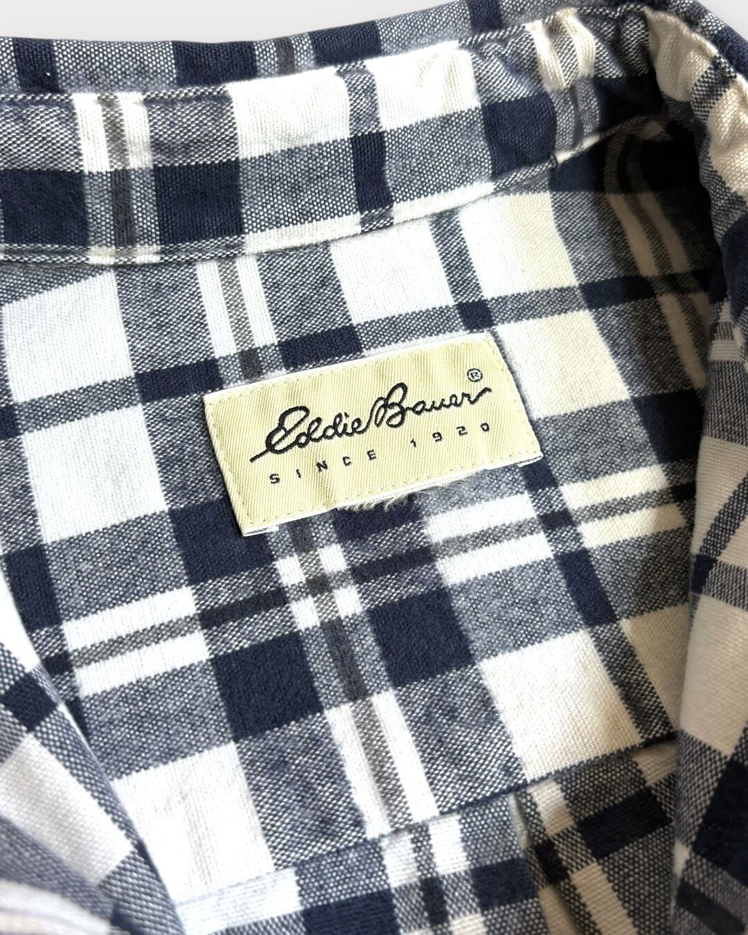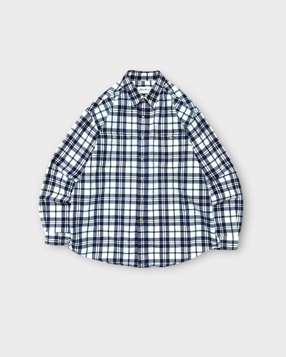 クラシカルなネイビー×ホワイトのチェックが目を引く、Eddie Bauerの長袖シャツ。