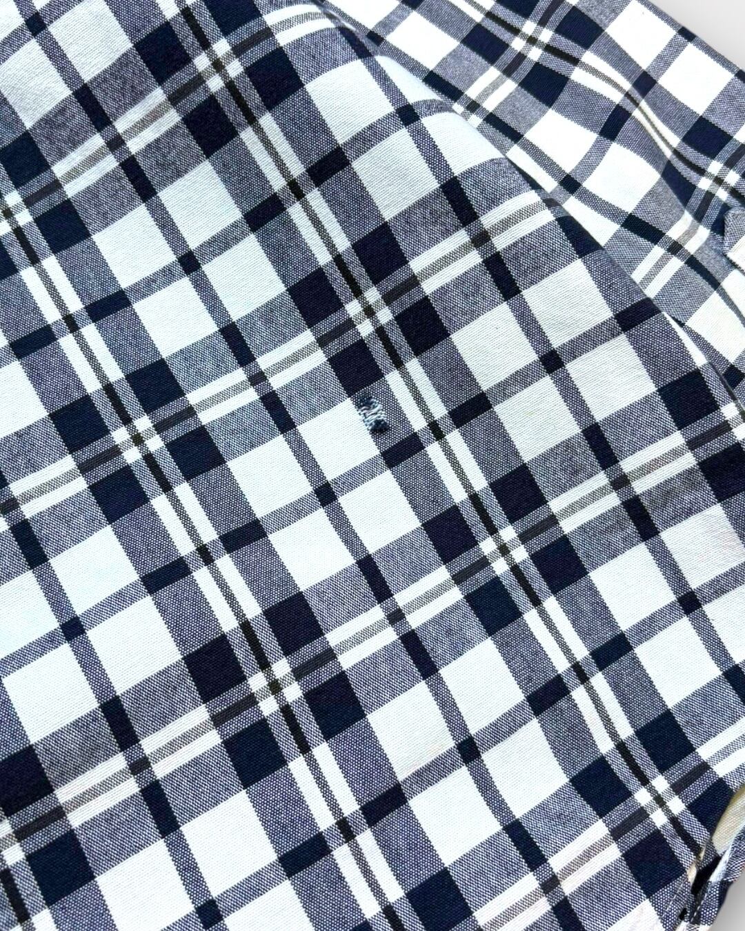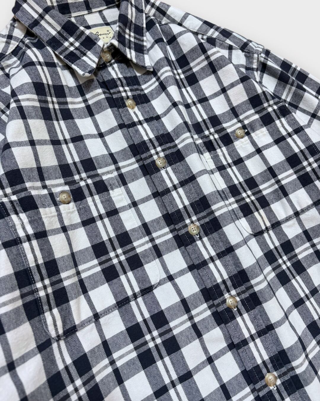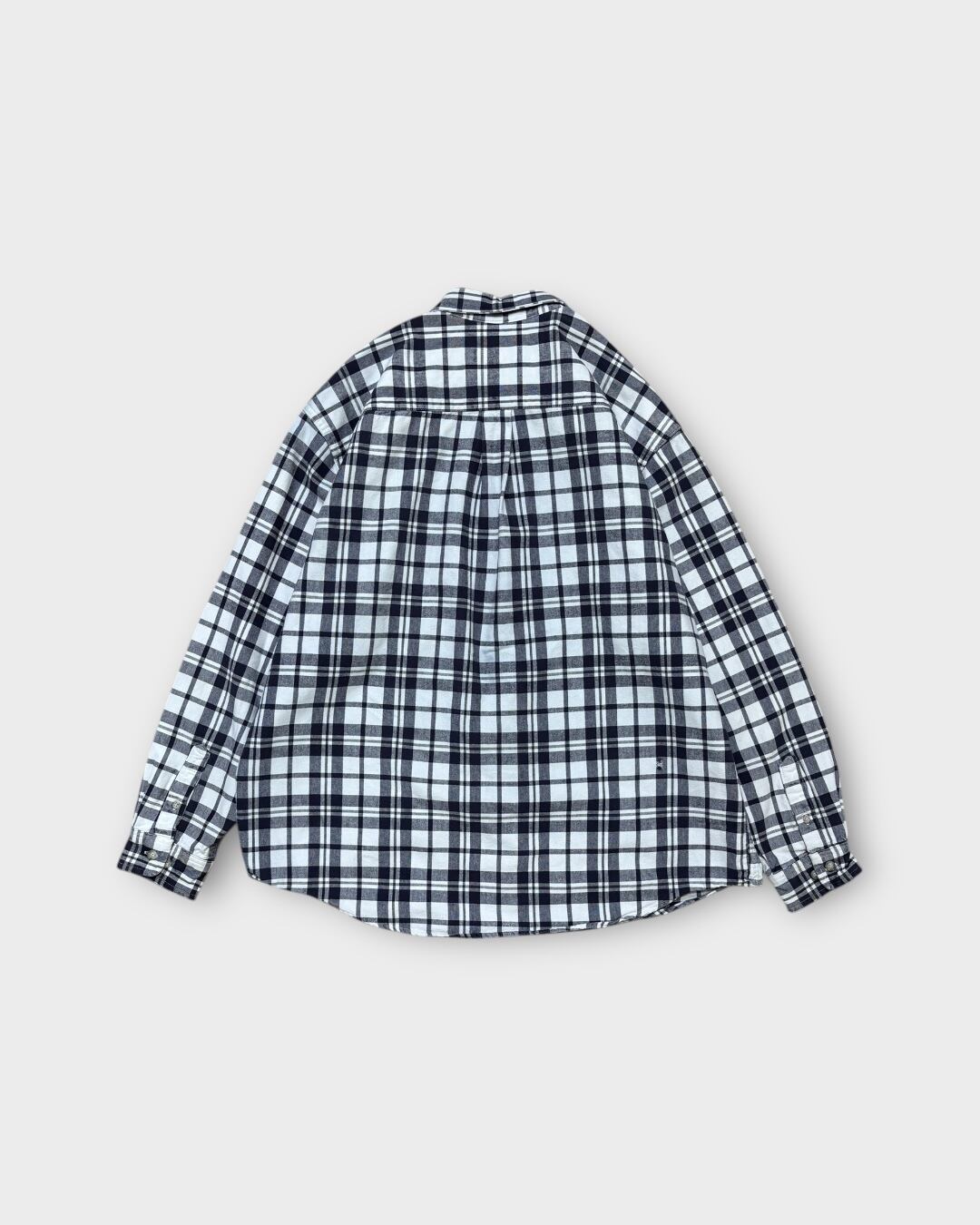 クラシカルなネイビー×ホワイトのチェックが目を引く、Eddie Bauerの長袖シャツ。