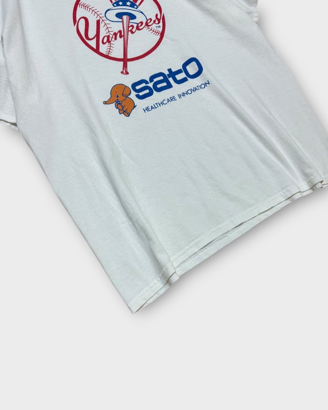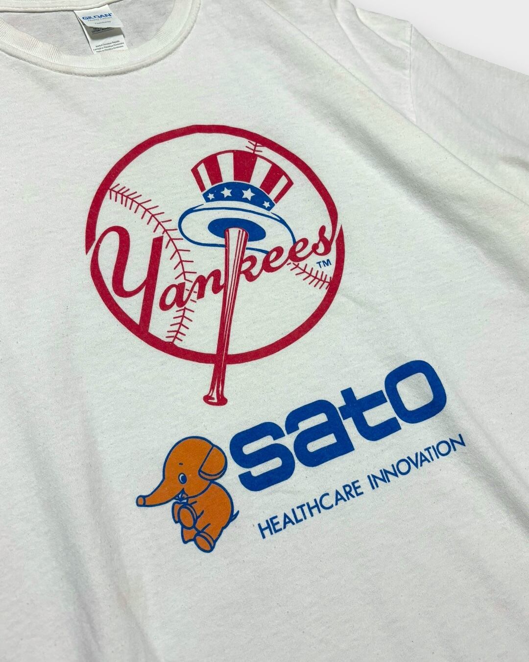 ヤンキースのクラシックロゴと、日本の製薬会社「佐藤製薬(sato)」のロゴが並ぶ、インパクトある企業コラボTシャツ。