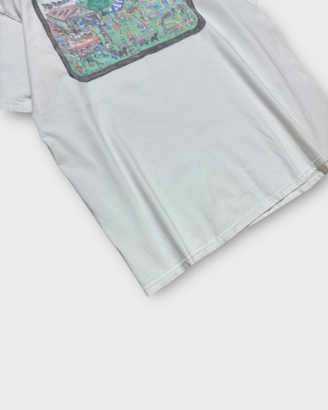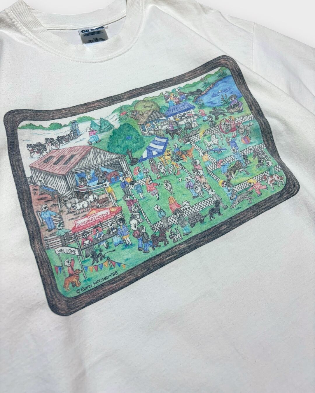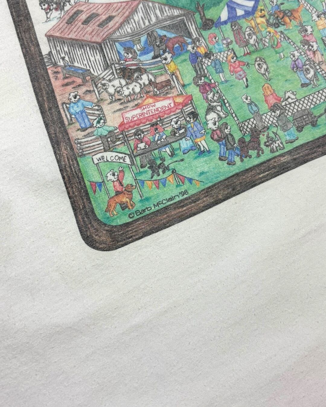 1998年のアートワーク「Barb McClain」によるドッグショーのにぎわいを描いた、温かみのあるグラフィックTシャツ。