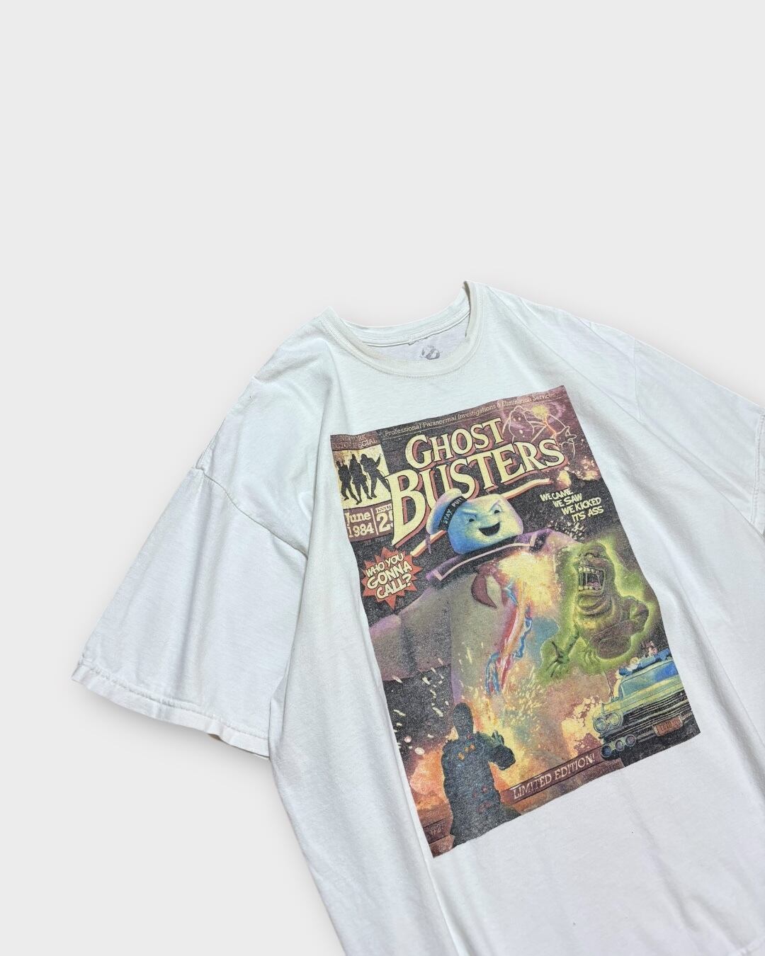 1984年公開の映画『ゴーストバスターズ』の世界観を落とし込んだ、コミック調アートが主役のプリントTシャツ。
