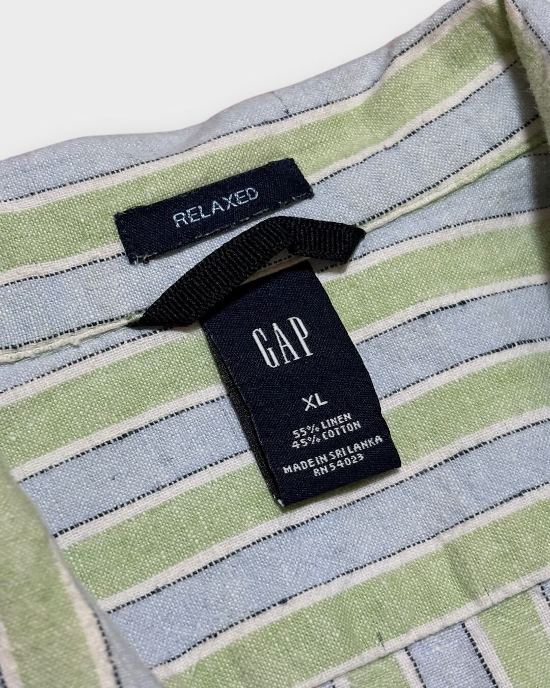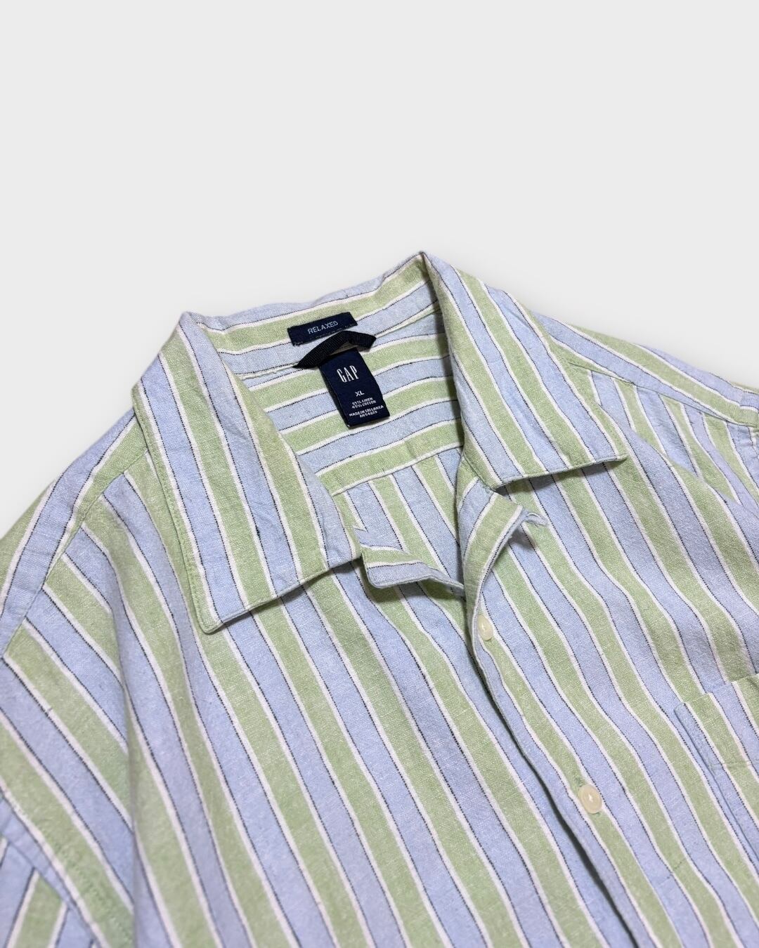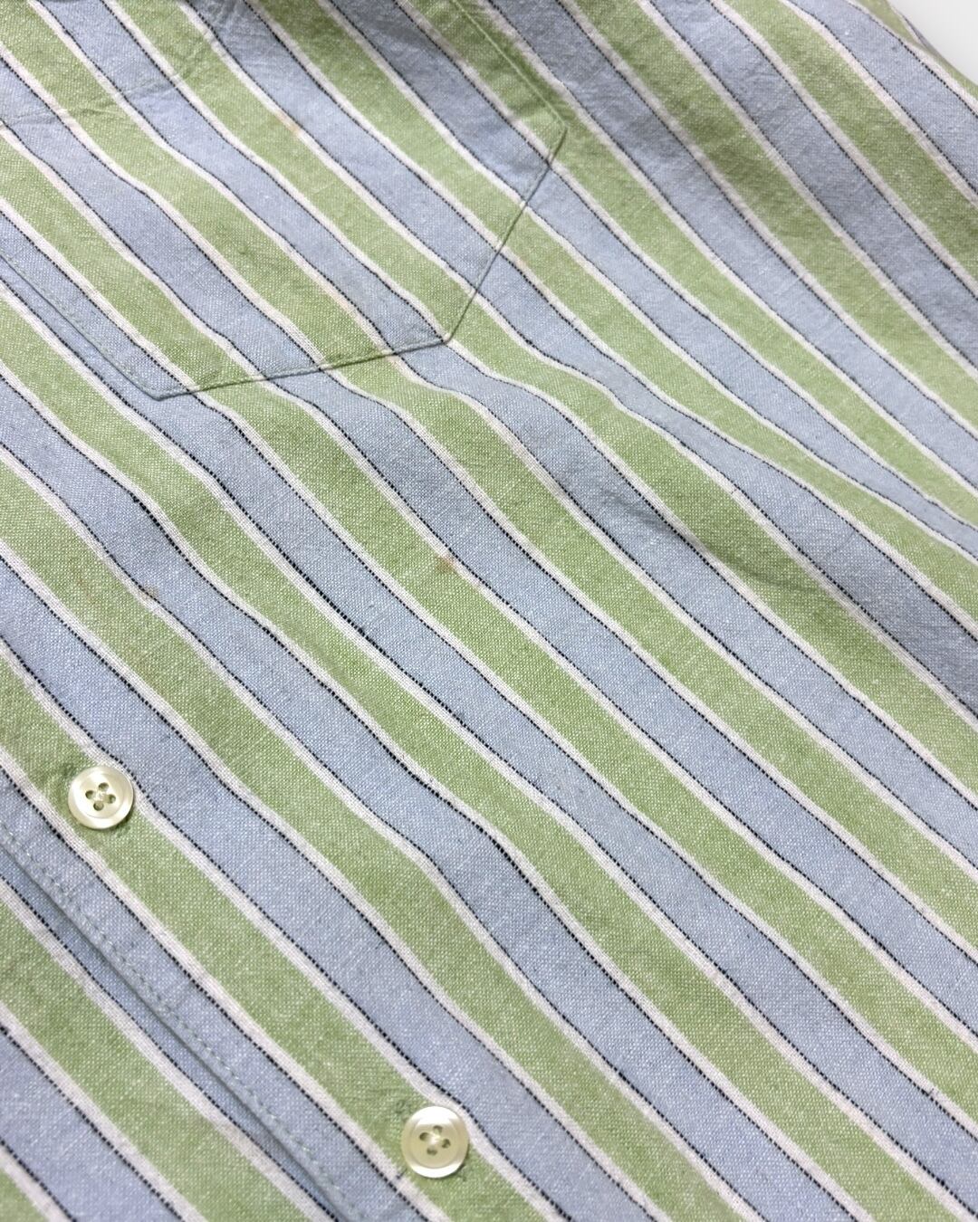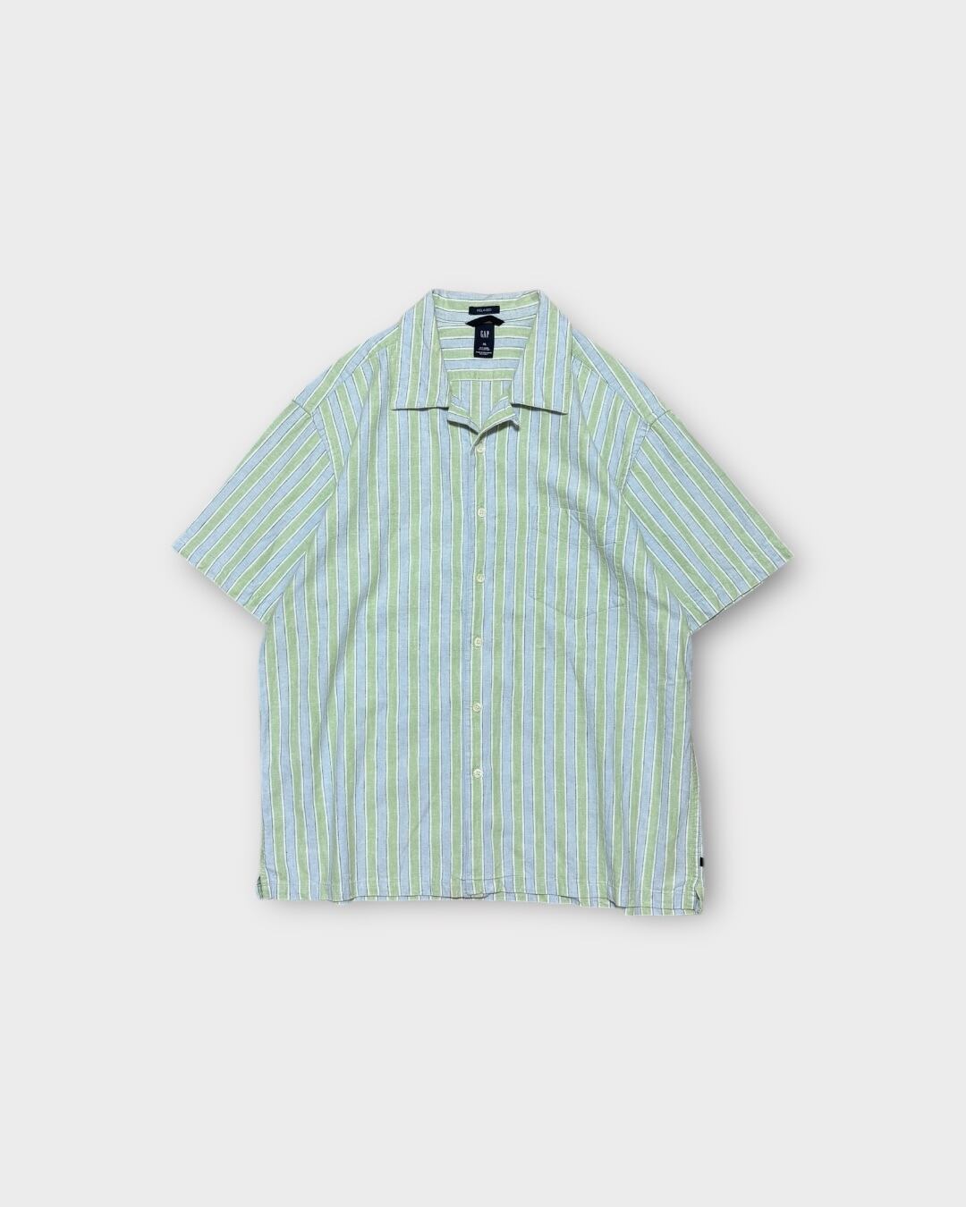 2000年代、GAPのリネンコットン混ストライプシャツ。ライトグリーンとブルーを組み合わせた爽やかな色使いが印象的な一枚です。リネン特有のざらっとした質感に、コットンの柔らかさが加わった、さらりと軽い着心地。