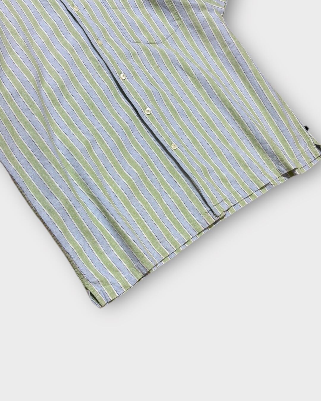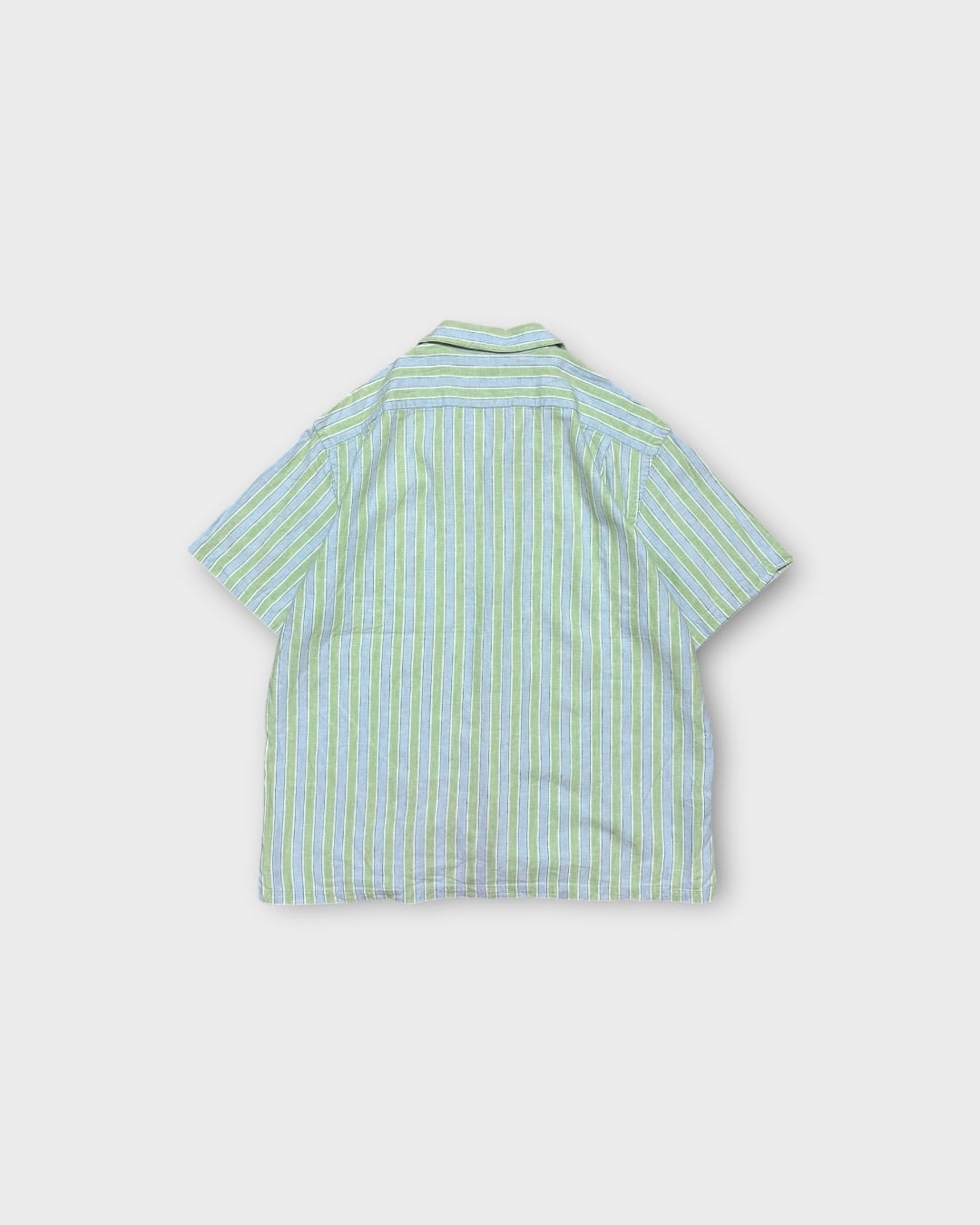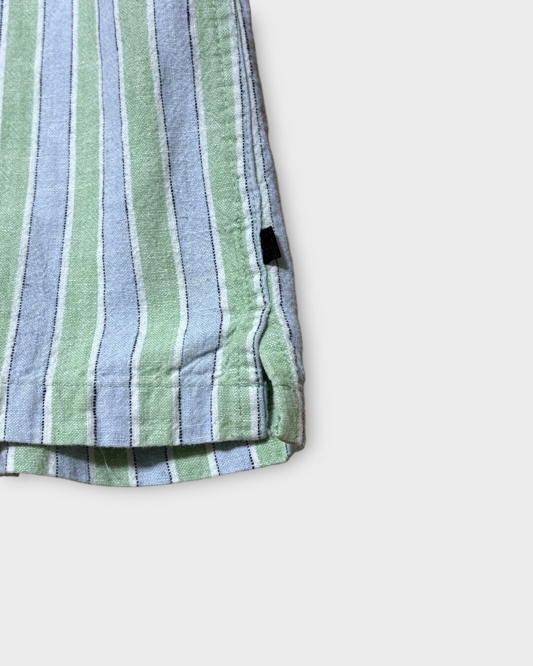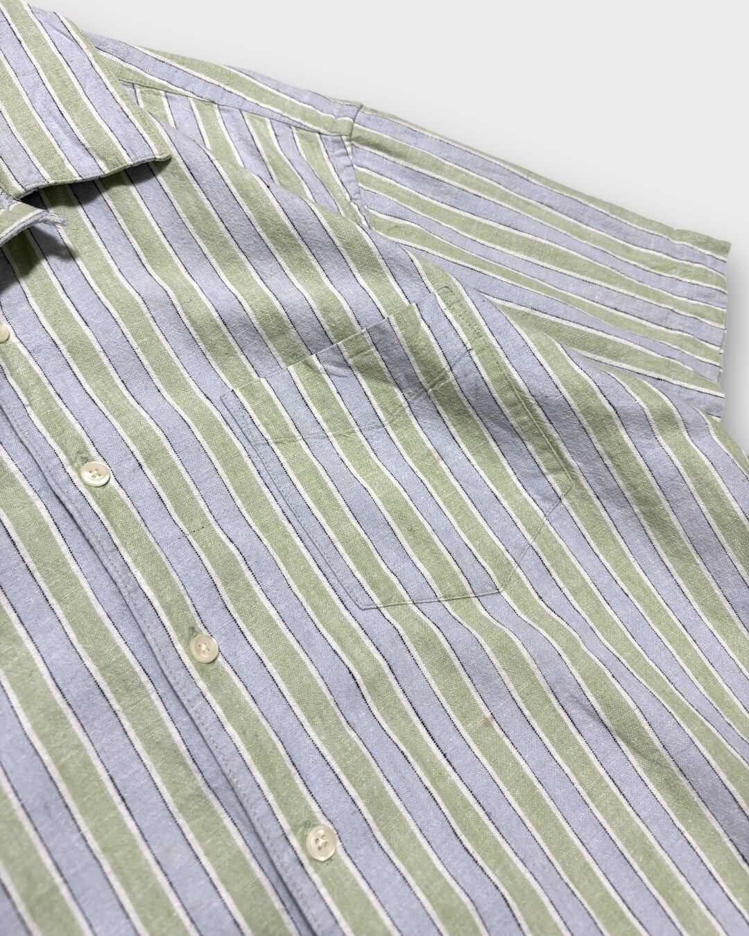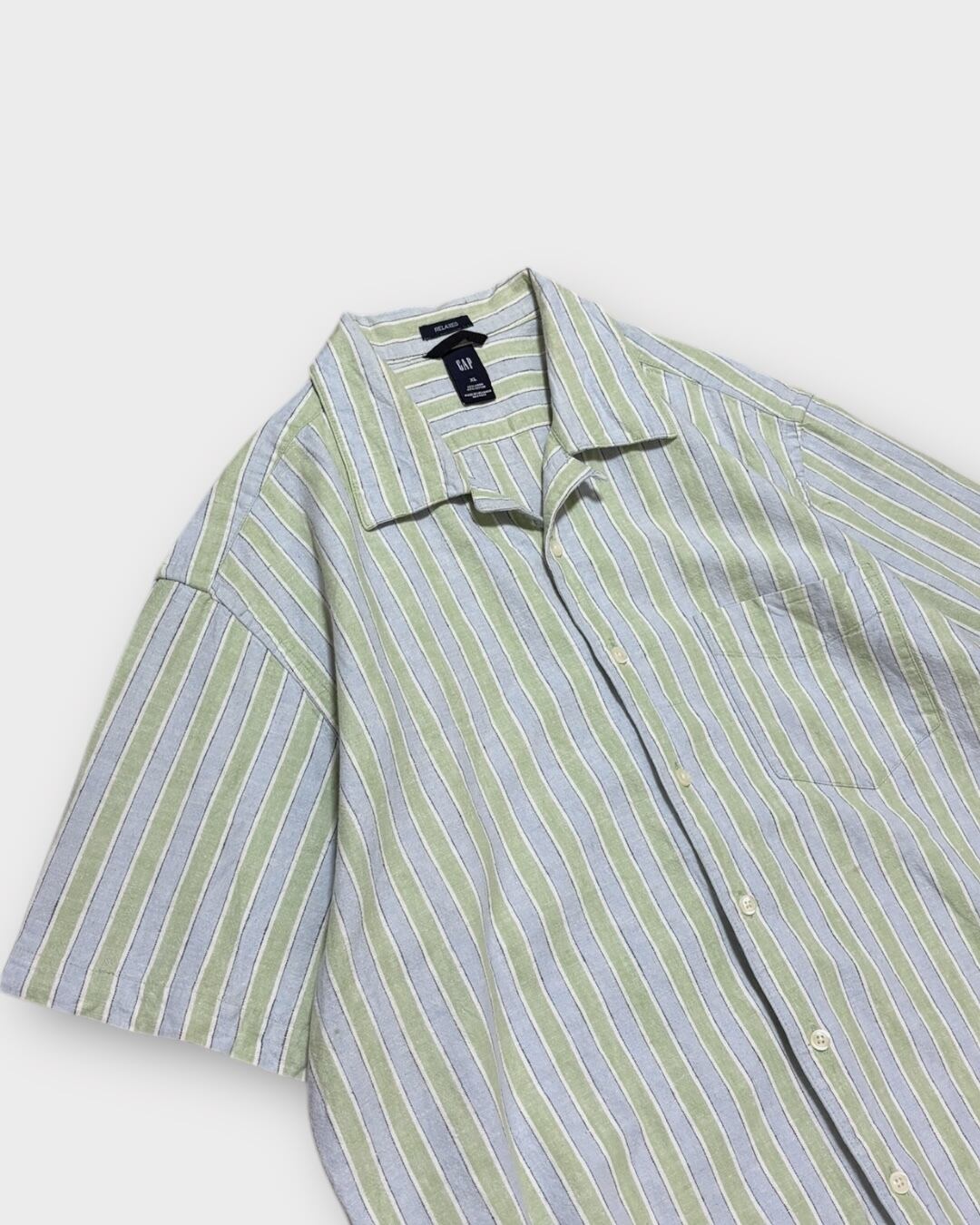 2000年代、GAPのリネンコットン混ストライプシャツ。ライトグリーンとブルーを組み合わせた爽やかな色使いが印象的な一枚です。リネン特有のざらっとした質感に、コットンの柔らかさが加わった、さらりと軽い着心地。