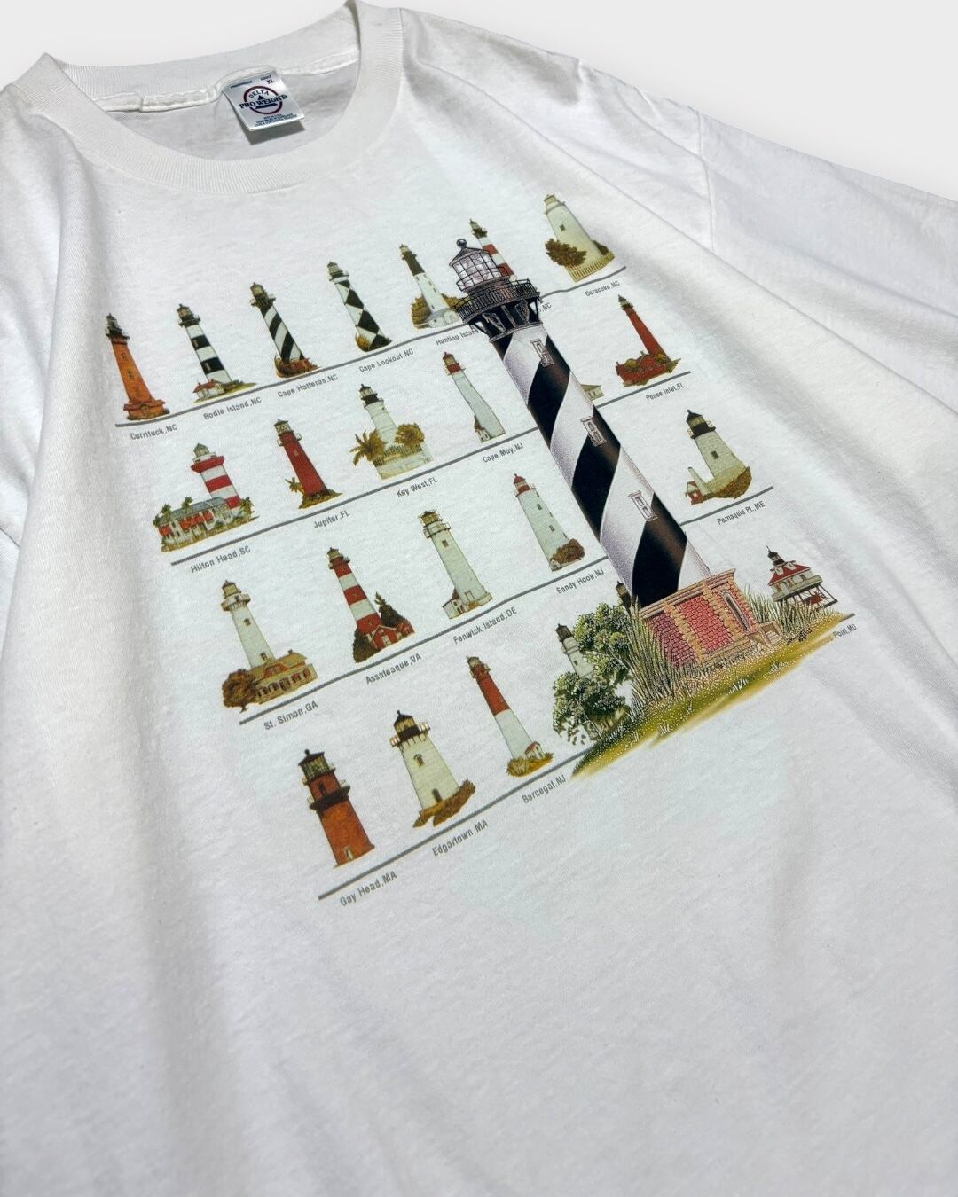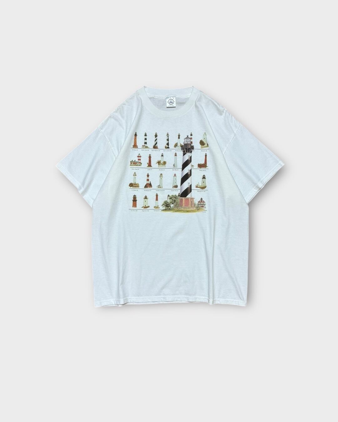 灯台がずらりと並んだユニークなグラフィックが目を引くプリントTシャツ。