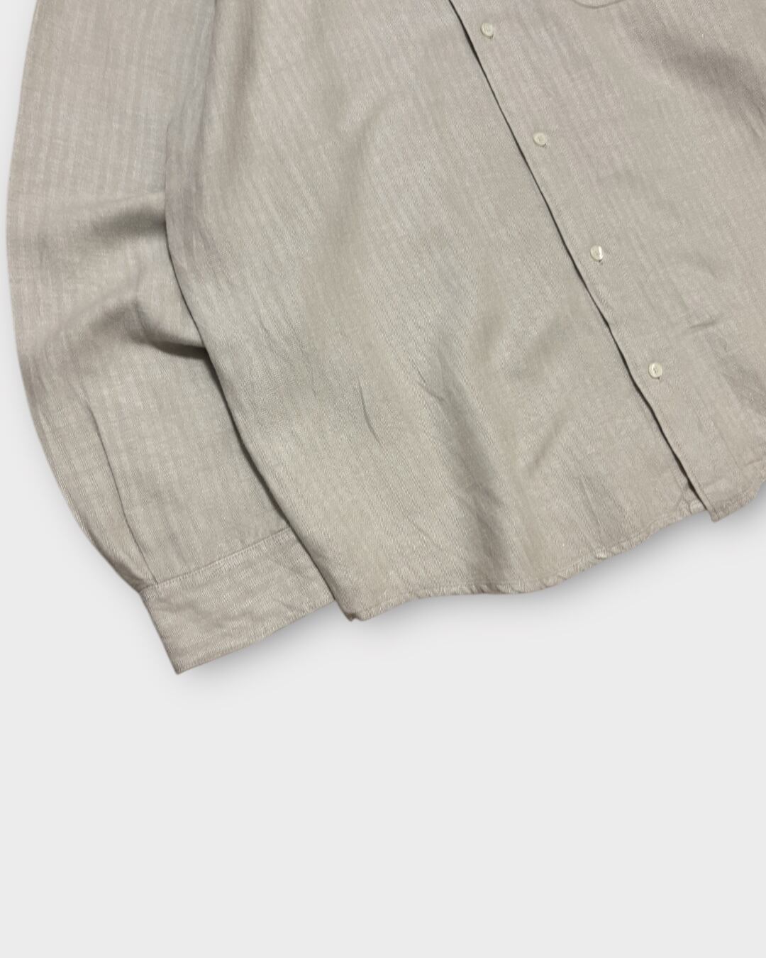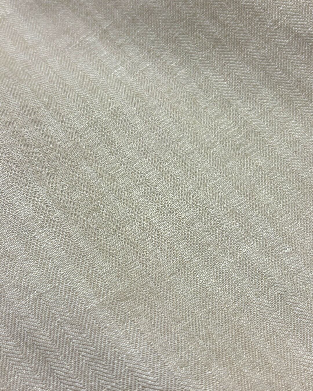 ナチュラルトーンのボディに、繊細なヘリンボーン織りが走るリネンレーヨンの長袖シャツ。