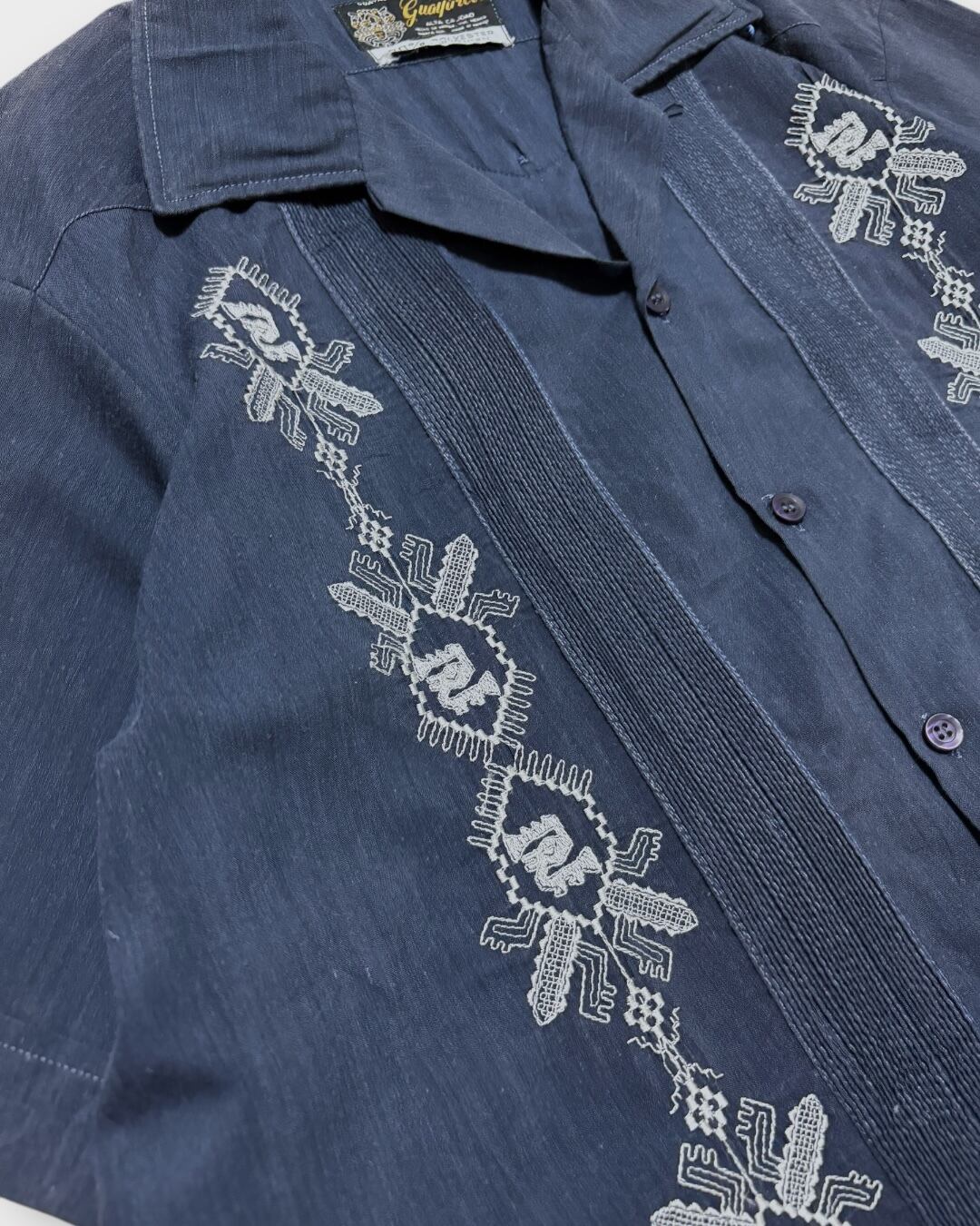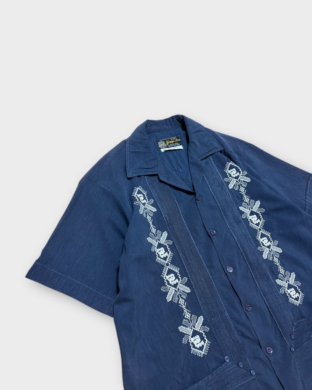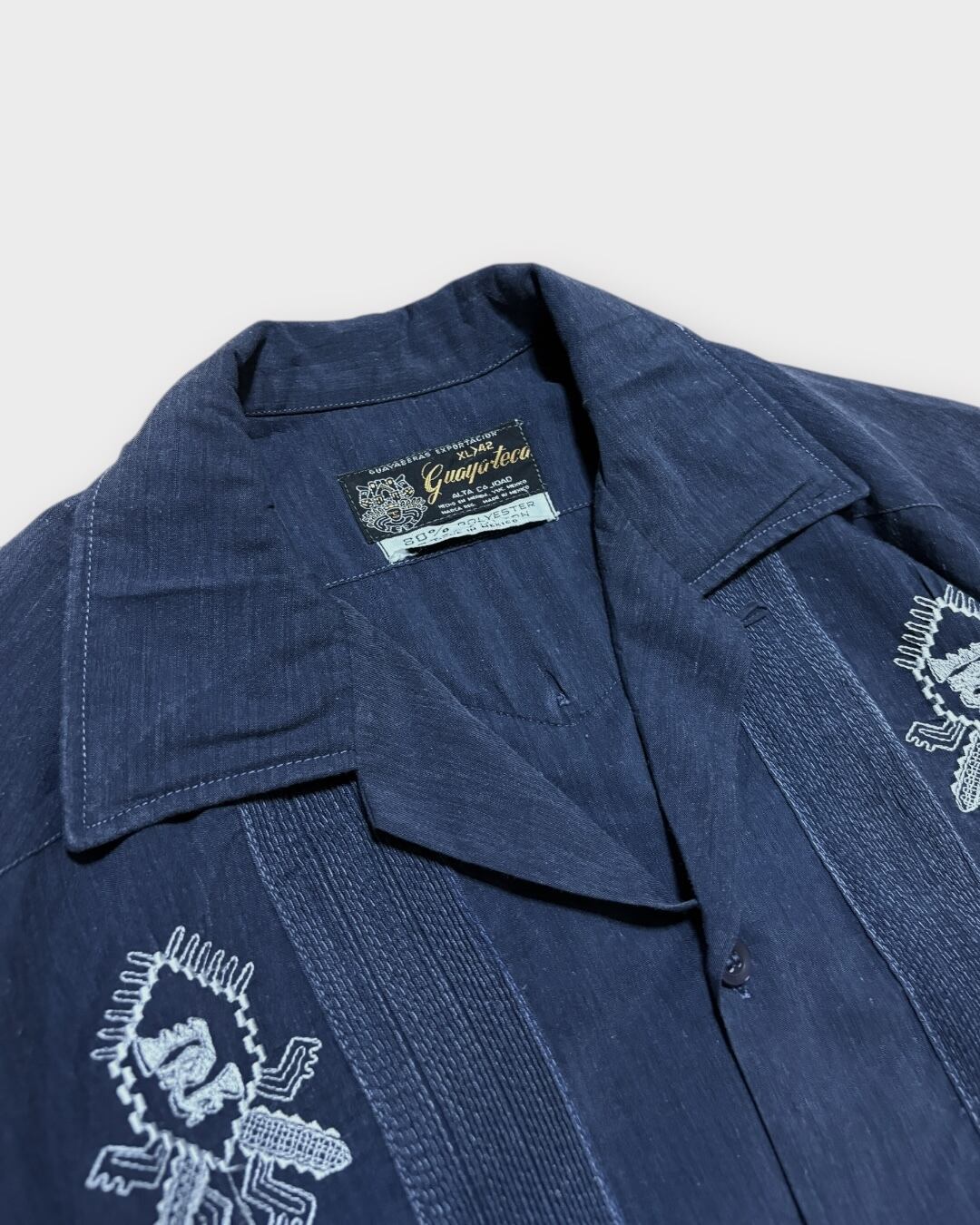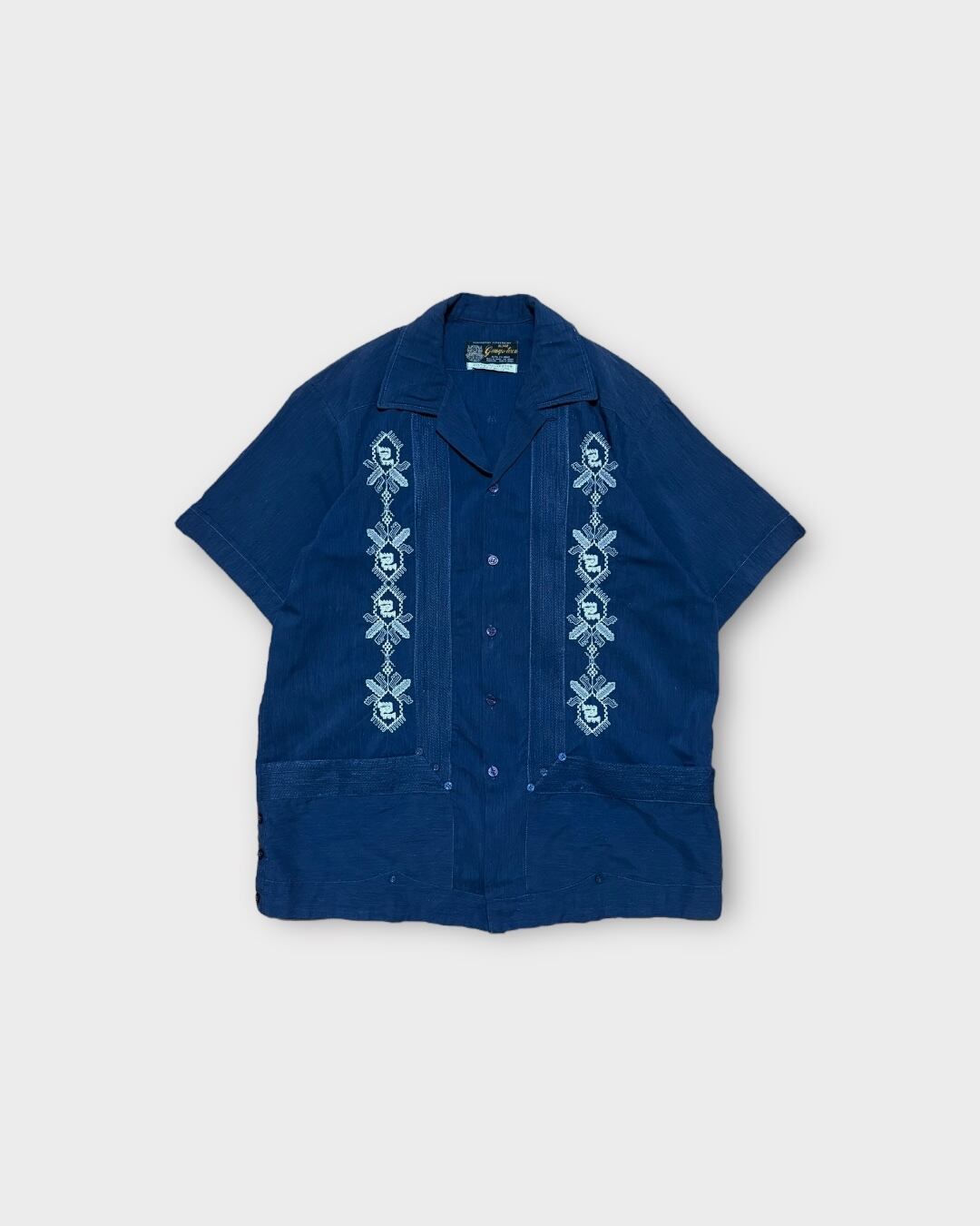 1970年代頃のメキシコ製キューバシャツ。若干フェード感のあるネイビーブルーのボディに、独特なモチーフ刺繍がフロントにびっしりと並ぶ存在感ある一枚です。
