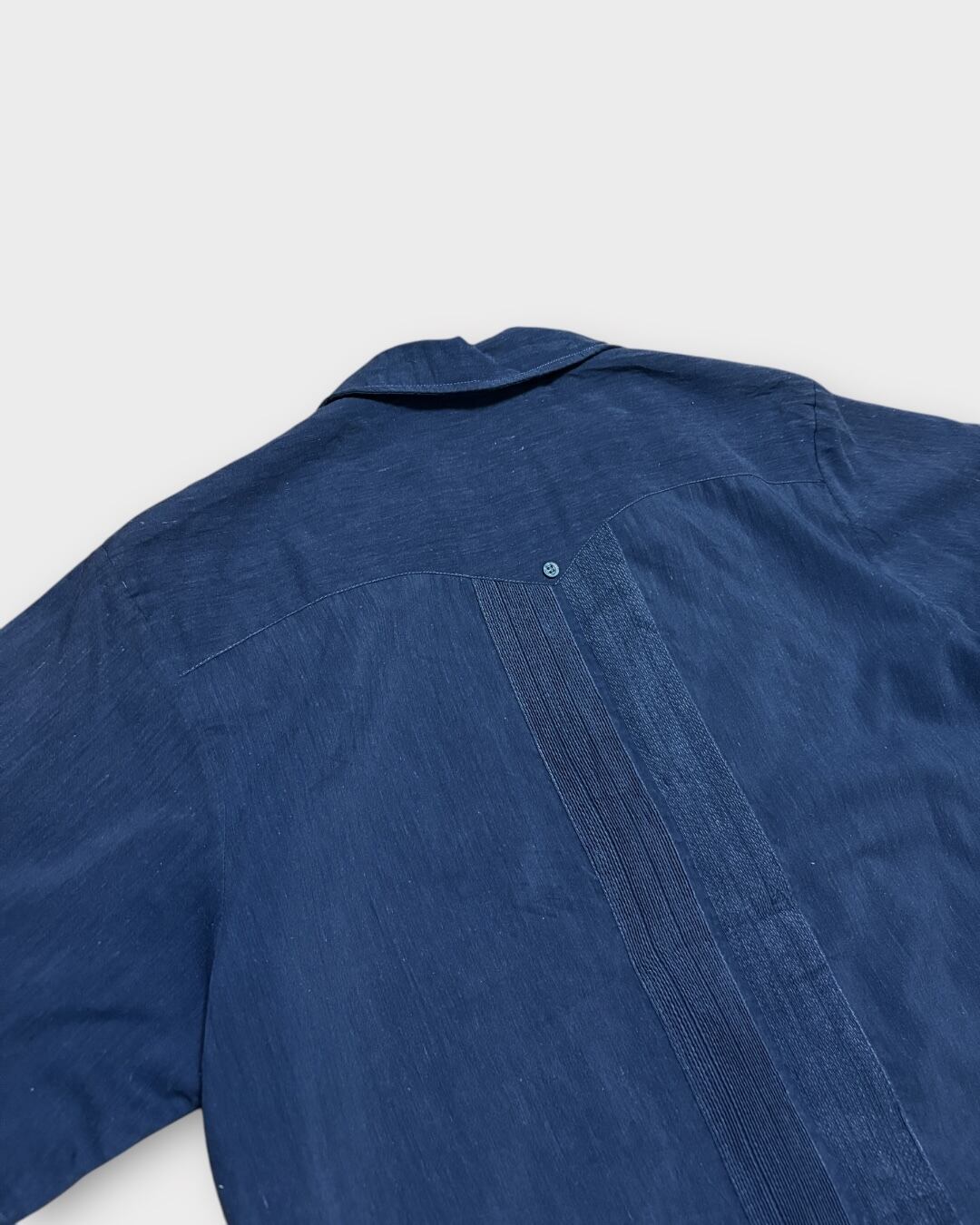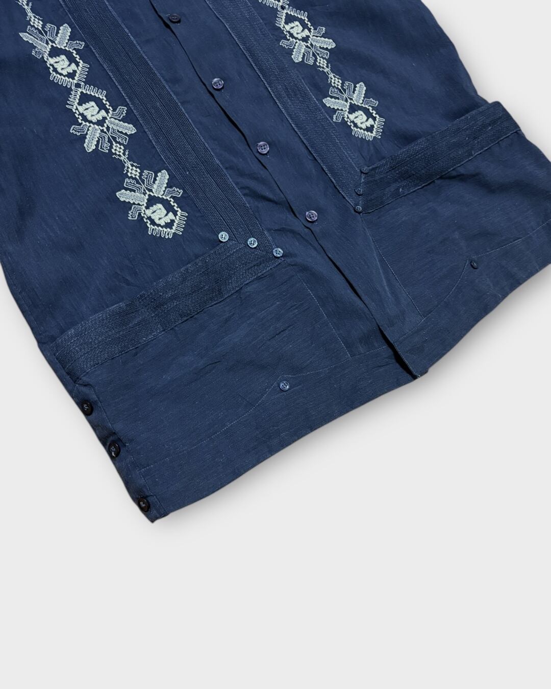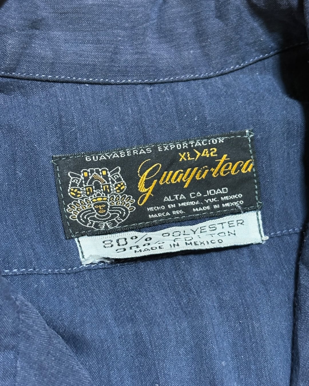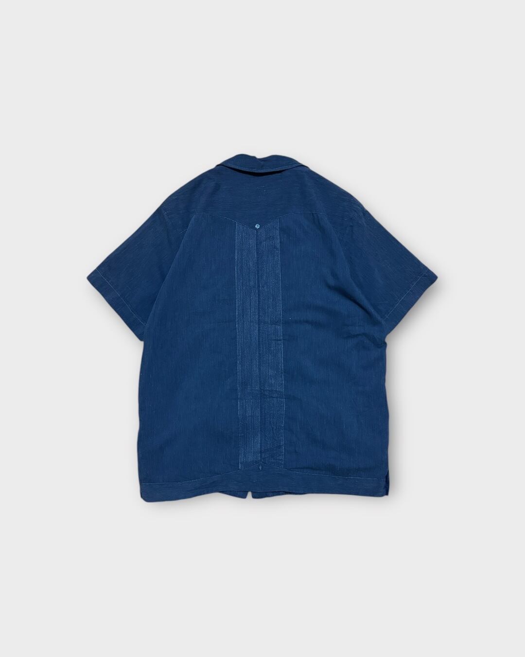1970年代頃のメキシコ製キューバシャツ。若干フェード感のあるネイビーブルーのボディに、独特なモチーフ刺繍がフロントにびっしりと並ぶ存在感ある一枚です。
