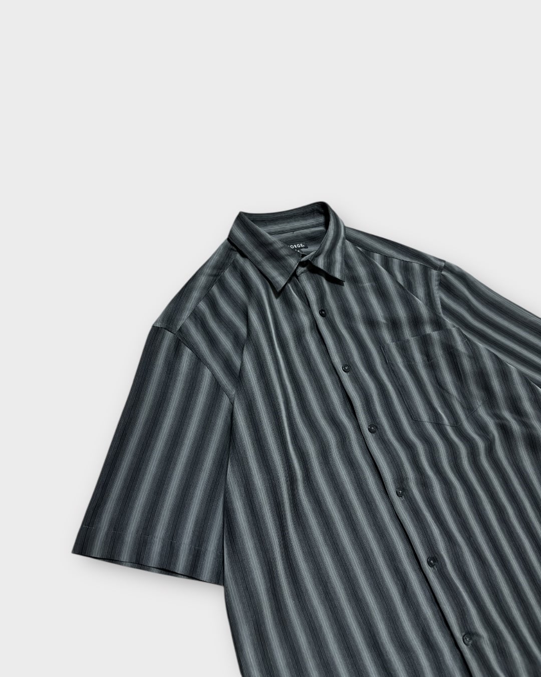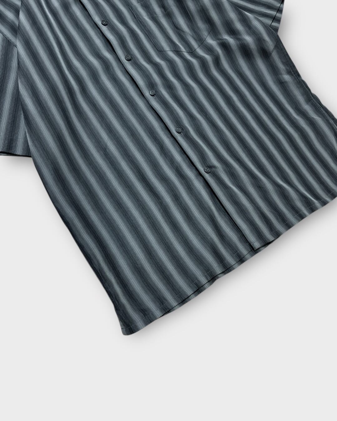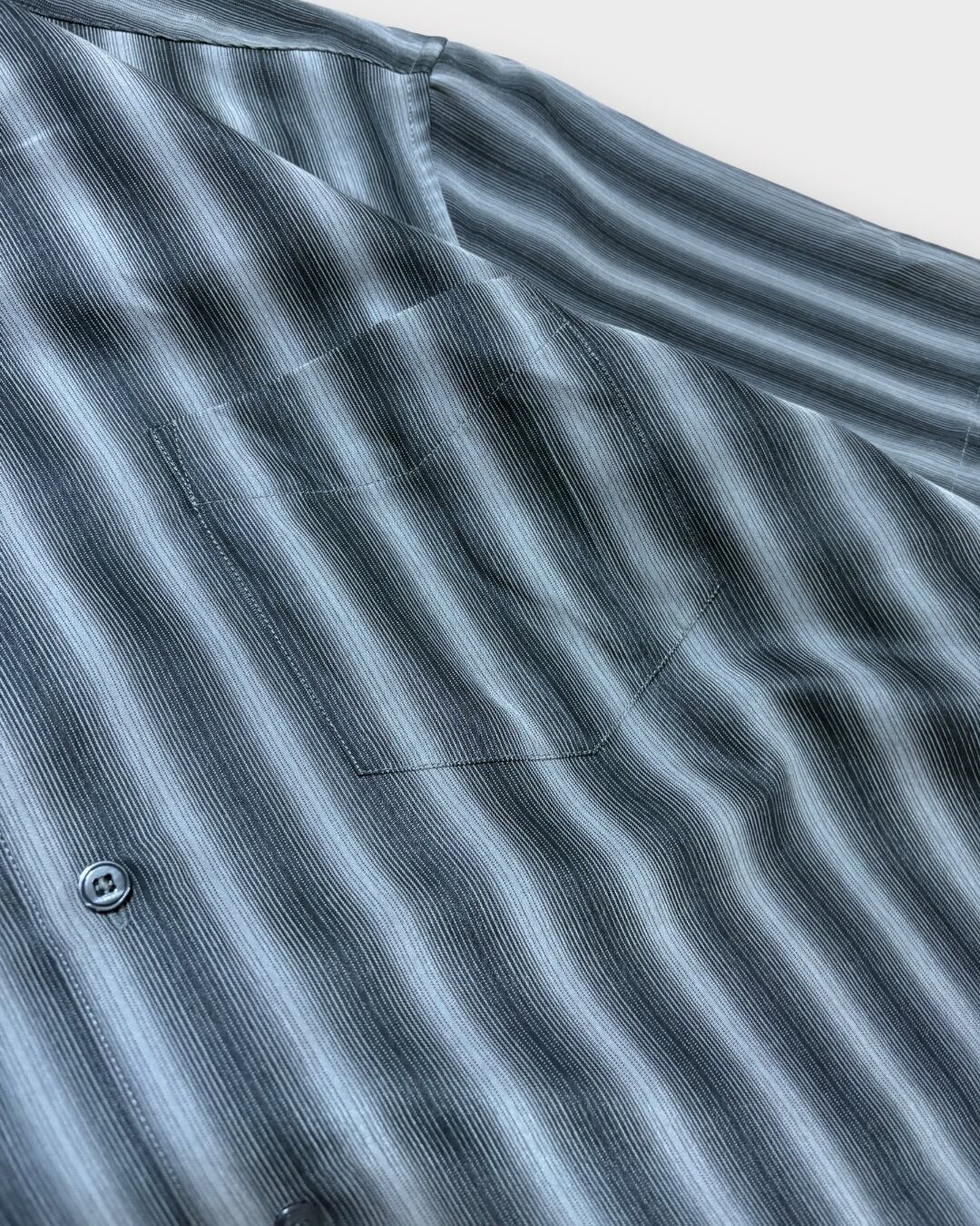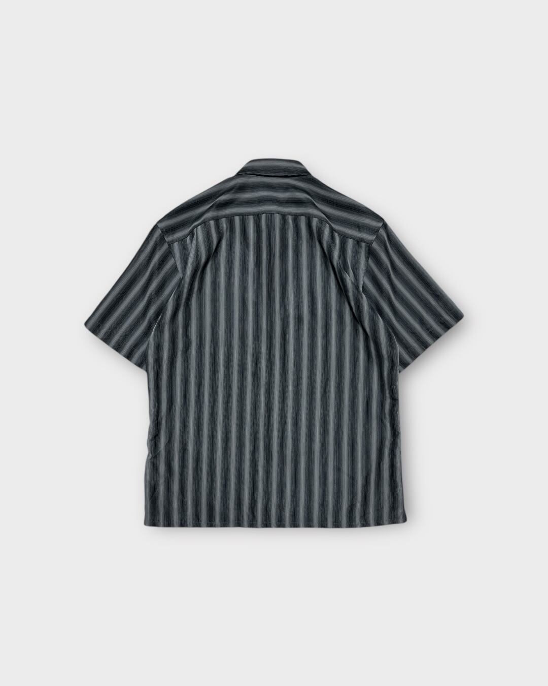 グレー〜ブラックを基調にしたストライプ柄が印象的なポリエステルシャツ。