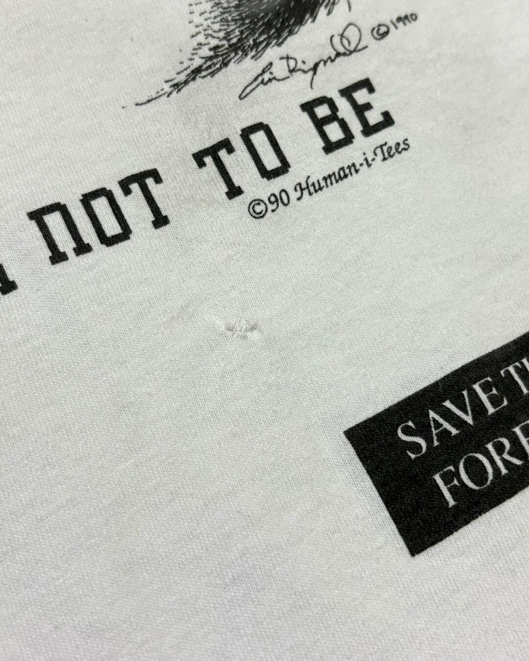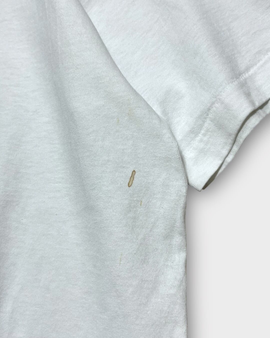コンディションとしては、フロント中央に小さなリペア、脇にサビ汚れが見られますが、着用には問題のない範囲。グラフィックやメッセージ性を楽しめる、ヴィンテージTシャツならではの一着です。