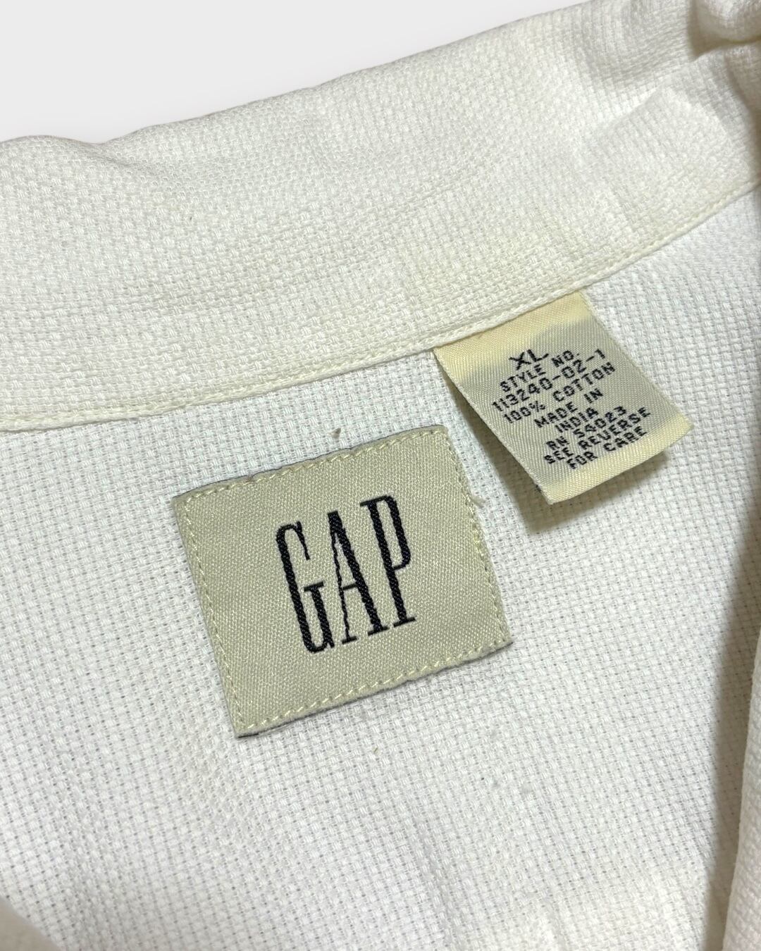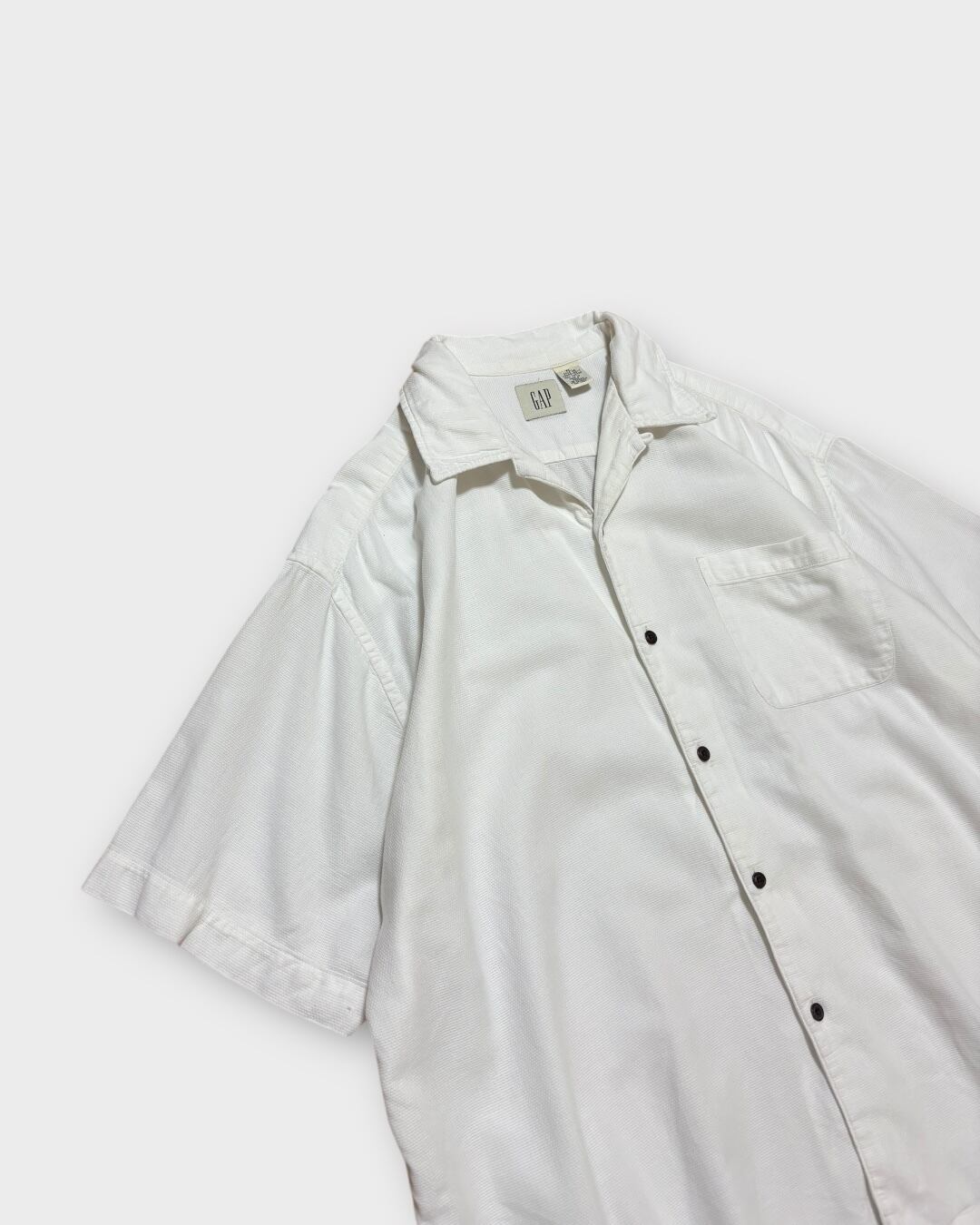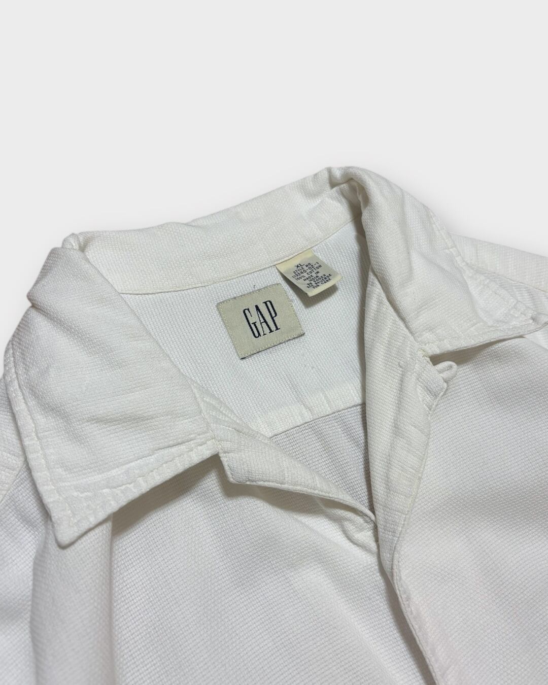 2000年代のGAP製で、光沢を抑えたホワイトカラーにブラウンのボタンが映えるミニマルな一枚です。