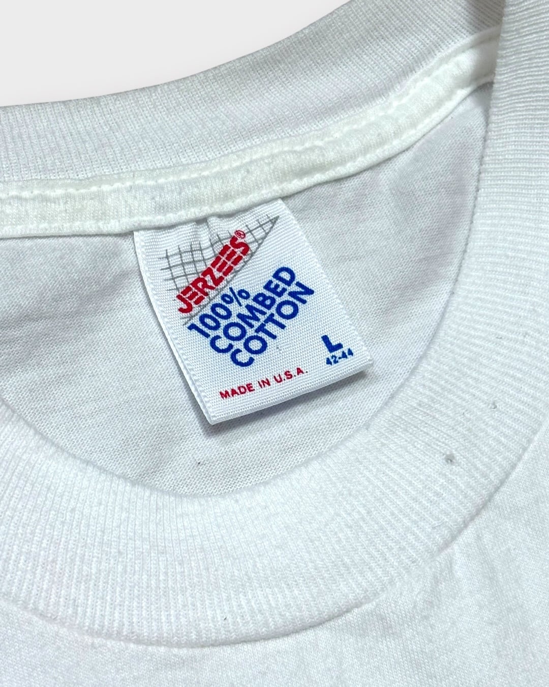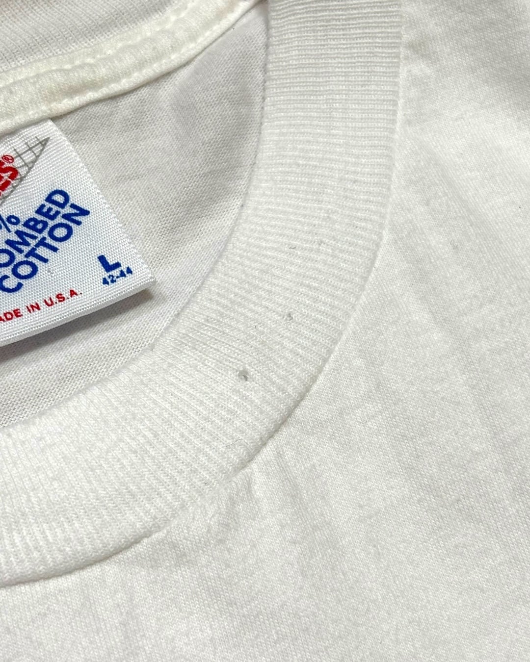 ボディはJERZEESの100%コームドコットン、MADE IN USA仕様。タイトめなLサイズで、全体的にややコンパクトなシルエット。袖はシングルステッチ、ネックはしっかりとしたリブ仕様になっており、古着Tらしいディテールも健在です。
