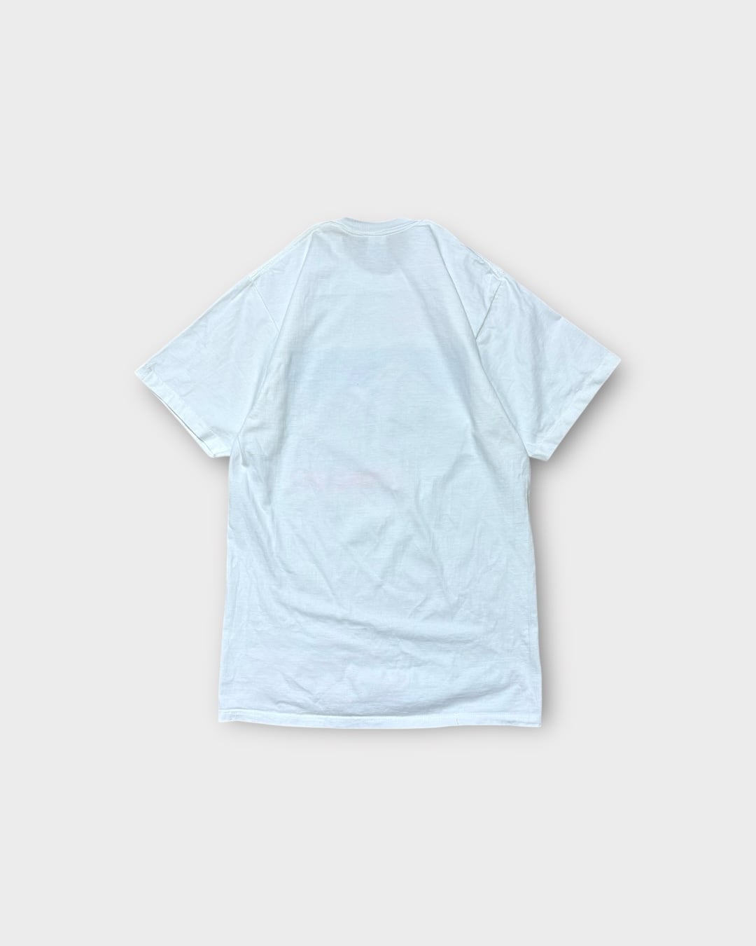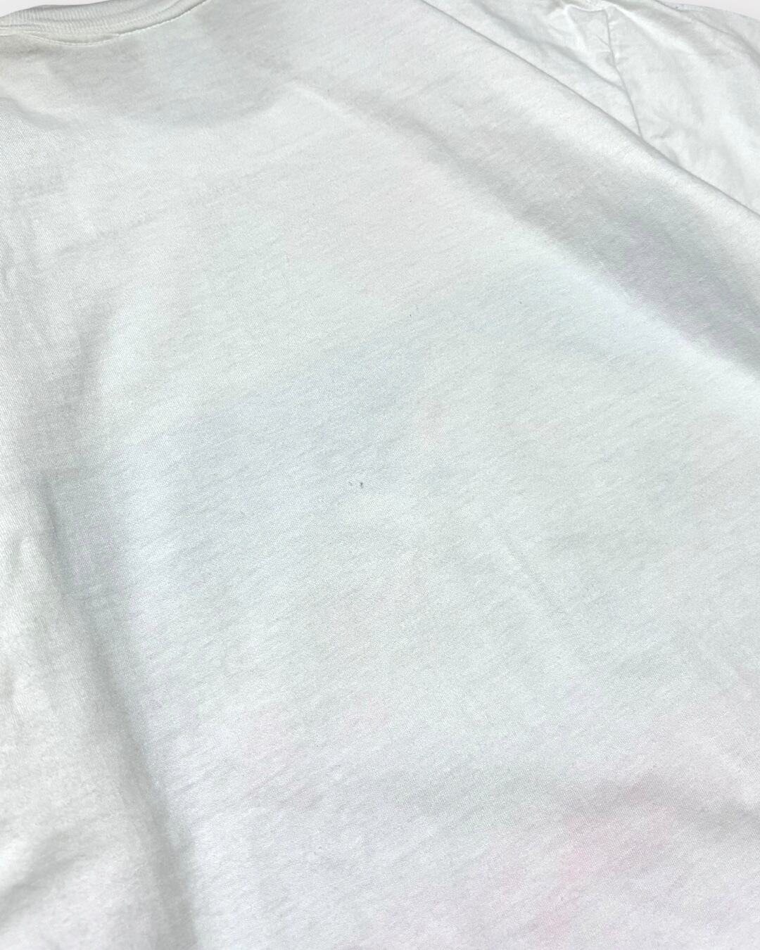 背面中央付近に小穴、さらに薄い色移りや袖の黒ずみなどが見られますが、ヴィンテージらしい経年変化としてご理解いただける範囲です。コレクタブルなご当地Tシャツの中でも、爽やかで遊び心のあるグラフィックが魅力の一着です。