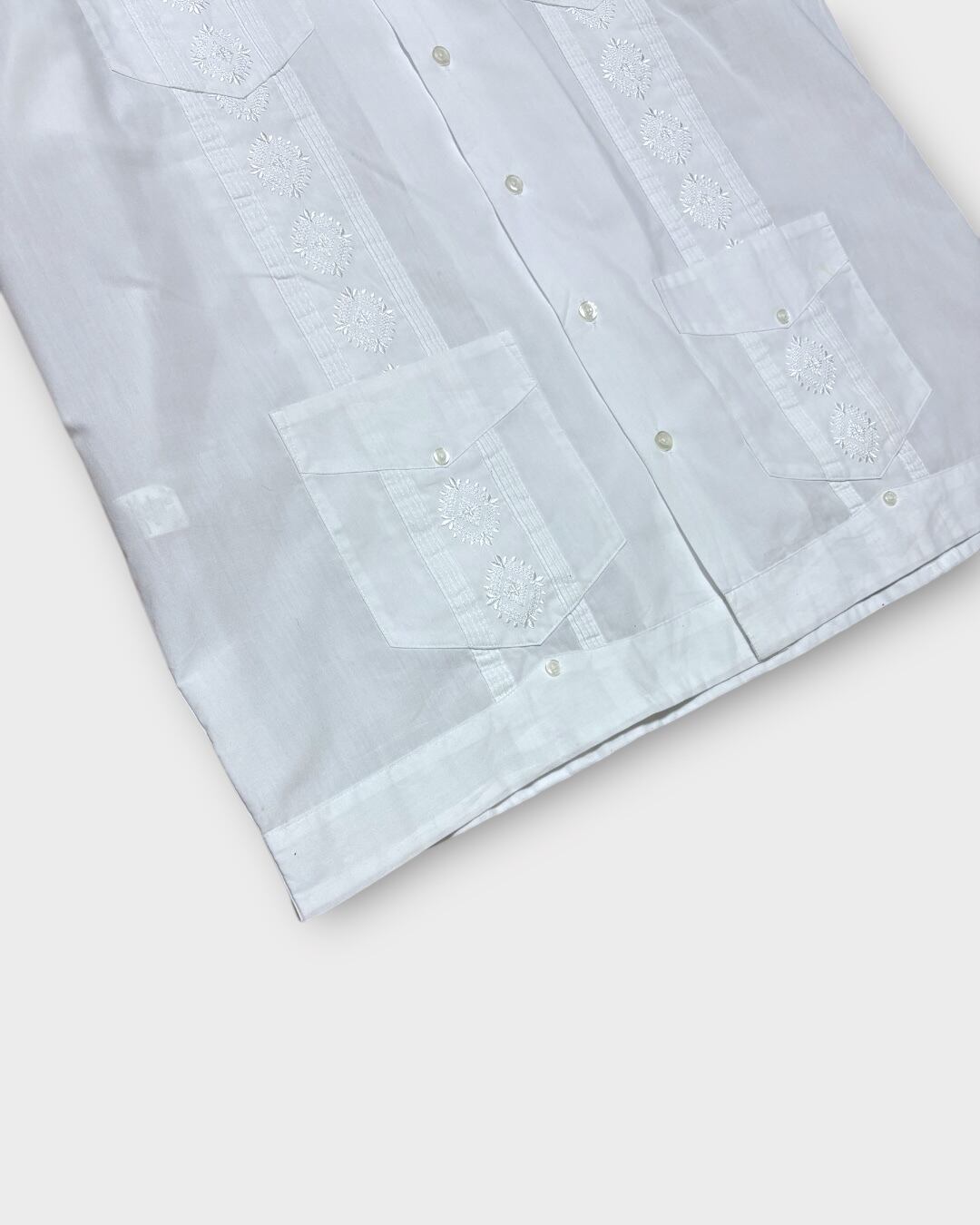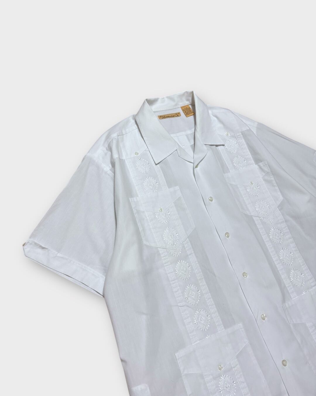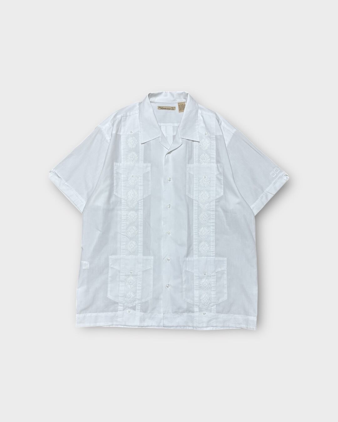 夏の定番、キューバシャツスタイルの刺繍シャツ。前面に4ポケット+ピンタック+フローラル刺繍が並び、シンプルながらも細やかな装飾が美しい一枚です。