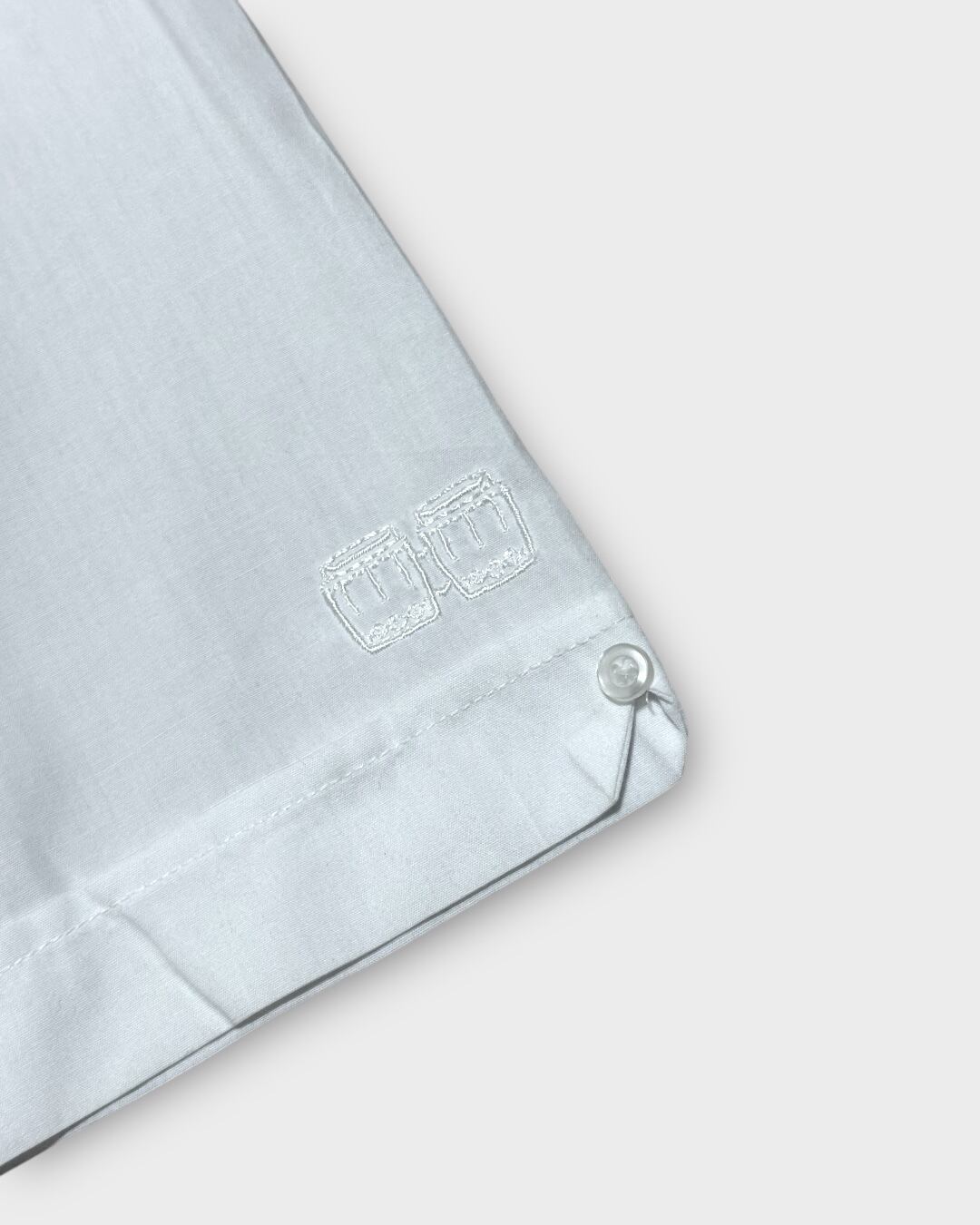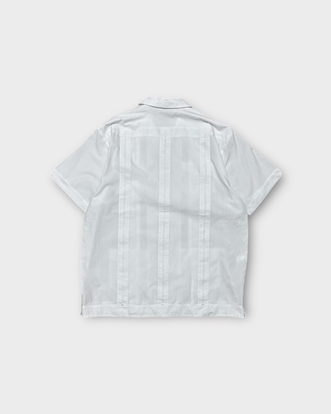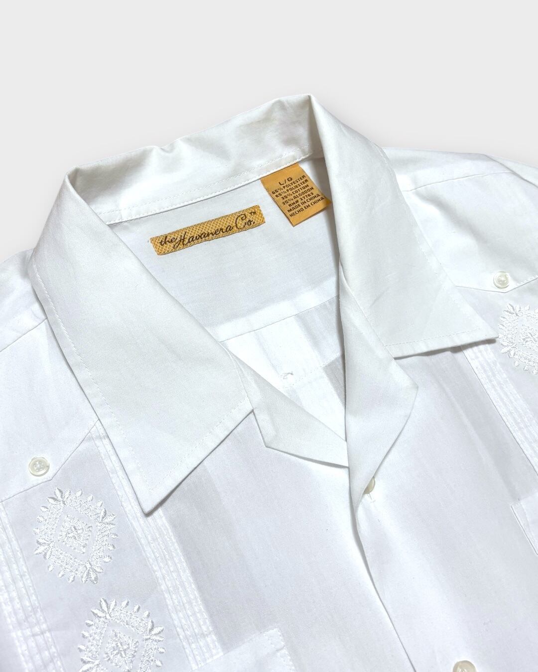 夏の定番、キューバシャツスタイルの刺繍シャツ。前面に4ポケット+ピンタック+フローラル刺繍が並び、シンプルながらも細やかな装飾が美しい一枚です。